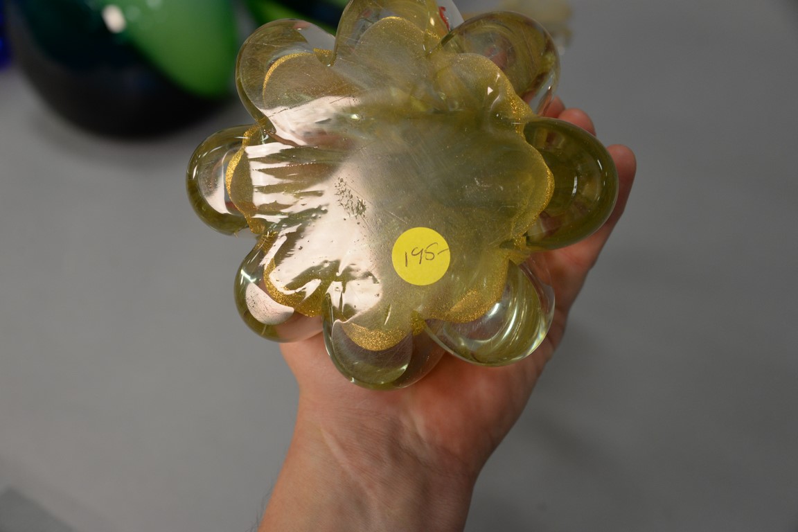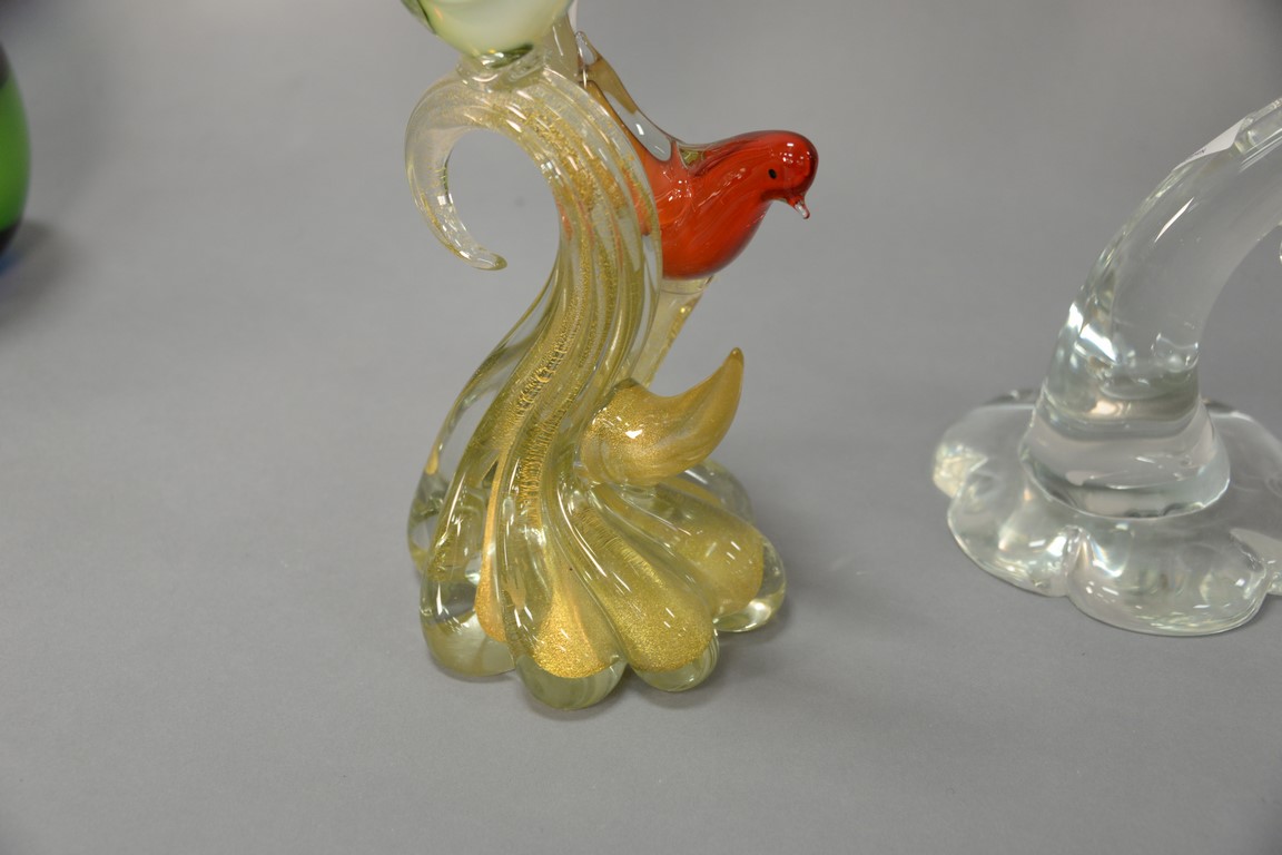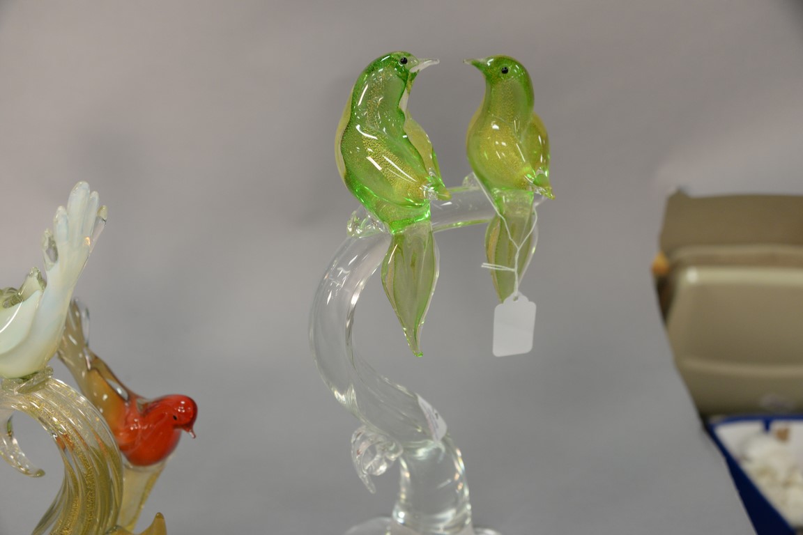 Lot 14: Two Murano Venetian art glass double bird figures, one having two gold and green birds perched on a branch and the other with gold s…