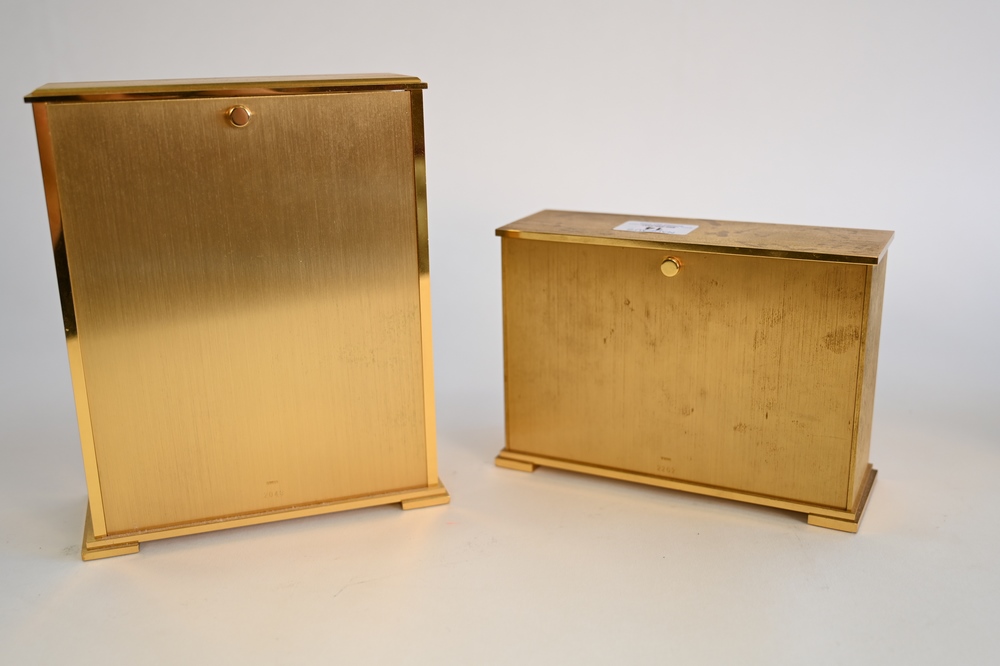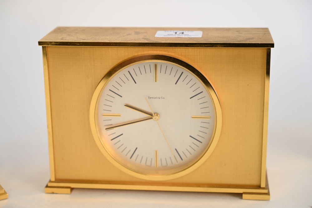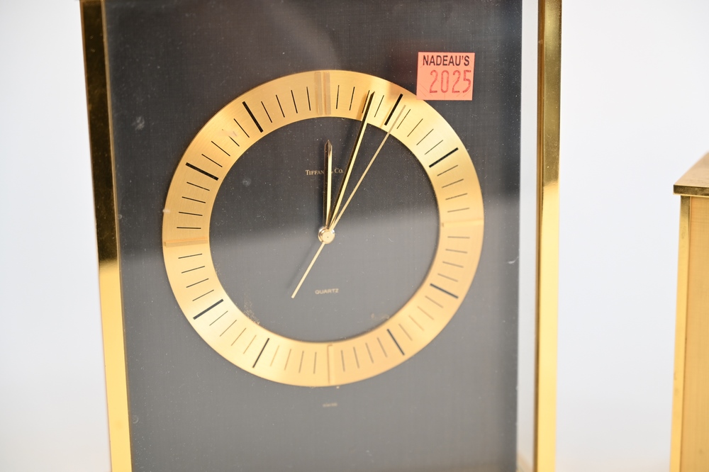 Lot 14: Two Tiffany and Company Desk Clocks, to include brass quartz clock, model number 2048, along with a rectangular desk clock 2202, quartz height 8 inches, width 6 1/2 inches, depth 2 3/4 inches. desk clock height 5 1/4, width 7 1/4 inches, depth 2 1/2 inches. Provenance: Waterfront Estate, Stamford, CT.