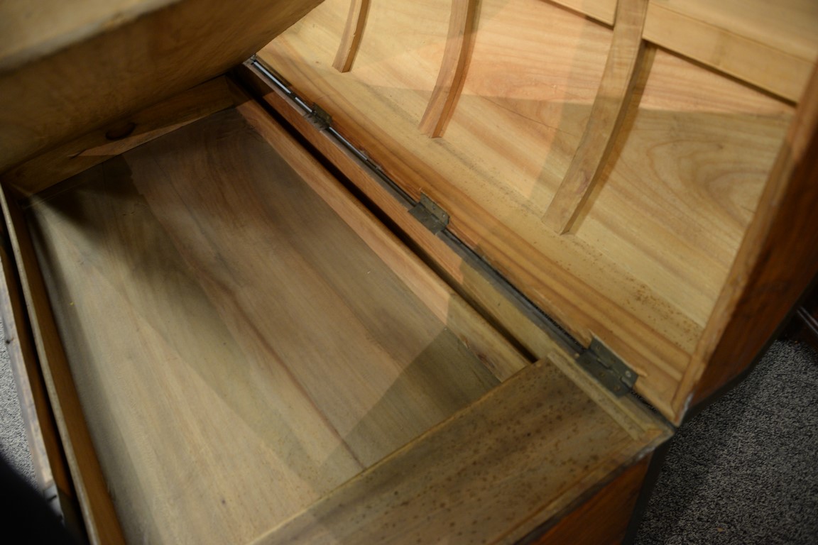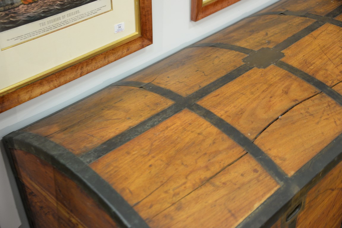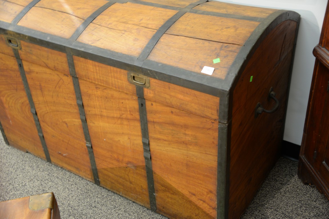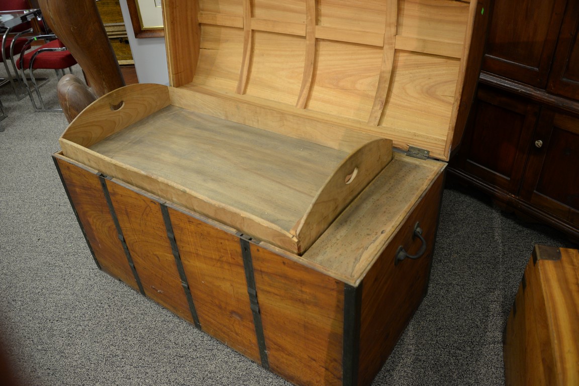 Lot 140: Camphorwood brass bound chest having domed top with large brass handles, interior with two camphorwood trays and one till, 19th cent…