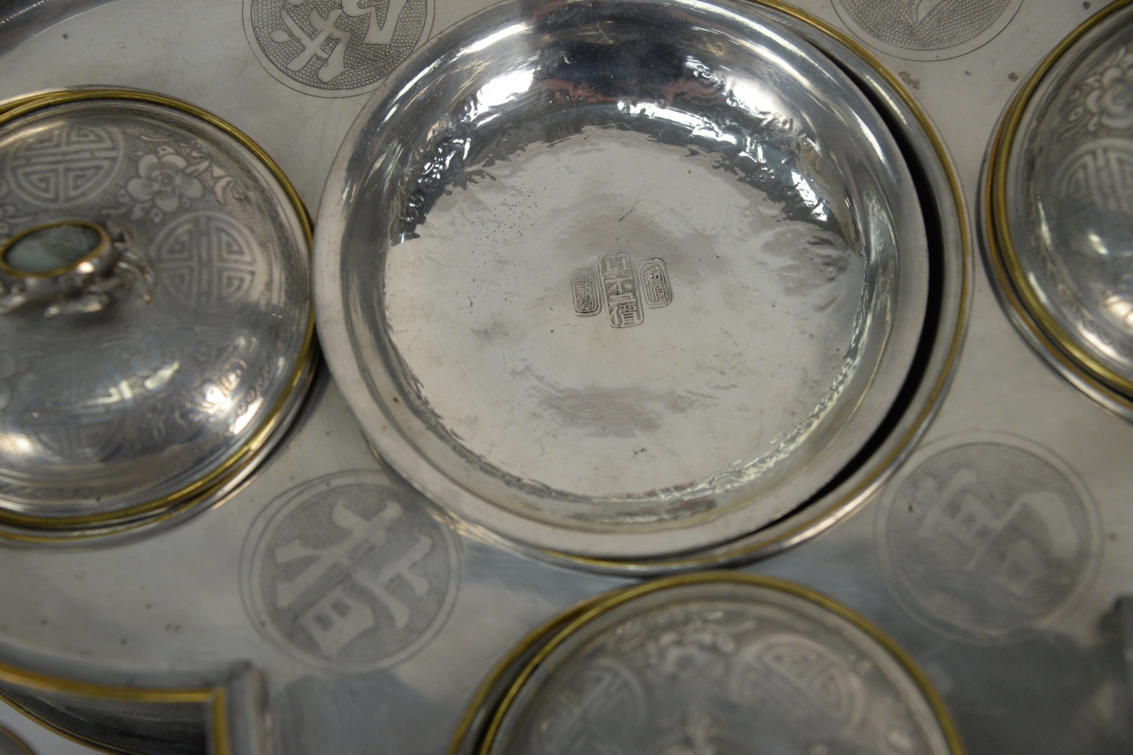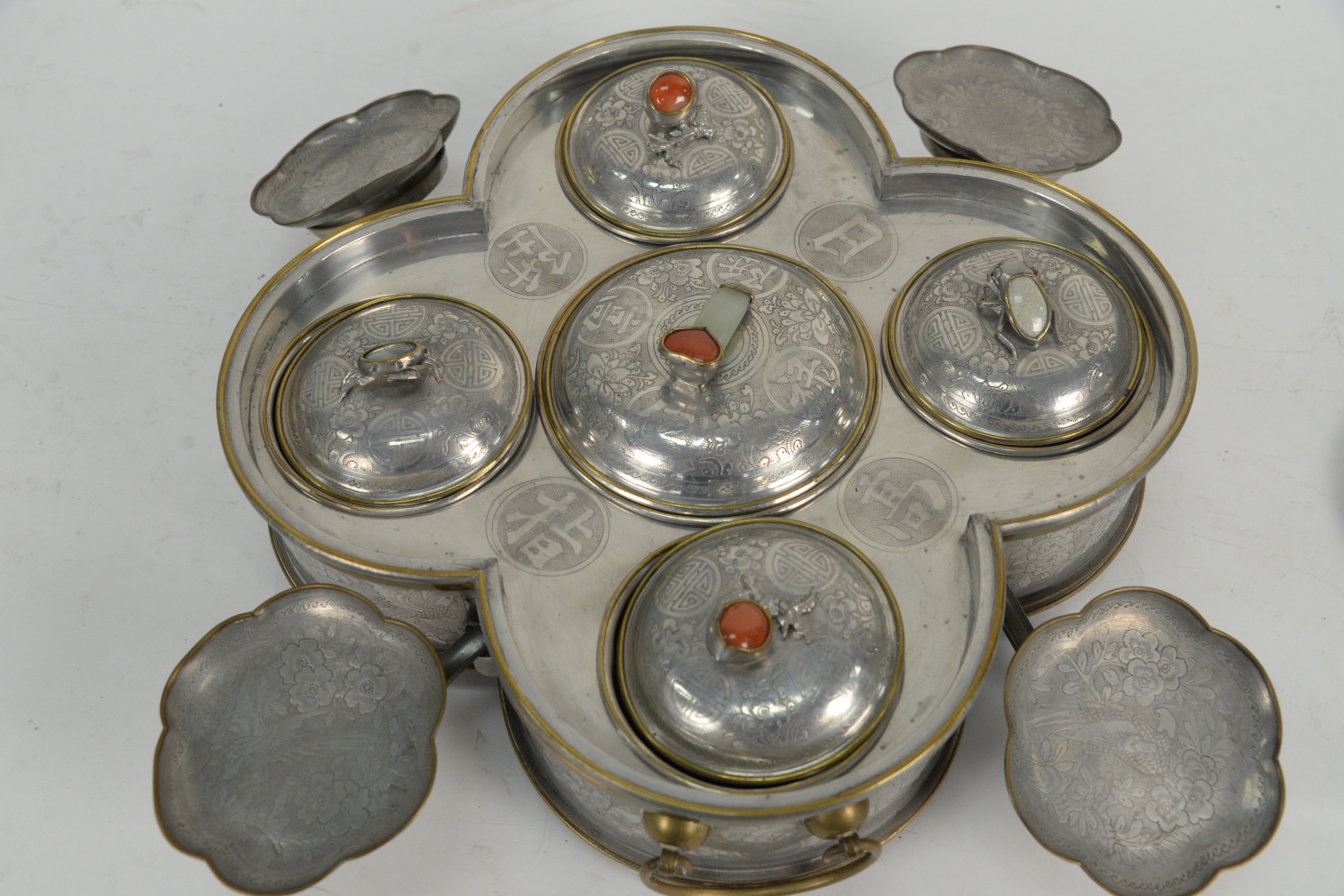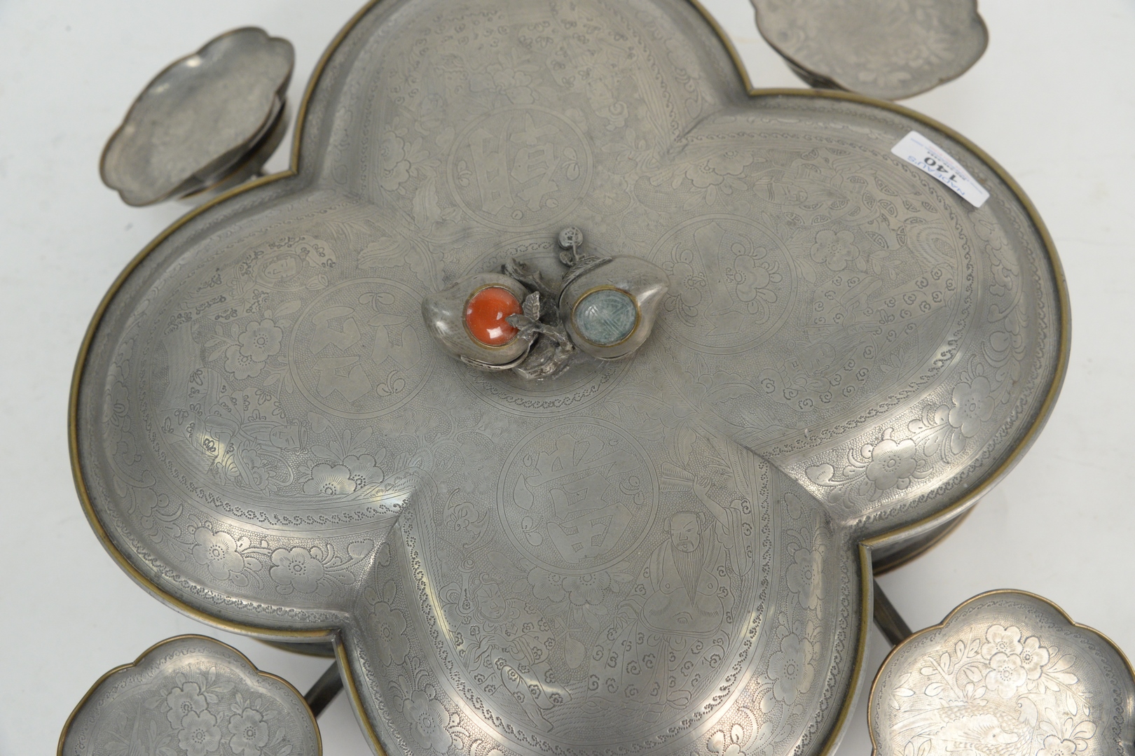 Chinese Pewter Hot Water Serving Center Dish having chased lotus blossoms, scroll work, and decorated with brass trim, four leaf clover form with hardstone fruit form knop, opening to 5 compartments with similar knops, exterior attached with shaped condiment dishes, all marked with Chinese characters, height 6 inches, diameter 20 inches.