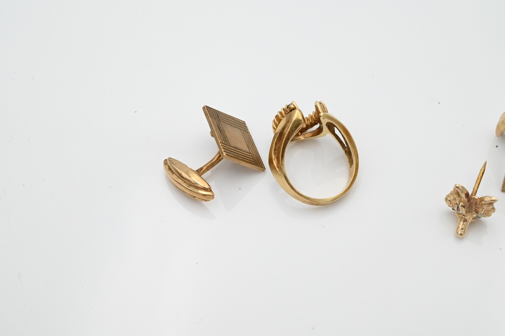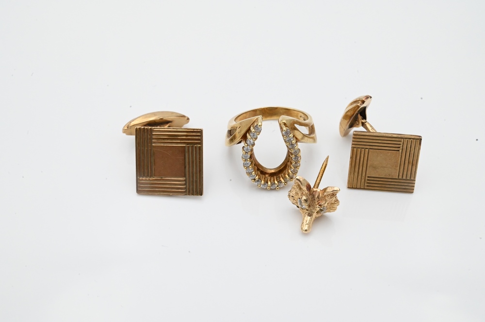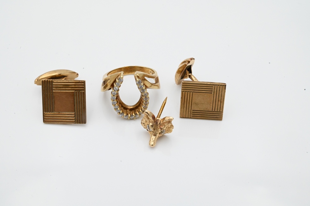 Four Piece Lot, to include a 14 karat gold and diamond horseshoe; 14 karat fox tie tack with diamond eyes (no backing); along with a pair of 10 karat gold cufflinks; 9.5 grams of 10 karat, 9.7 grams of 14 karat, total weight 19.2 grams.