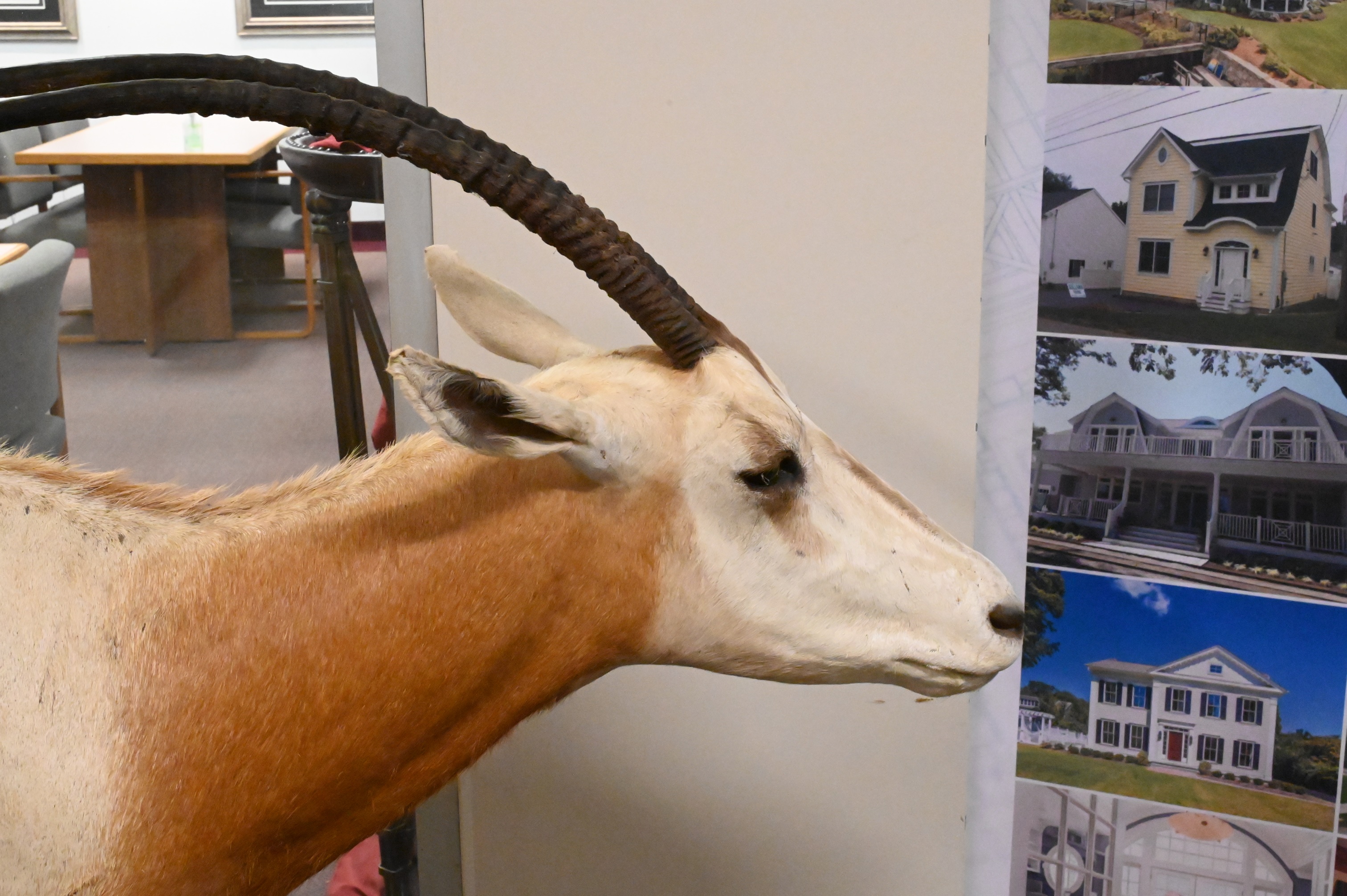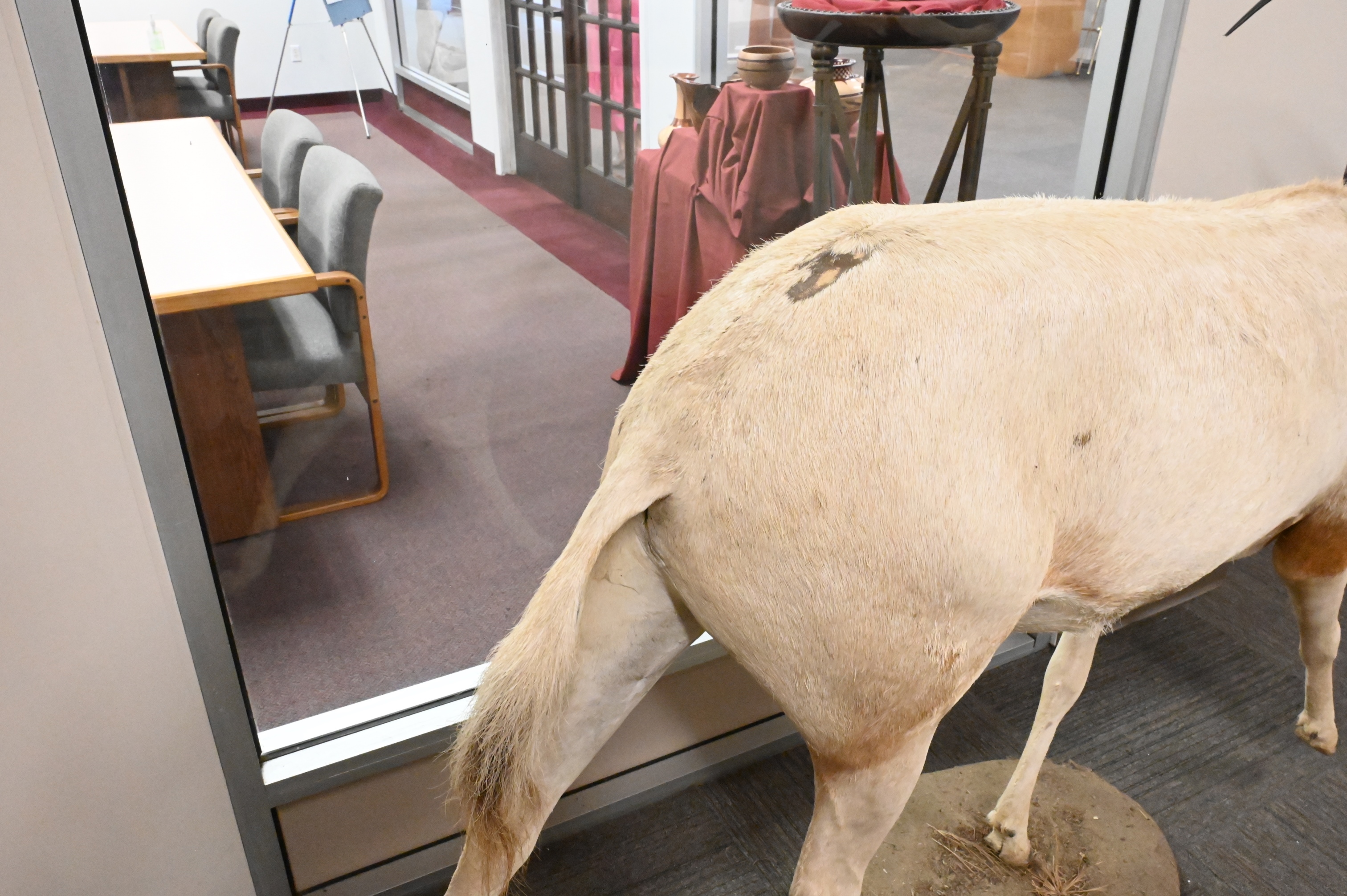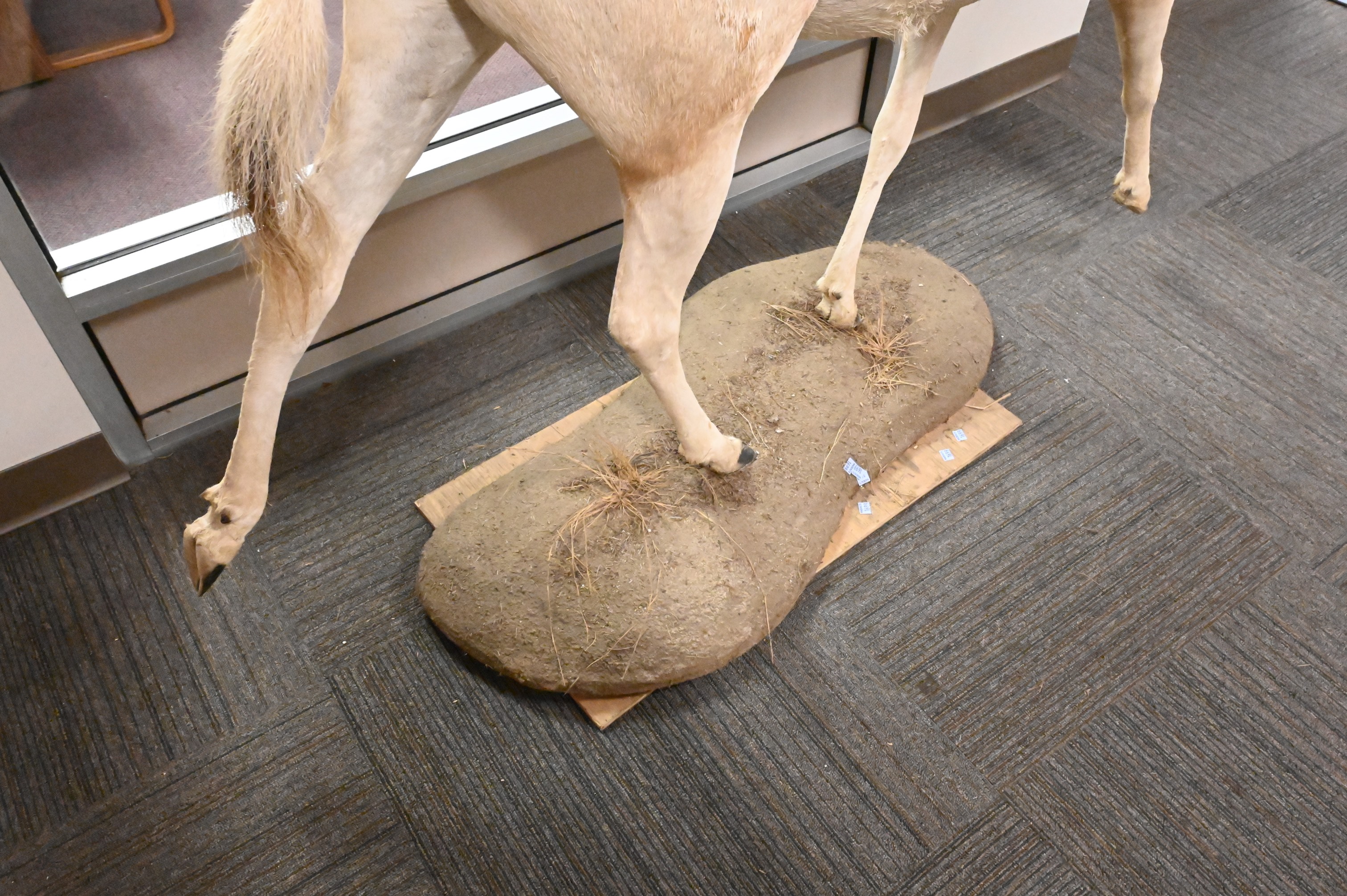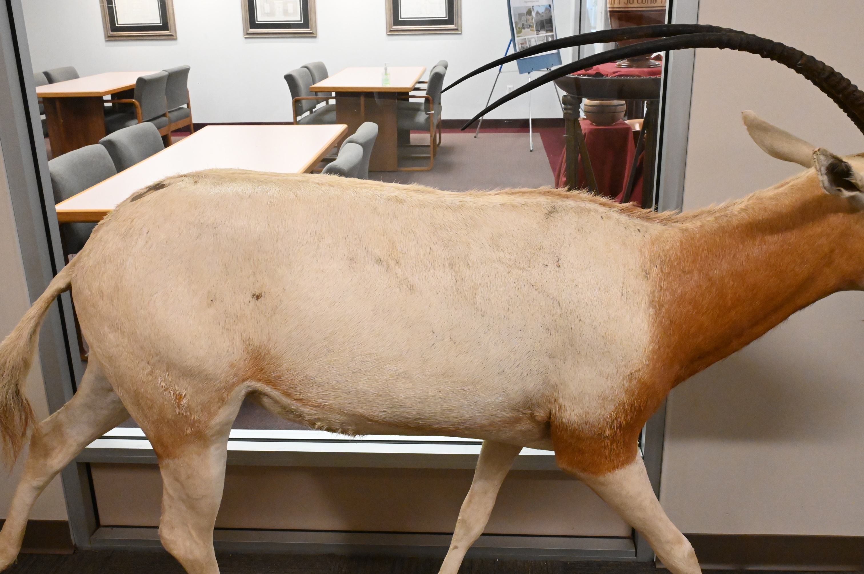 Scimitar Oryx Full Body Taxidermy Figure, set on faux base, extinct in the wild since 2000, native of North Africa, *This piece is endangered and can only be sold to state of Connecticut residents, approximate dimensions are a height of 68 inches, length 62 inches, width 20 inches.