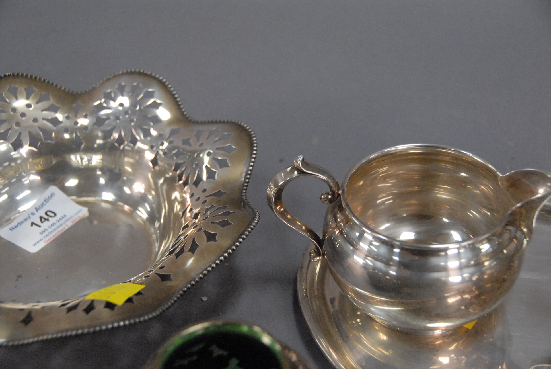 Lot 140: Group of five pieces of sterling to include creamer and sugar, small oval tray, bowl, and a green glass vase with silver overlay, 15…