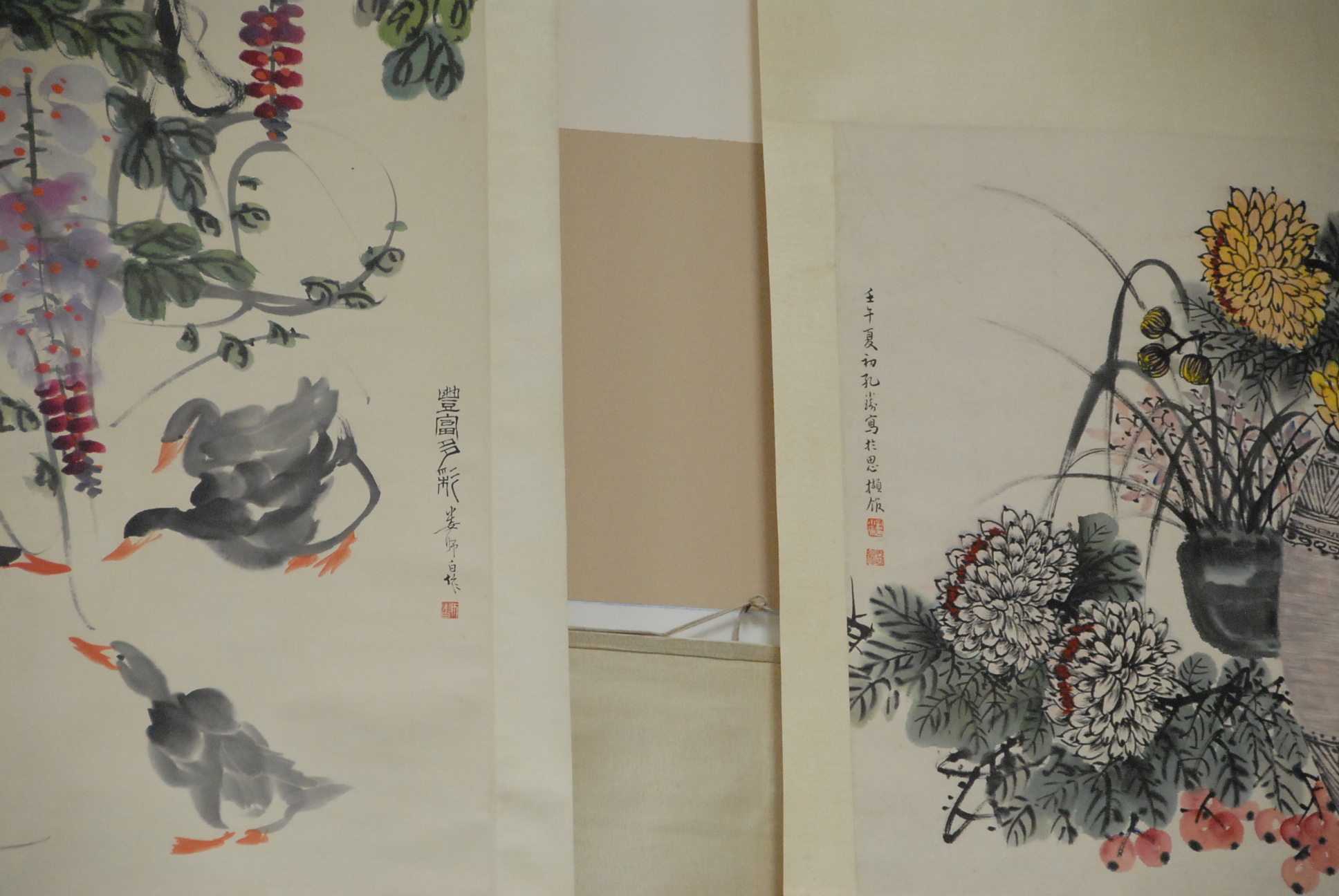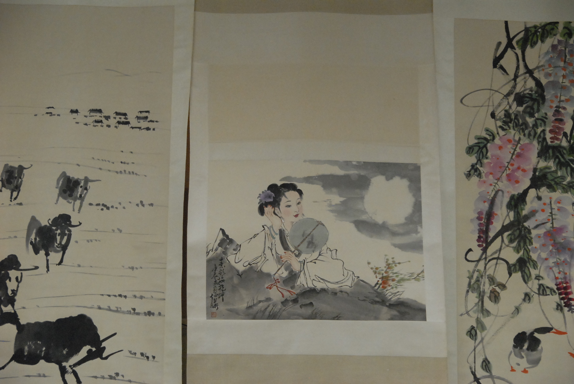 Group of oriental watercolor scrolls on paper, still life of potted flowers, ducks with wild flowers, seated guanyin, black and white of four bulls.