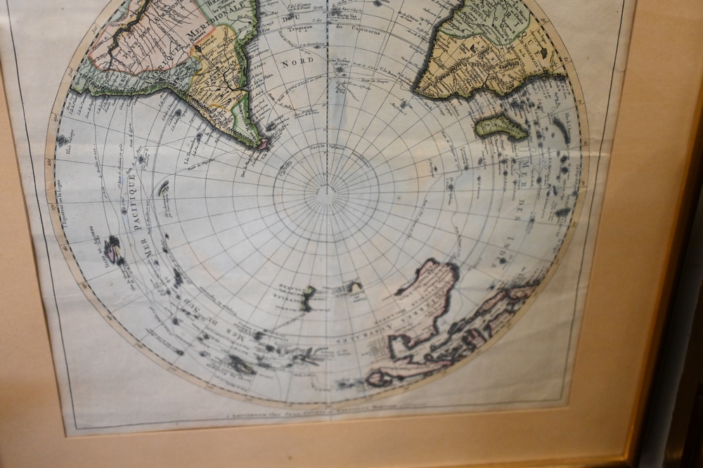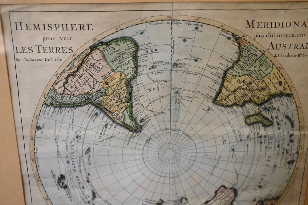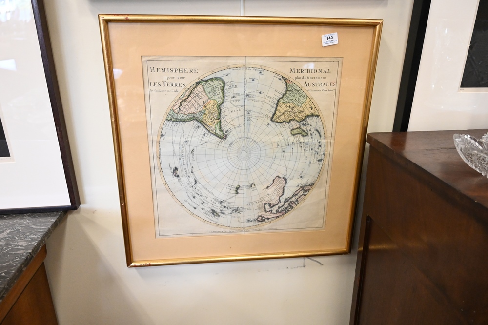 Lot 140: Guillaume de L’Isle, “Hemisphere Meridional” engraving on paper with hand coloring of South America, Africa, and Australia from the south pole, sight size 19″ x 18 1/2″.