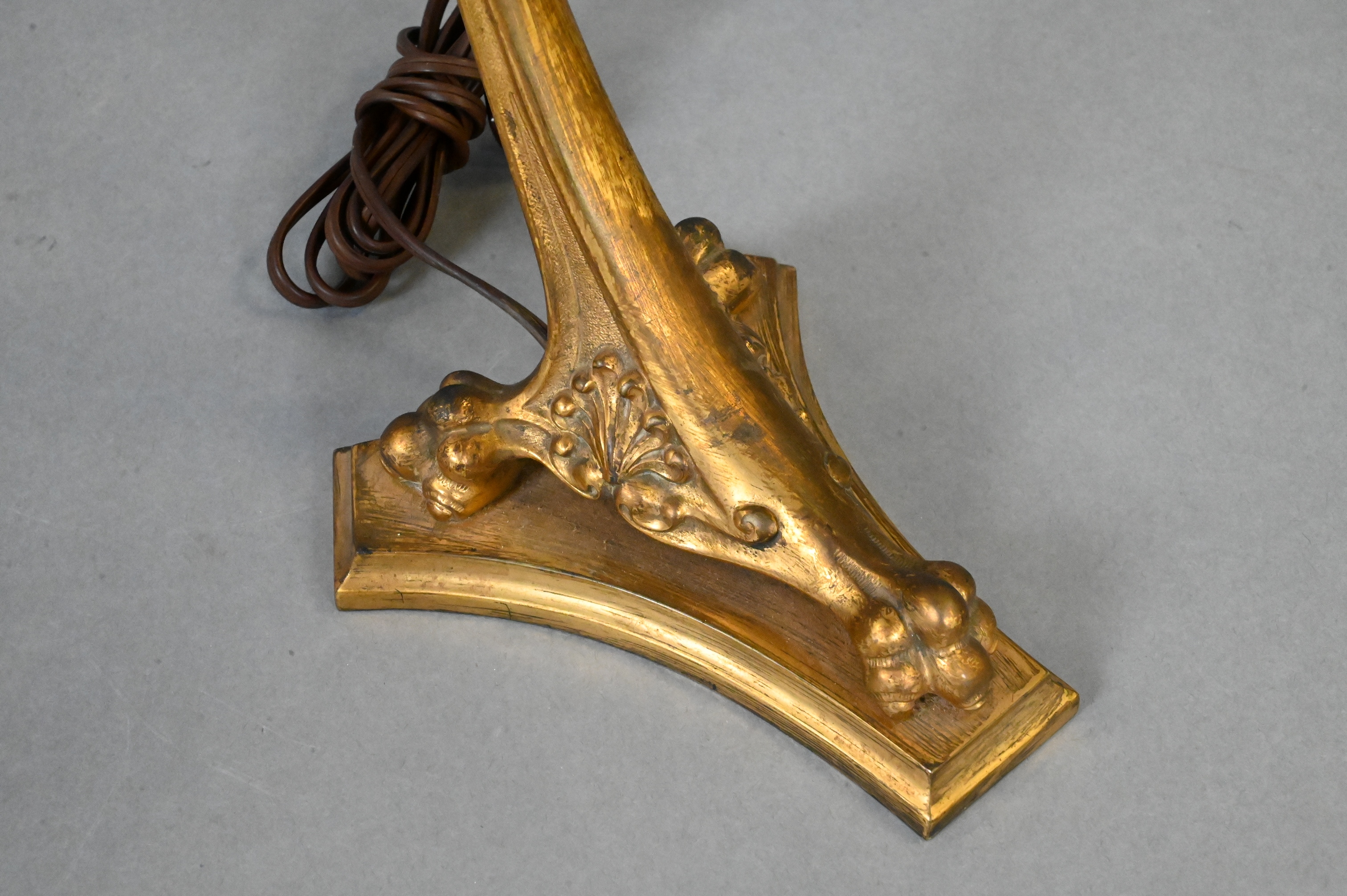 having slag glass shade set on bronze base ending in three claw feet set on base marked Handel to underside, decoration missing to one side