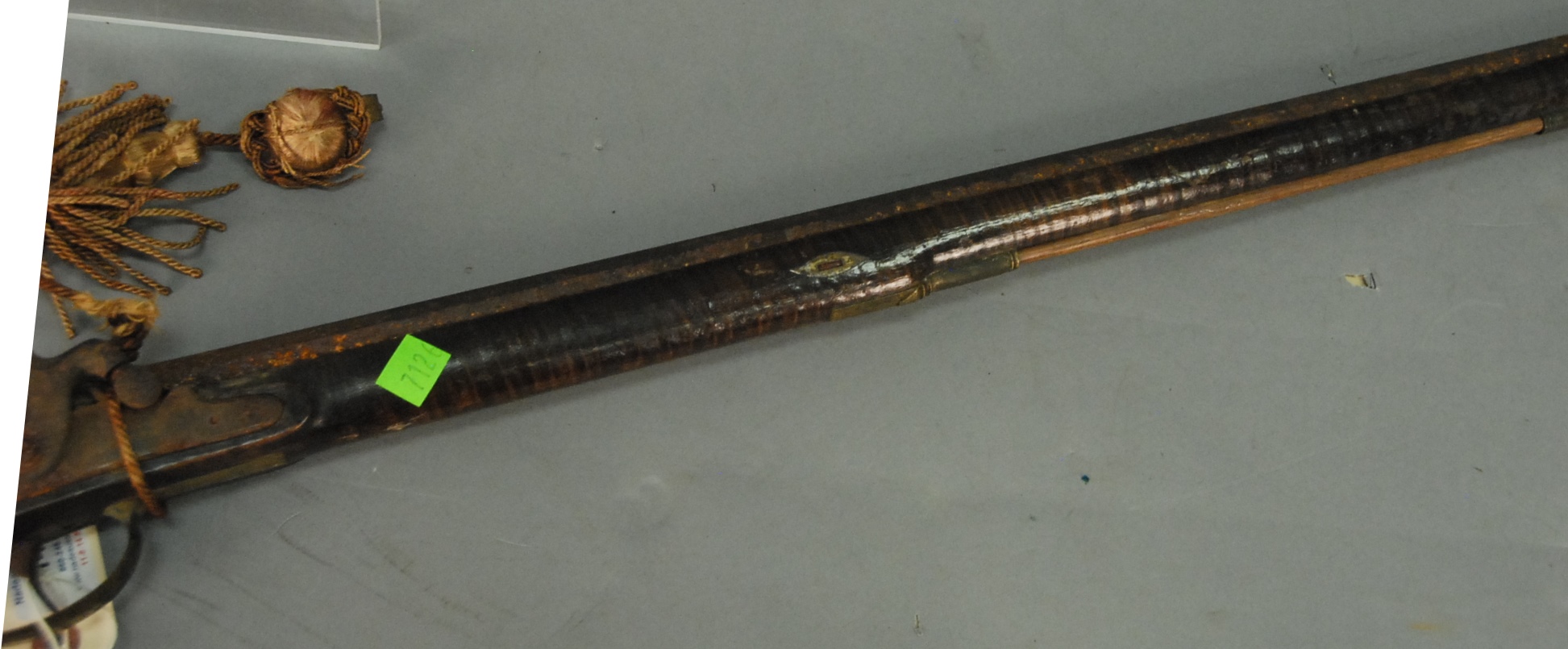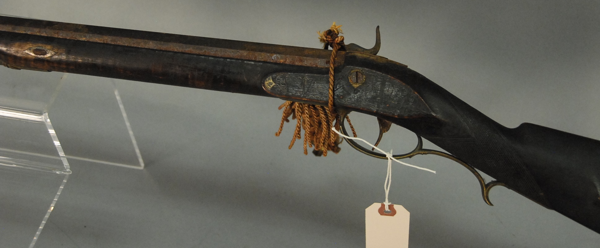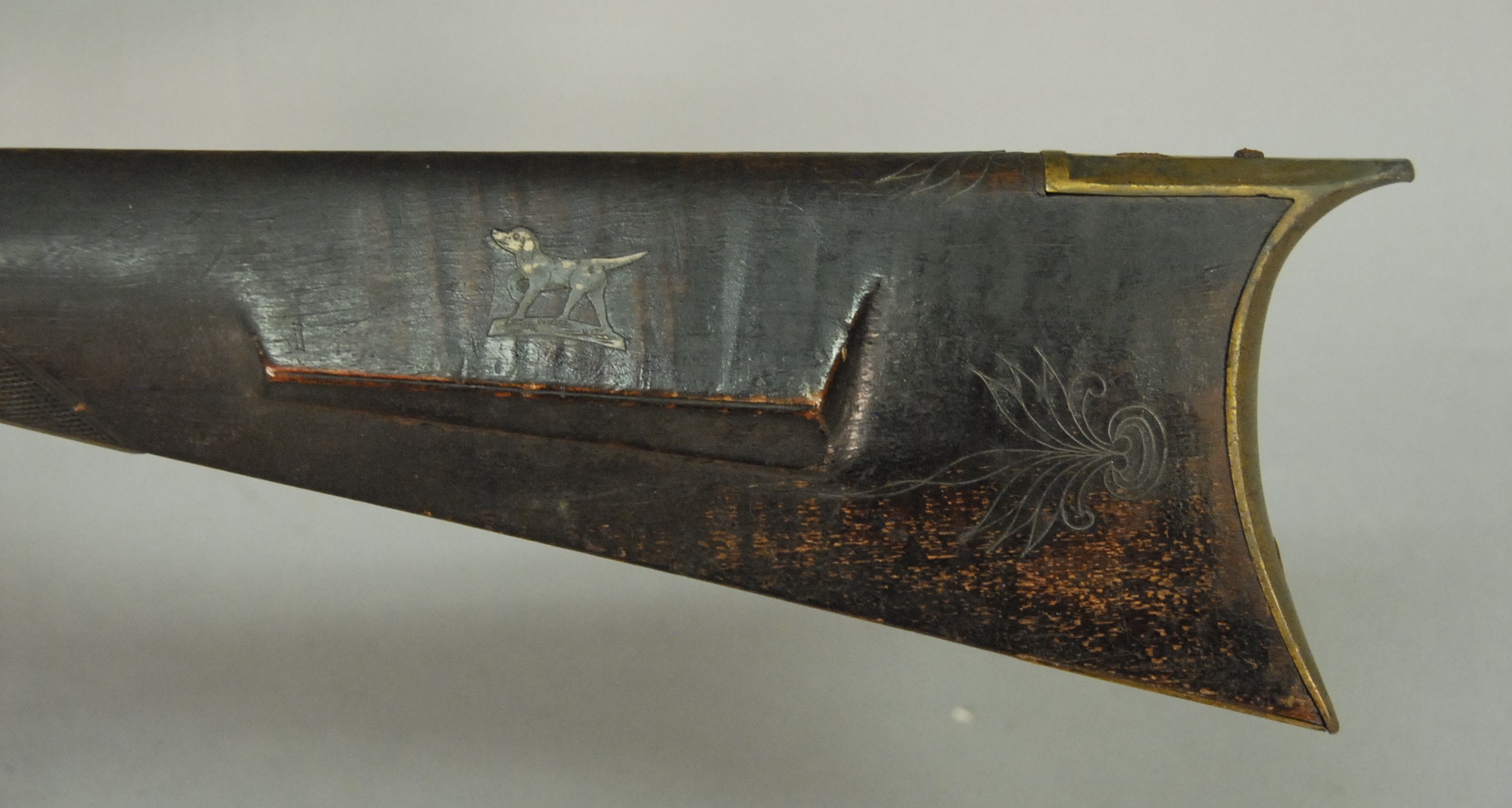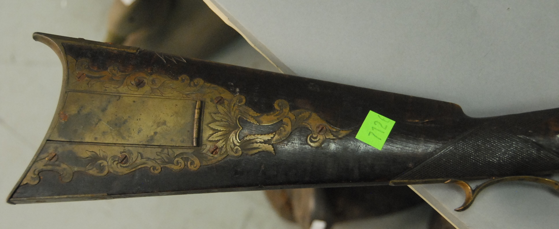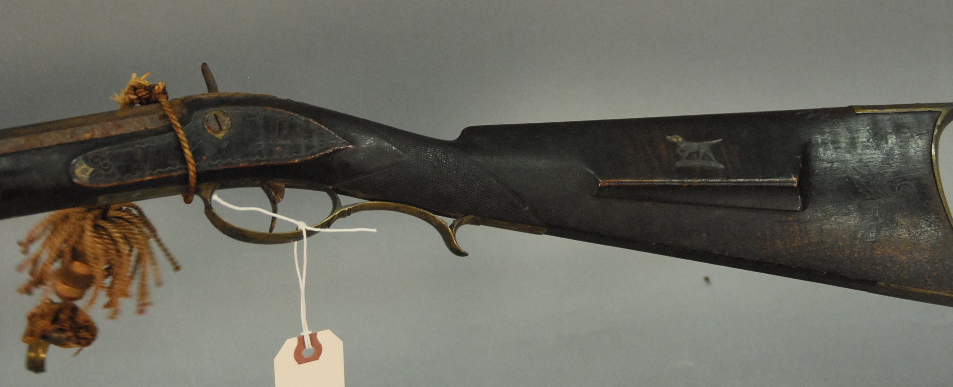 Lot 140: Kentucky Percussion long rifle by J. Cooper 1820-1850 with brass patch box and trigger guard.