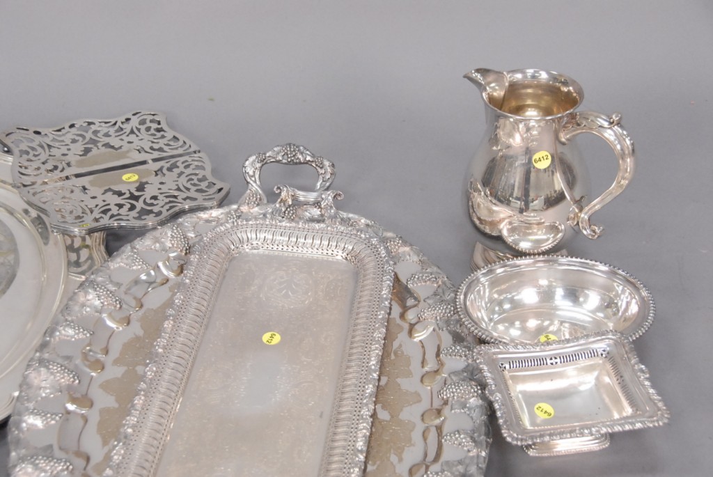 Large grouping of silverplated items three trays, two reticulated dishes, two covered dishes, pitcher, and various other items.