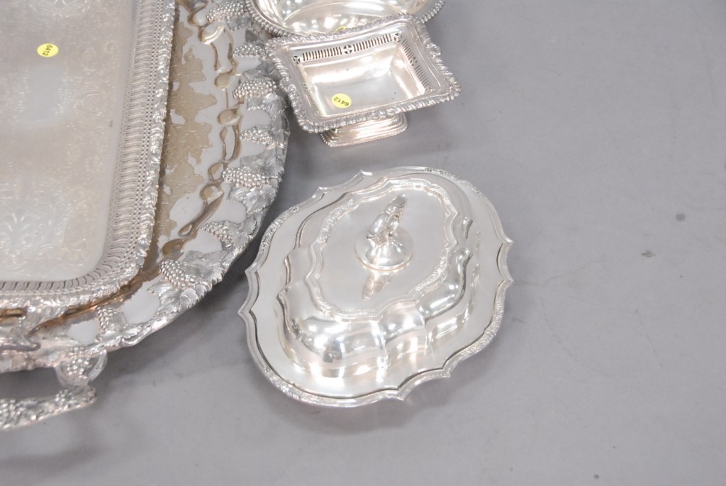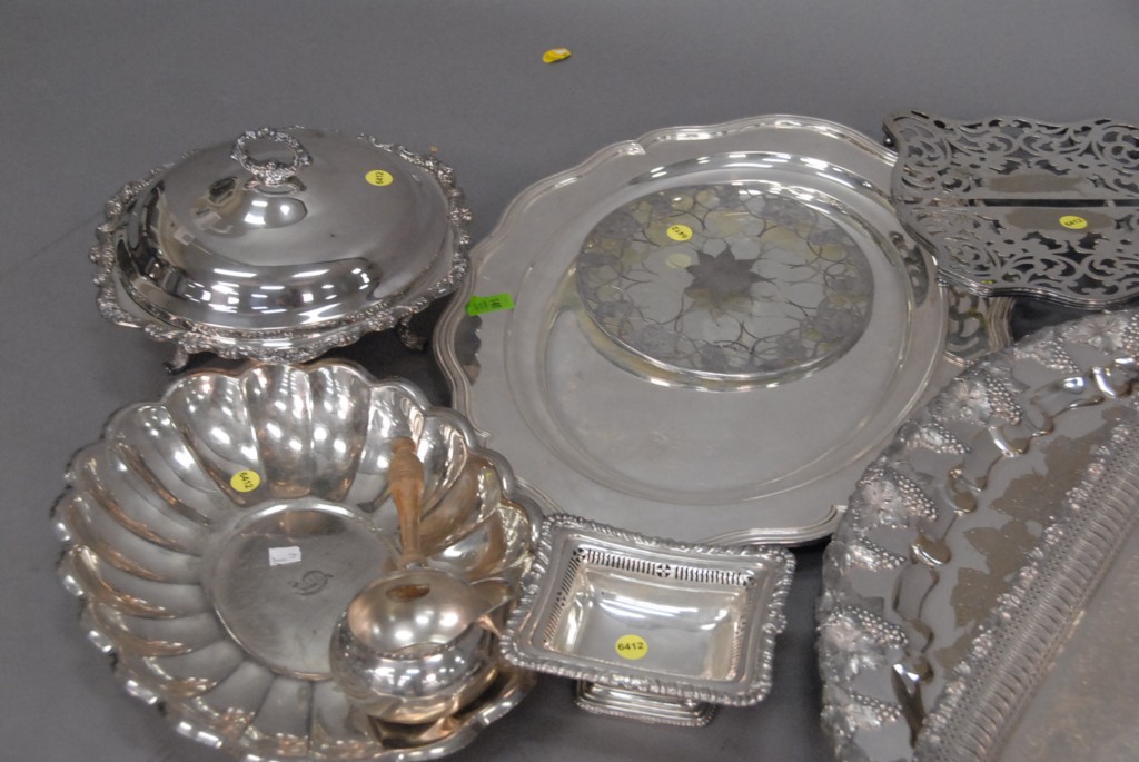 Lot 140: Large grouping of silverplated items three trays, two reticulated dishes, two covered dishes, pitcher, and various other items.