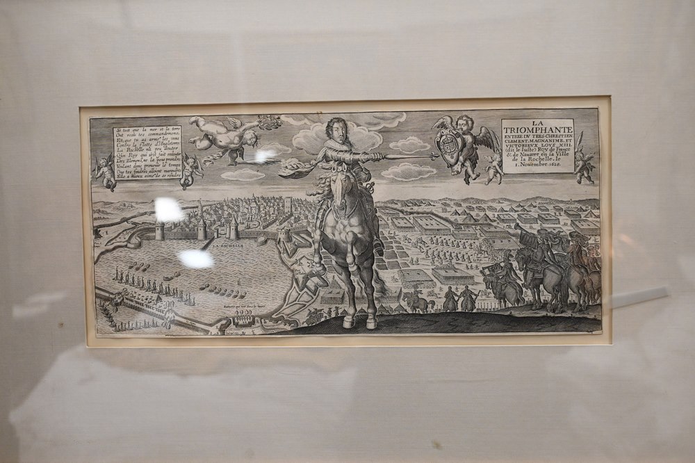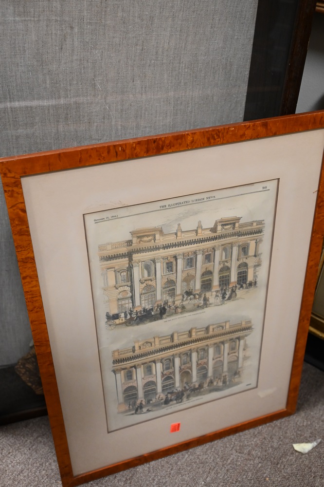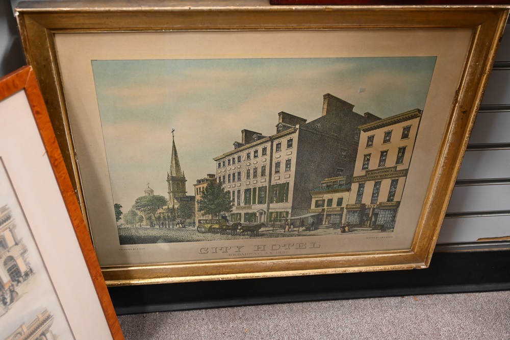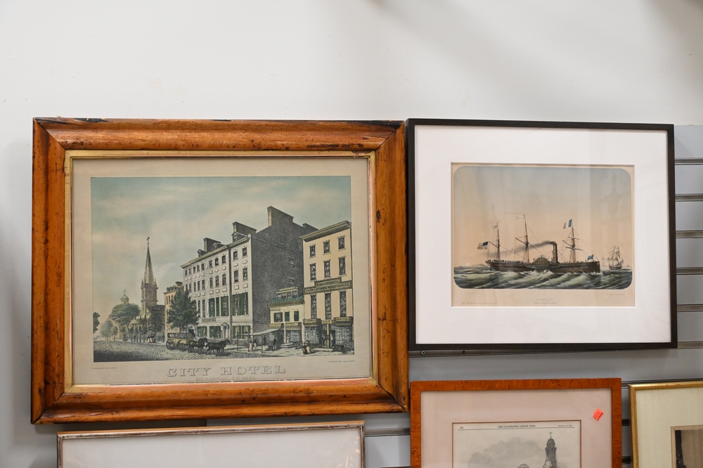 Lot 140: Large Lot of Items, to include group of 13 framed pieces, to include an Indonesian puppet; James Gulick Chief Engineer of the New York Fire Department, print, 14 x 10 inches; French Louis XIII, King of France, 13 3/4 x 15 1/2 inches; Peter Marcus (1889 – 1934) Federal Hall, etching, 13 1/2 x 7 1/4 inches; 2 City Hotel, Broadway, New York, 1920, etchings, approximately 17 1/2 x 23 inches; Anstice, Wall Street, 1900, engraving, 8 1/4 x 10 1/4 inches; view in Wall Street From Corner of Broad Street, 1848, engraving, 3 framed Harper’s Weekly; along with “Le Humboldt, Paquebot de New York-au-Havre”, circa 1851, printed by Turgis, lithograph with hand coloring on paper, sight size 9 1/2″ x 14 1/2″; along with group of iron American farming implements, to include three branding tools, a bridle, stirrup, spurs, along with a saddle horn.