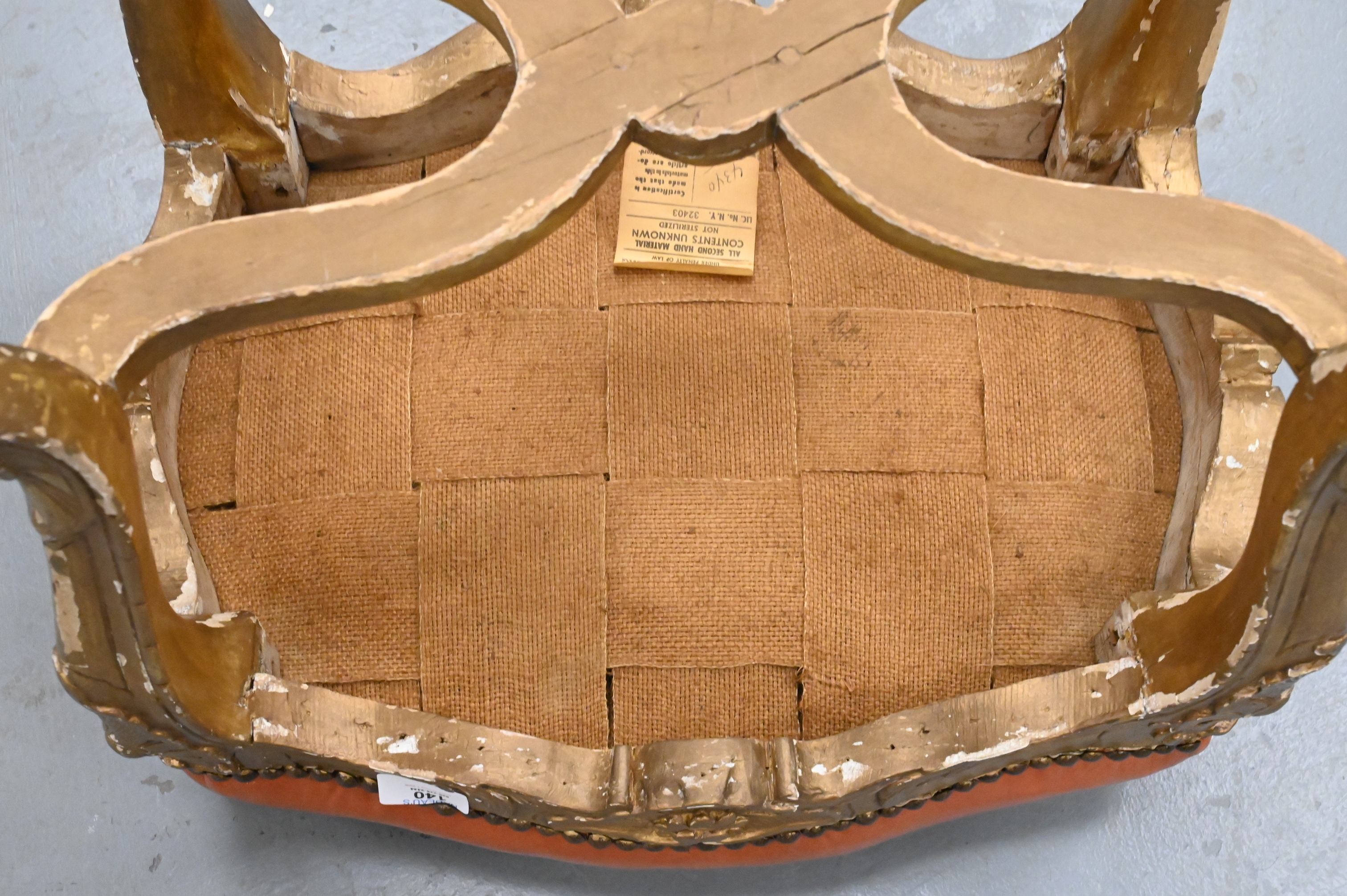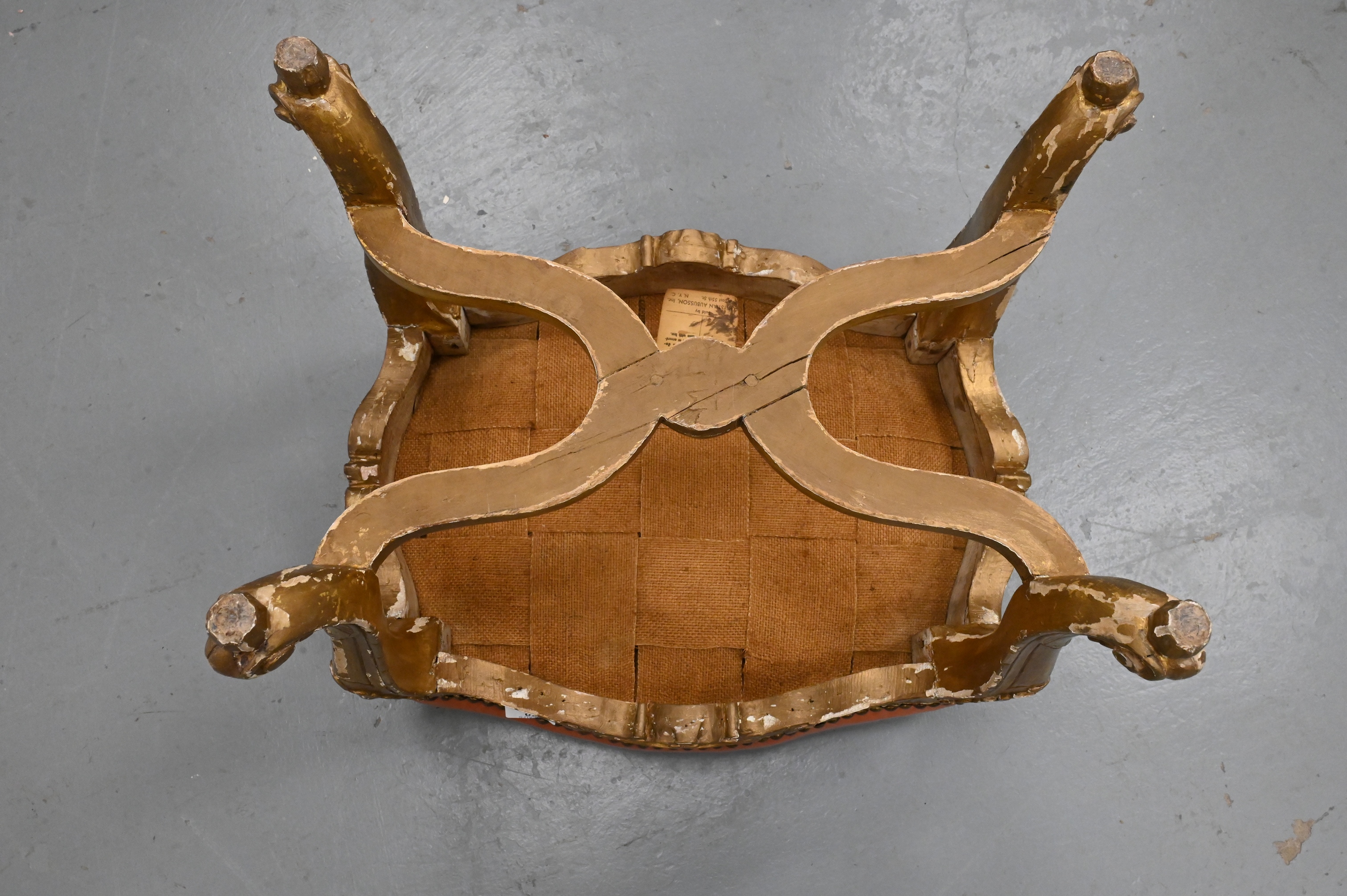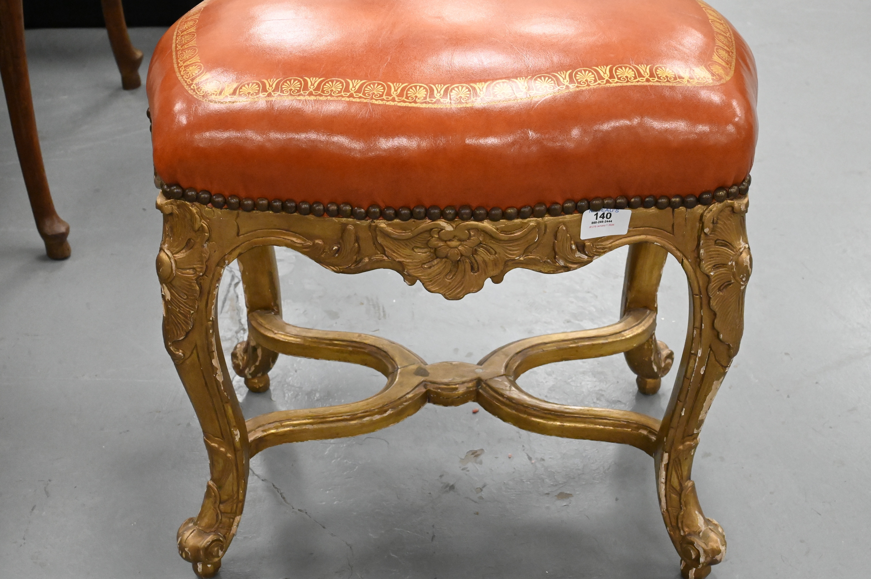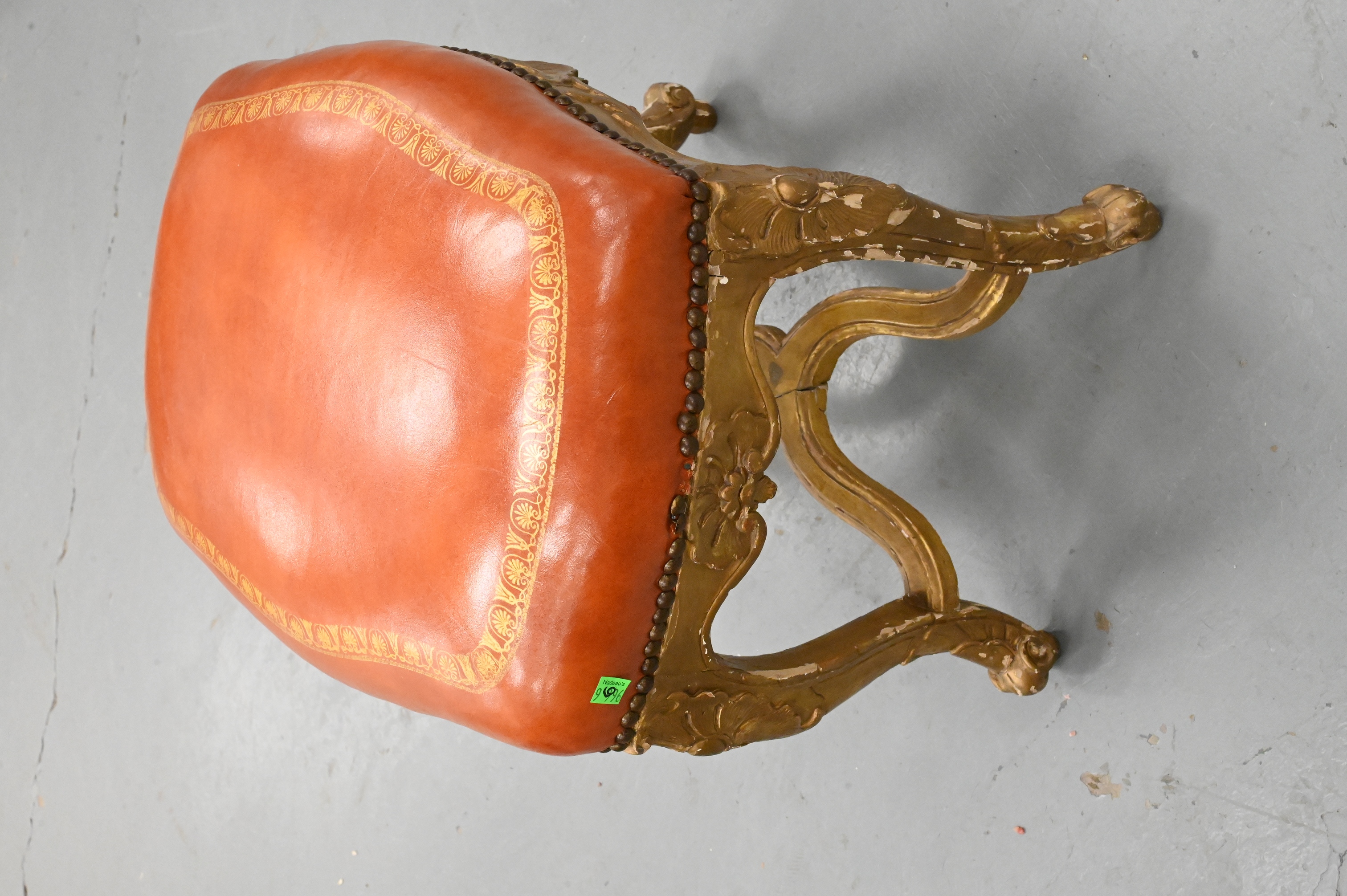 shaped padded seat upholstered in tooled tan leather above a richly carved giltwood frame with floral sprays, acanthus, and shell motifs. Raised on cabriole legs joined by an X-form stretcher and ending in scroll feet