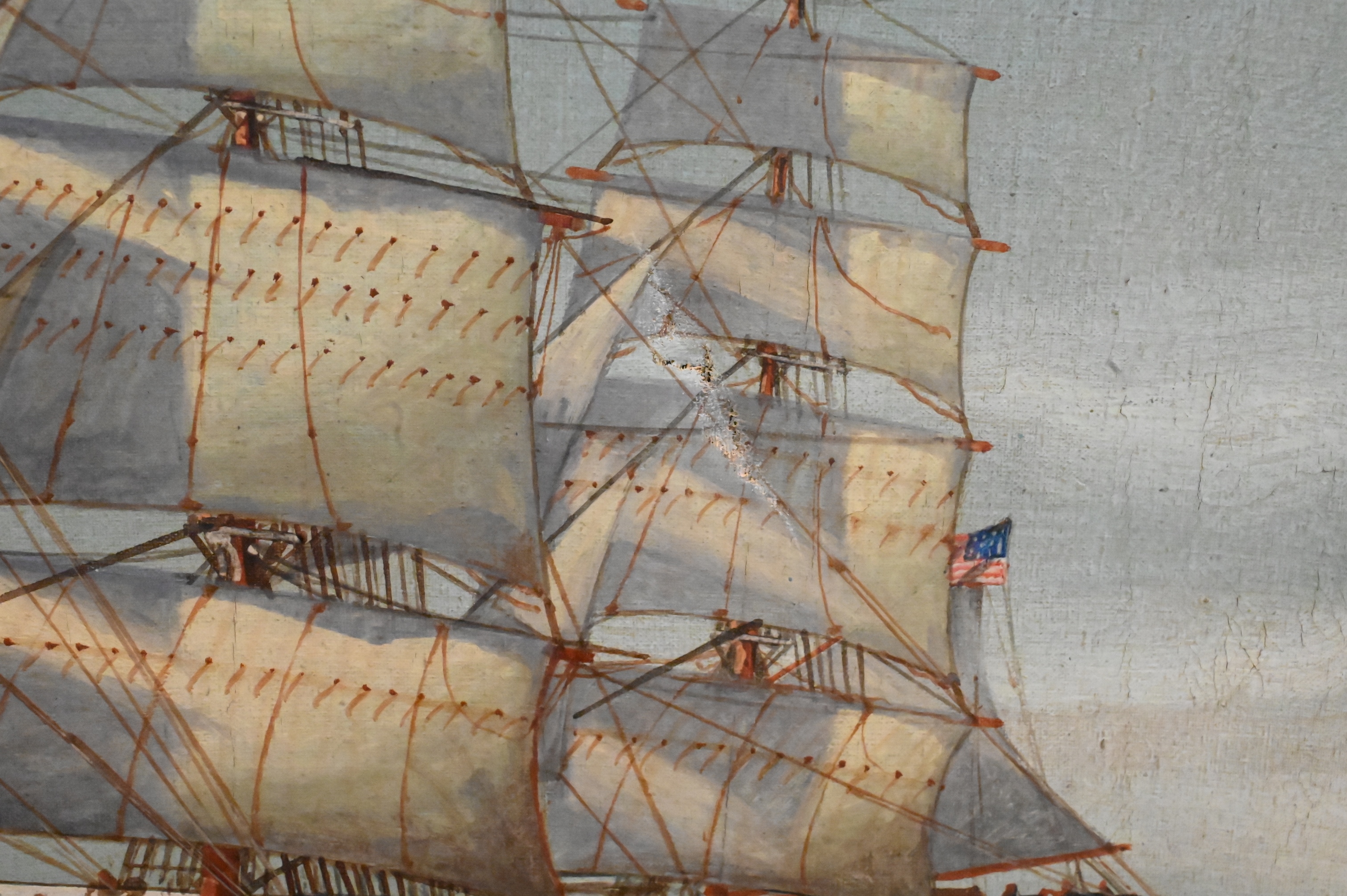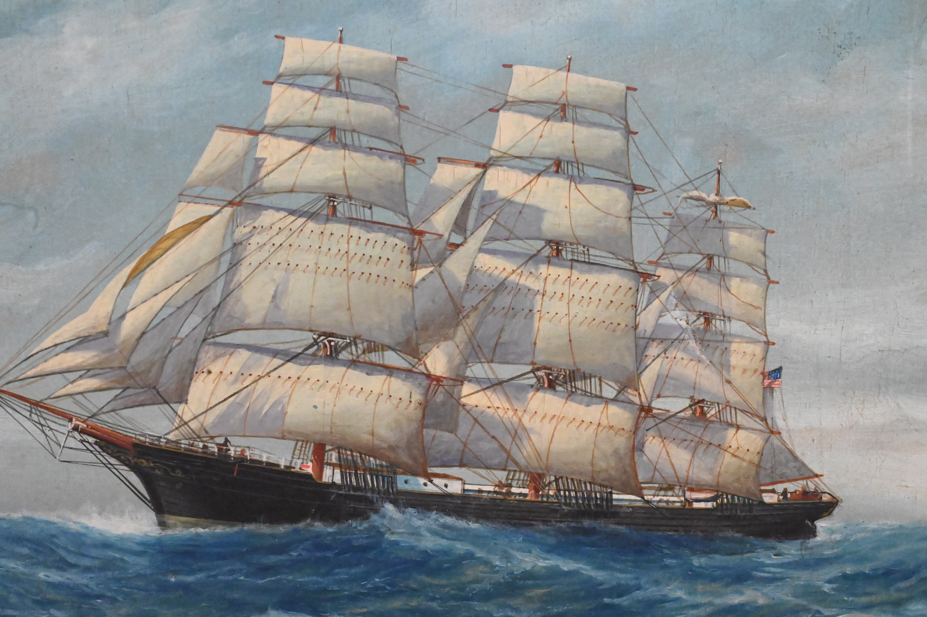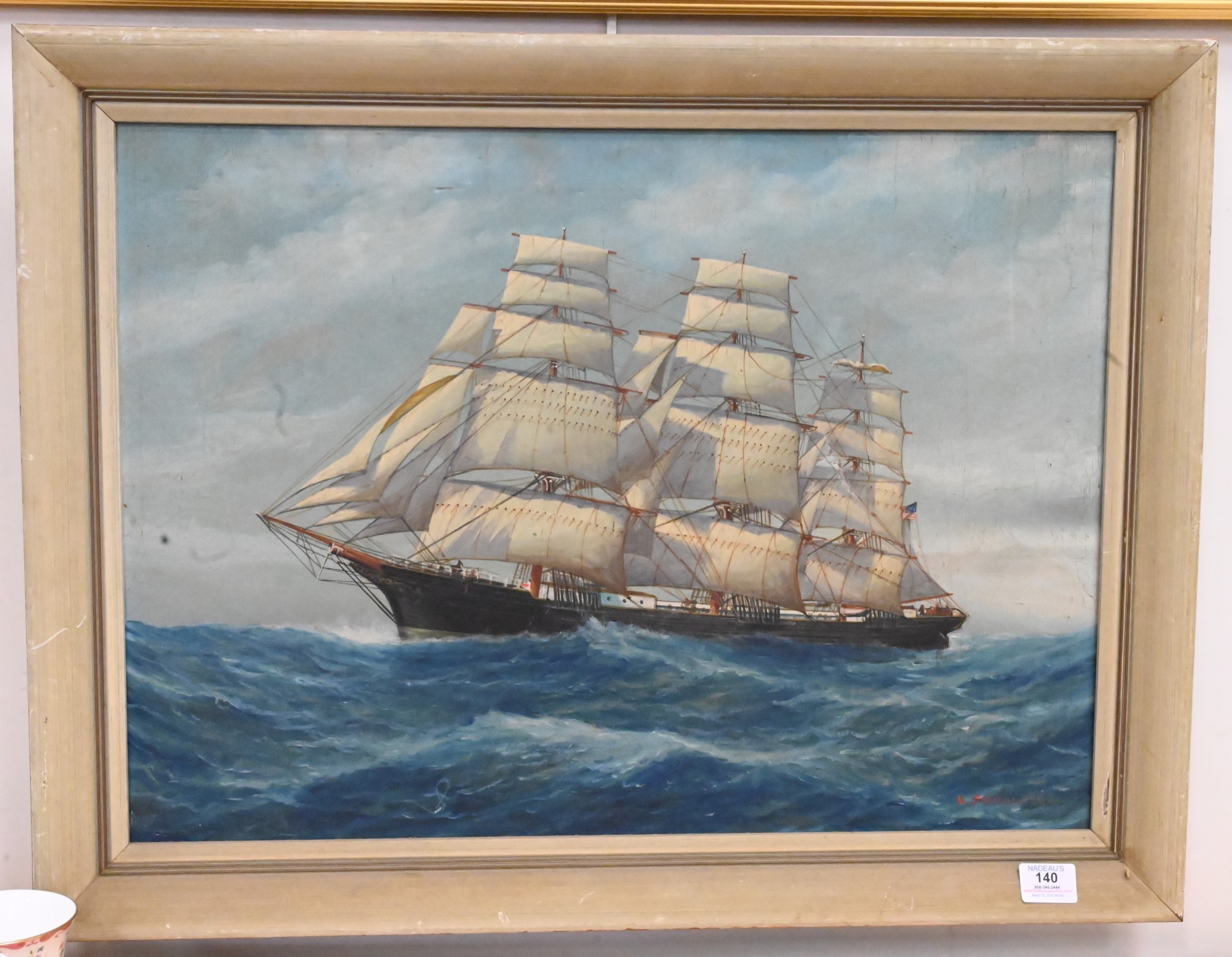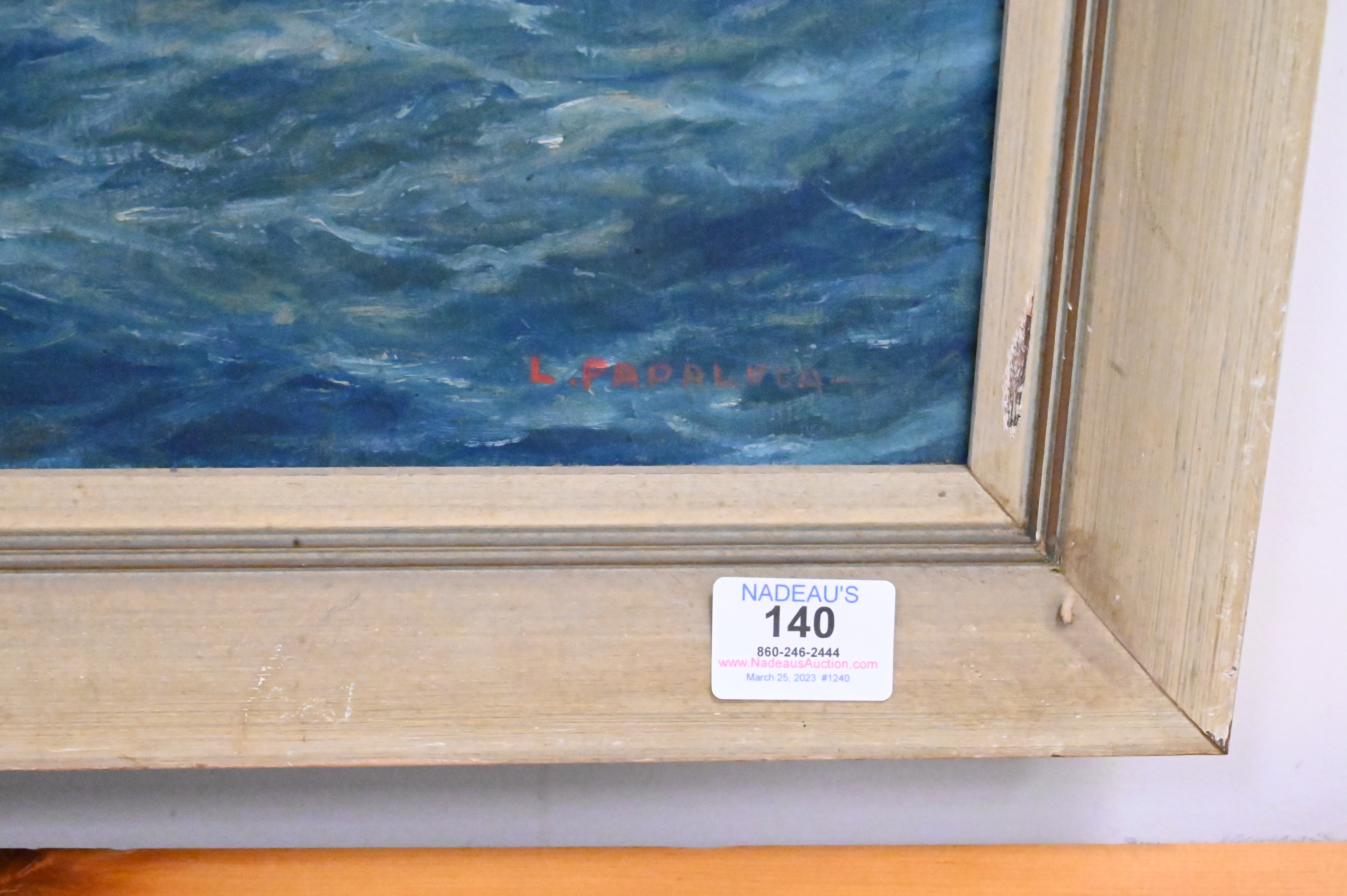 Luca Papaluca (Italy, 1890 – 1934), “Ve Div Venduta Coral Sea”, oil on canvas, signed and titled on verso, one inch tear to canvas, 18 1/2″ x 26″.