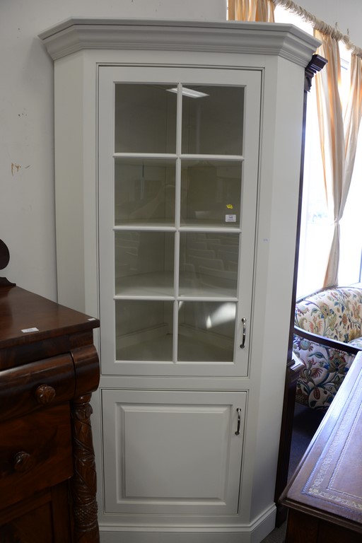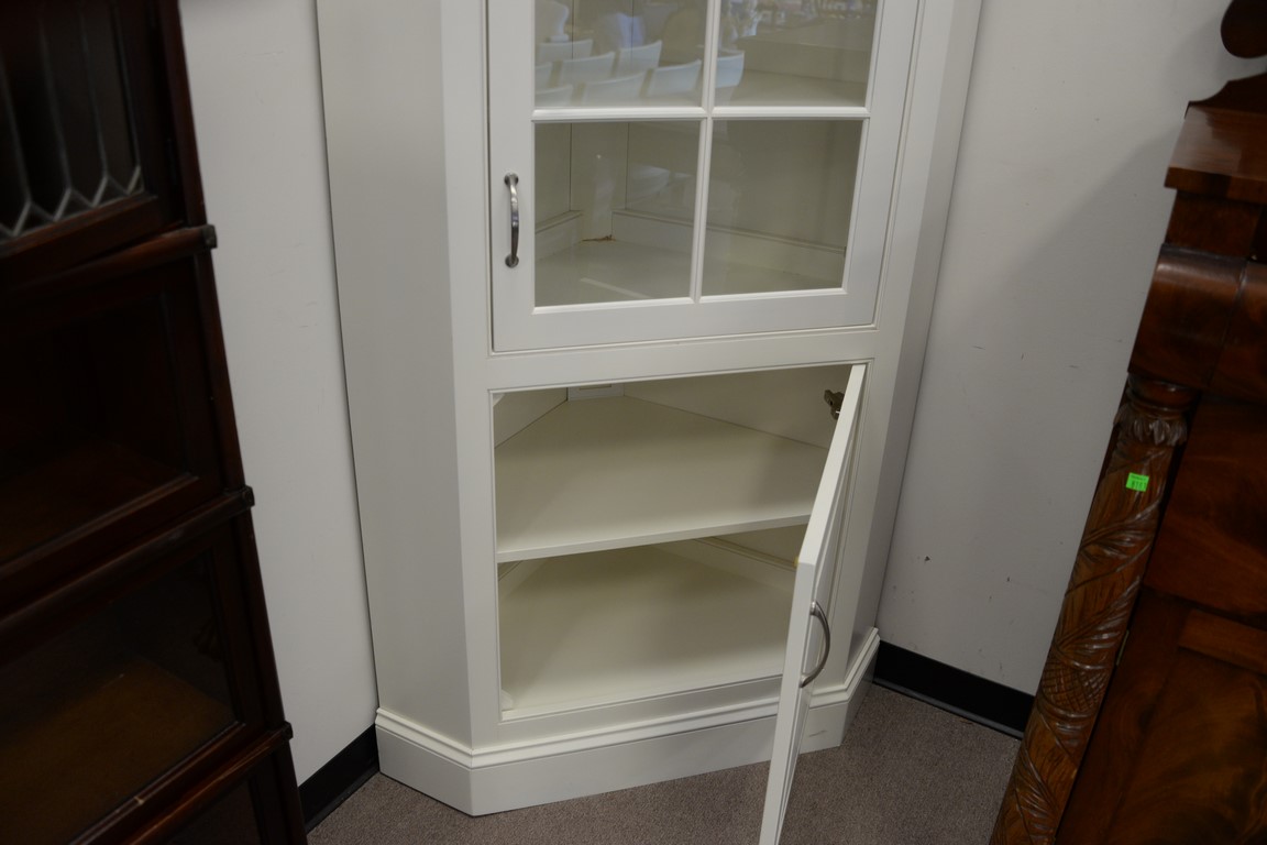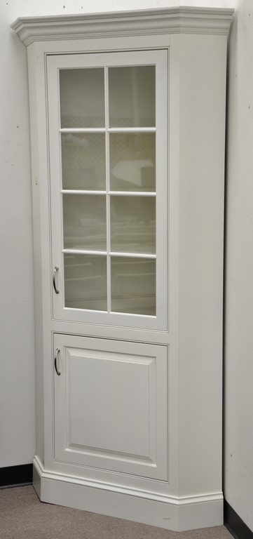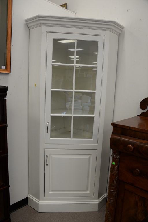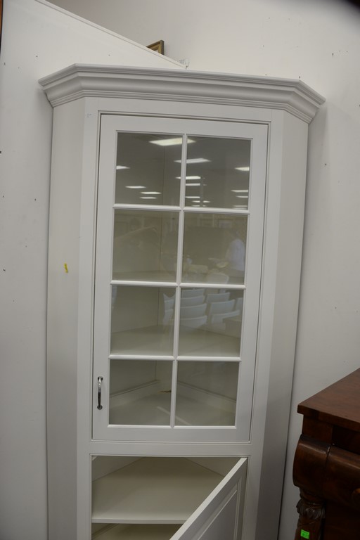 Pair of custom contemporary corner china cabinets. ht. 84in., wd. 38in.