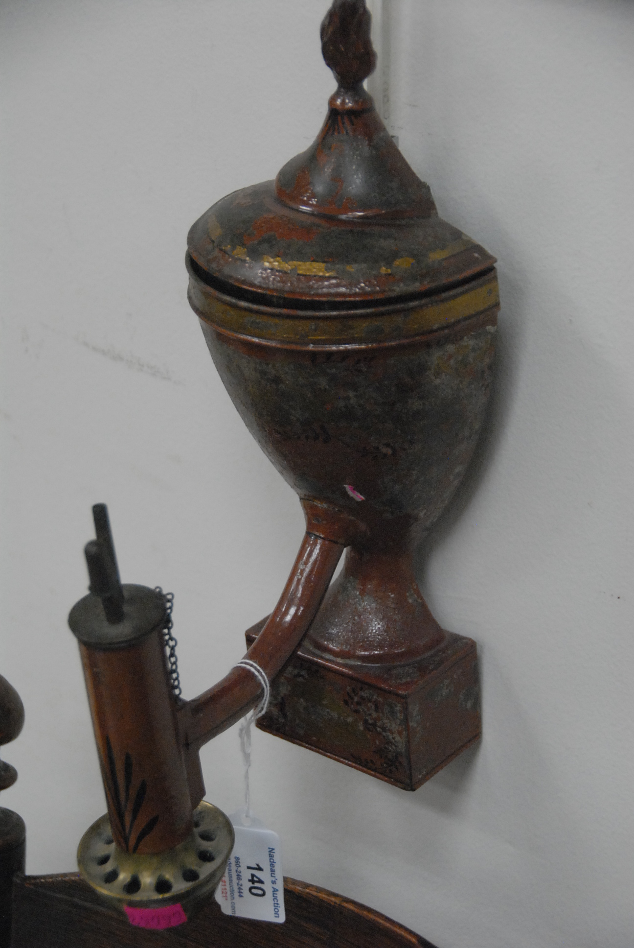 Pair of early tole and brass oil lamp sconces with old paint decoration. ht. 11 1/4 in.