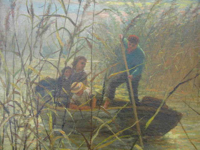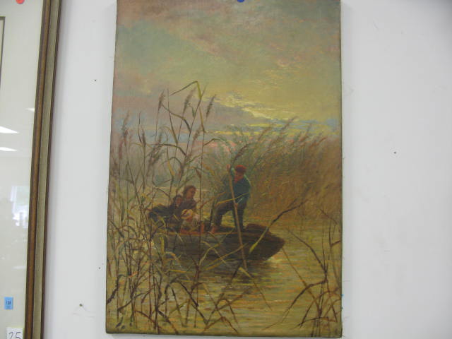 S. Hodgson, oil on canvas of people in boat in marsh