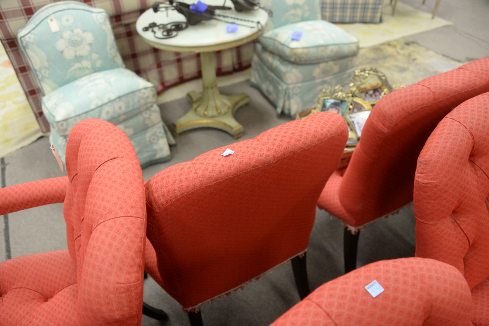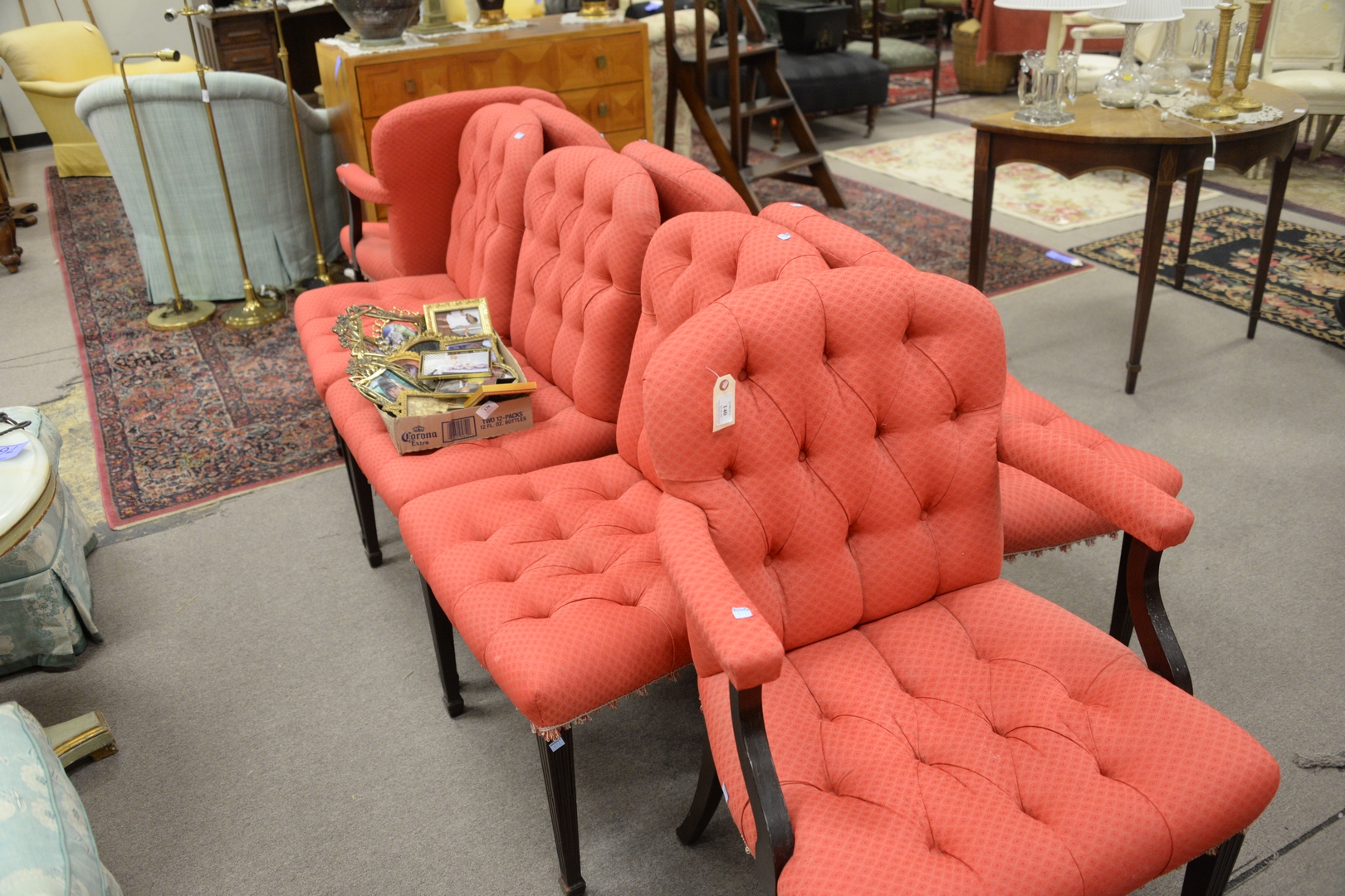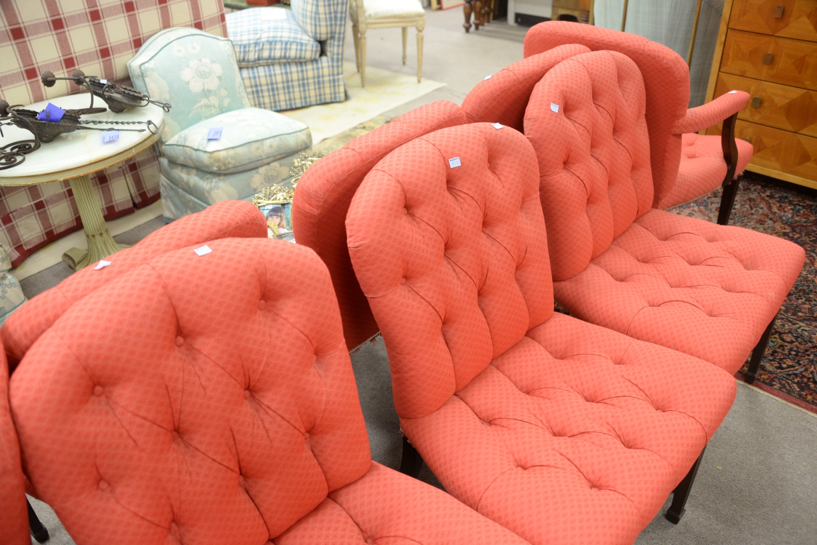 Set of Eight Mahogany Upholstered Dining Chairs, 2 arm, 6 side, height 36 inches.