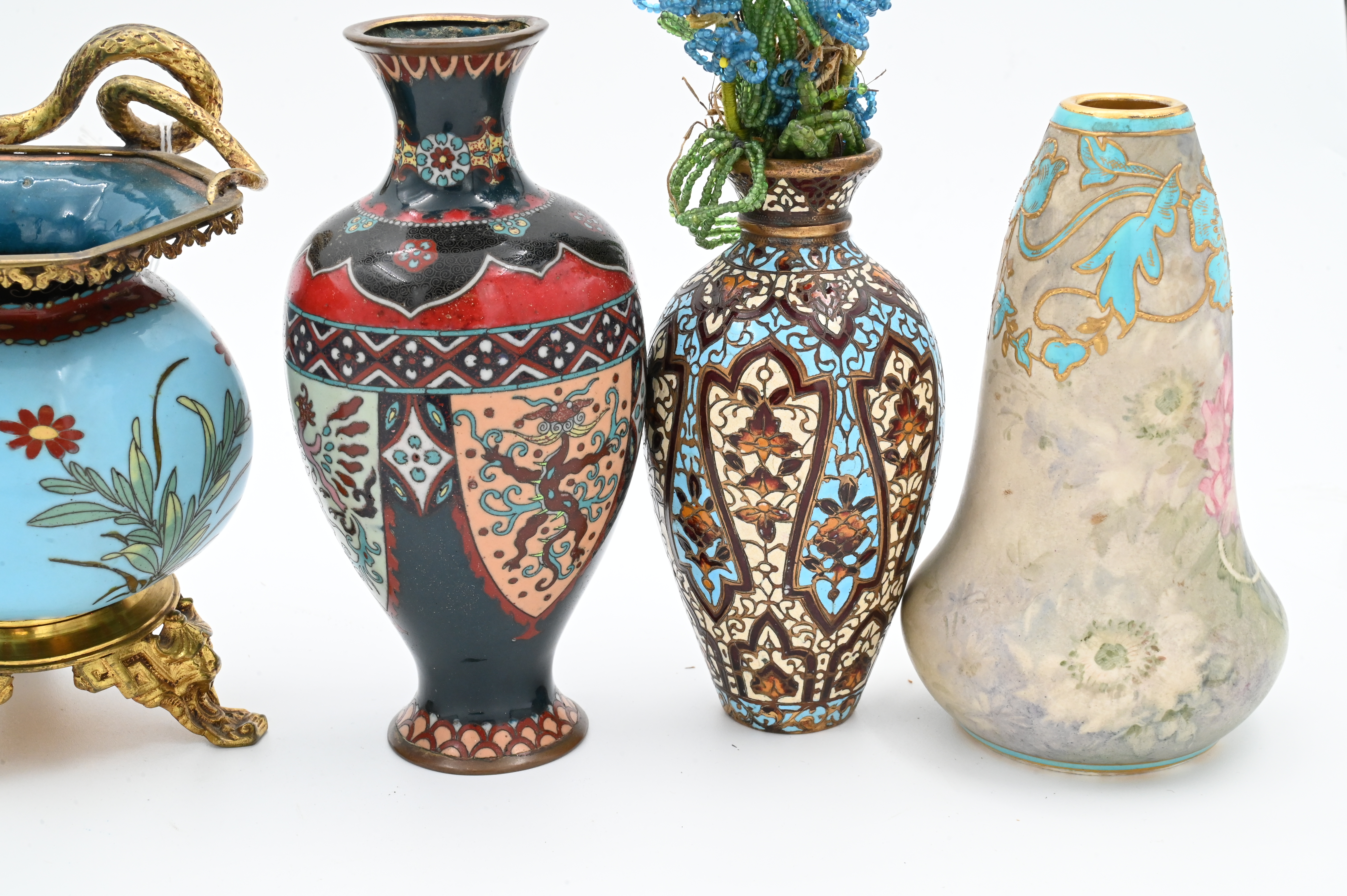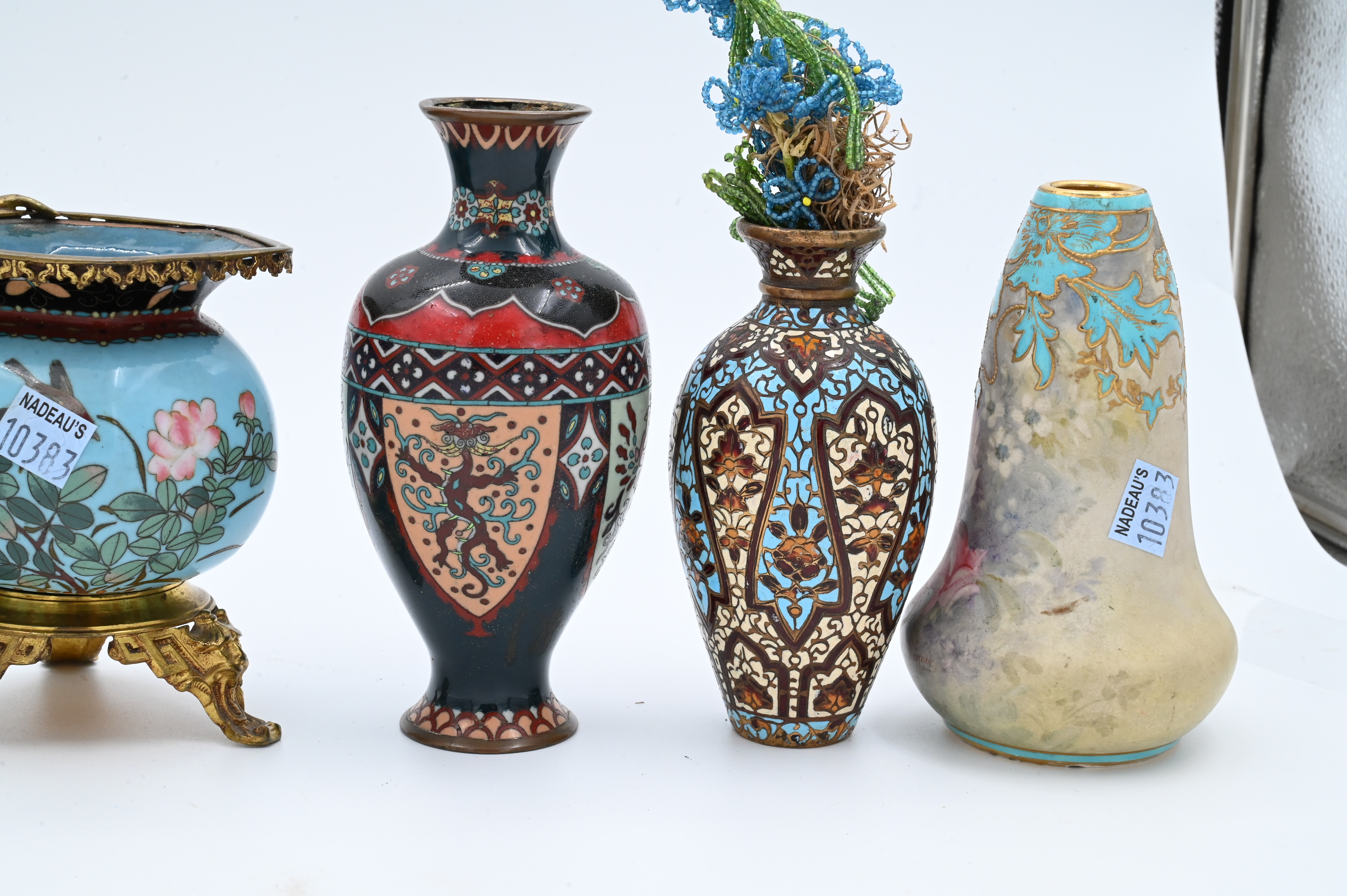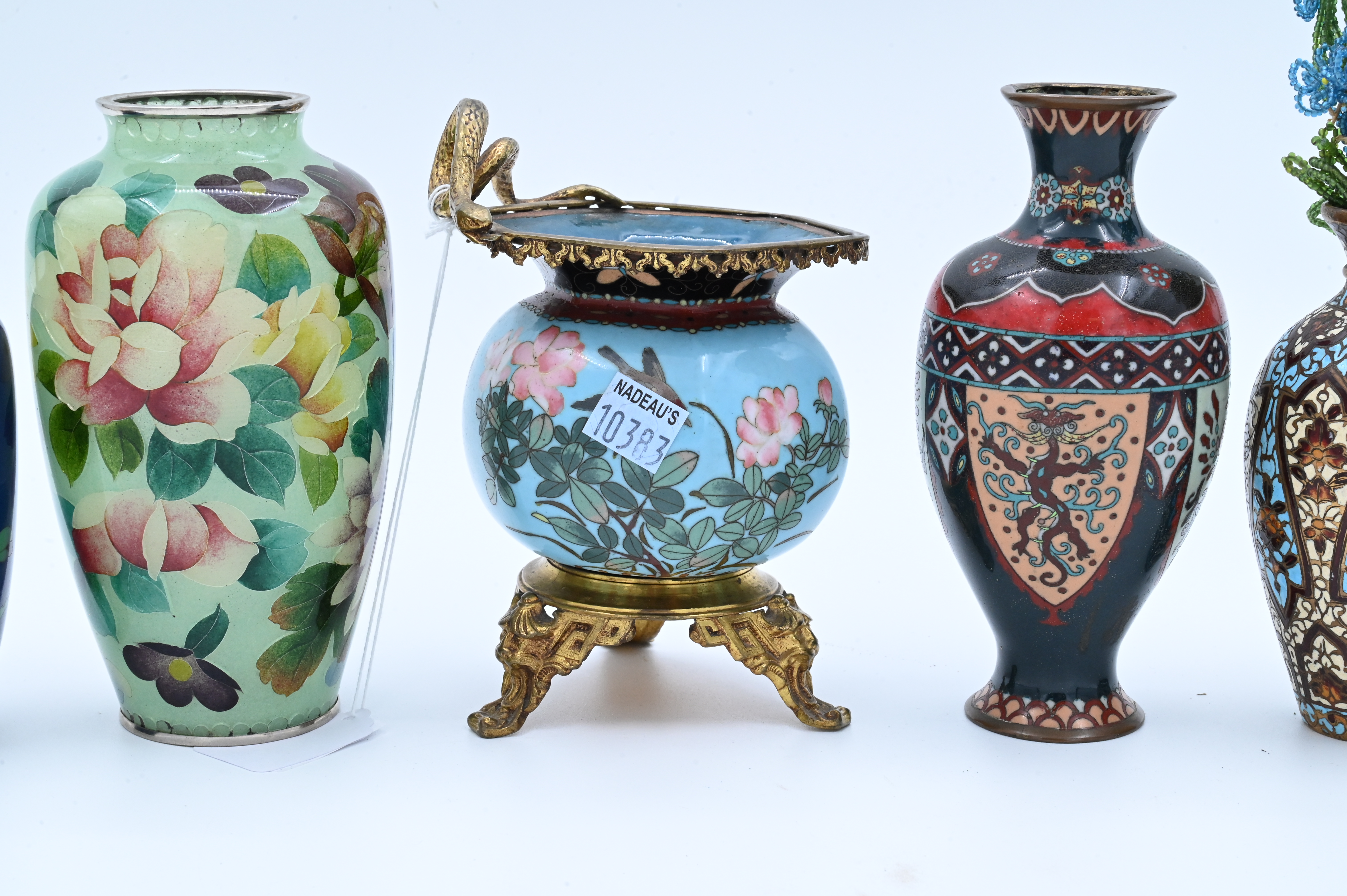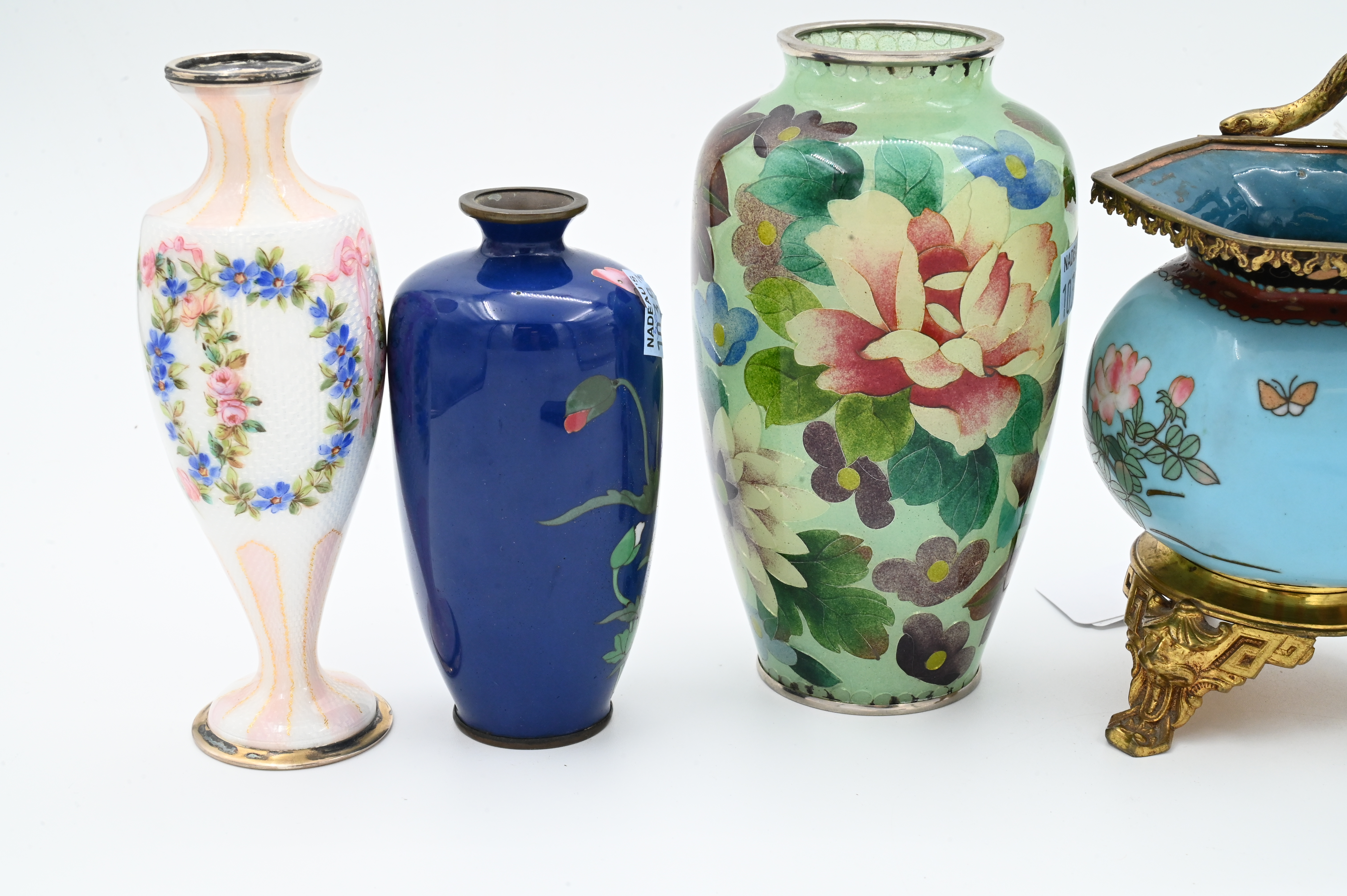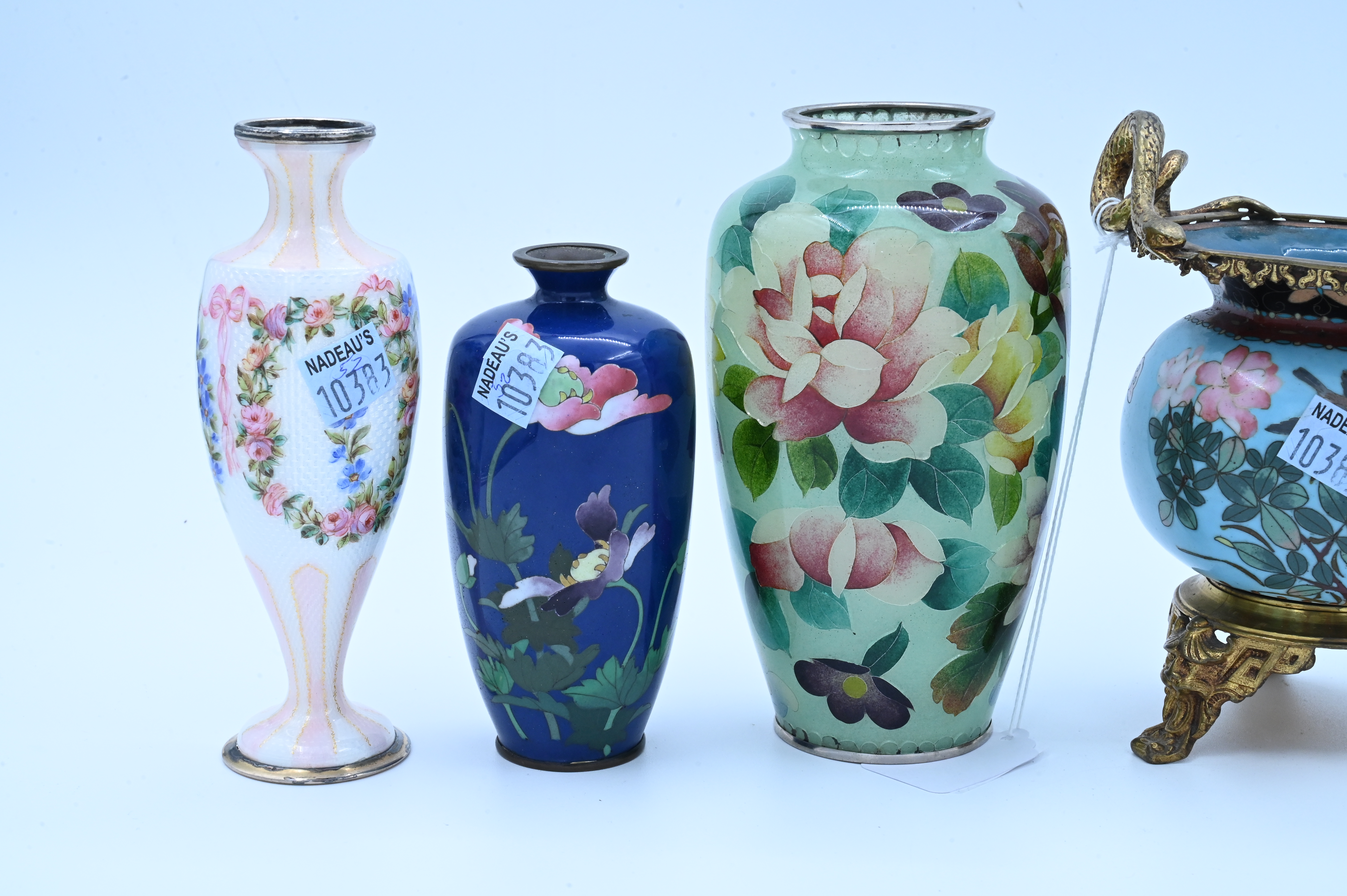 Cloisonne firebird vase, Japanese plique a jour Cloisonne floral vase, pink striped shimmer urn, royal blue vase, blue and cream Chinese style Cloisonne, enameled pot top rim mounted with smoke over flower decorated body on heavy brass footed base, Royal Bonn hand painted and enamel bud vase