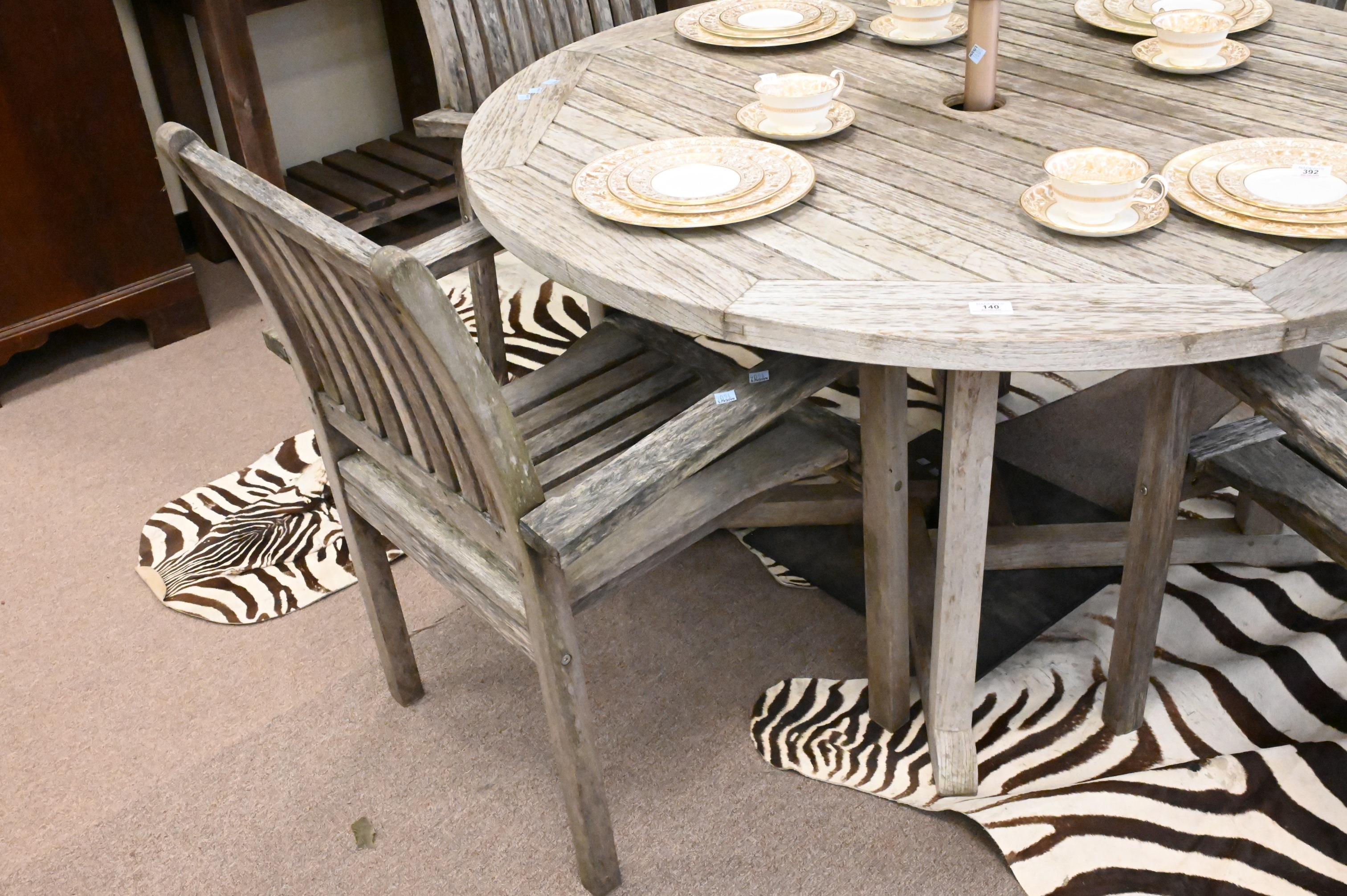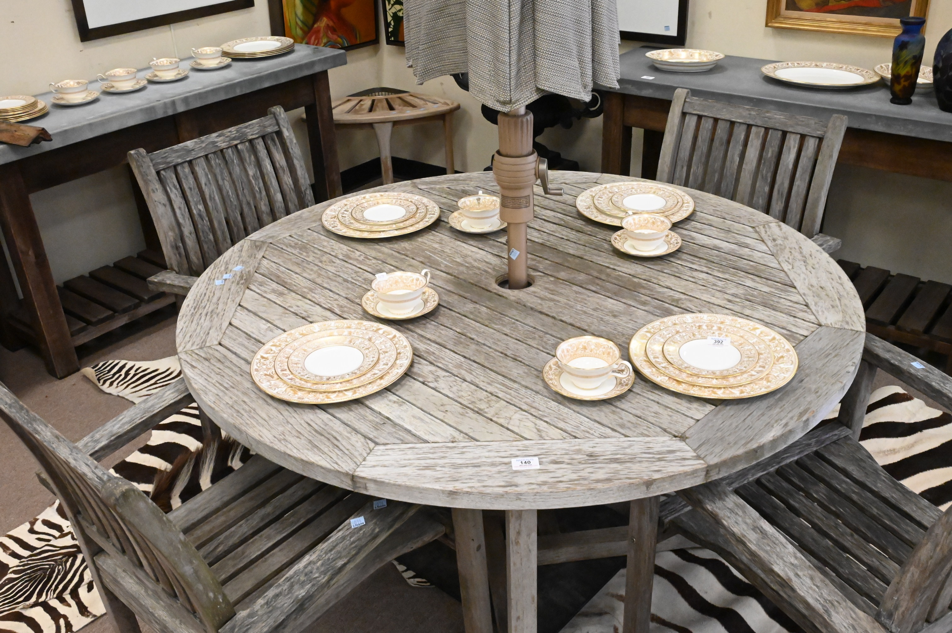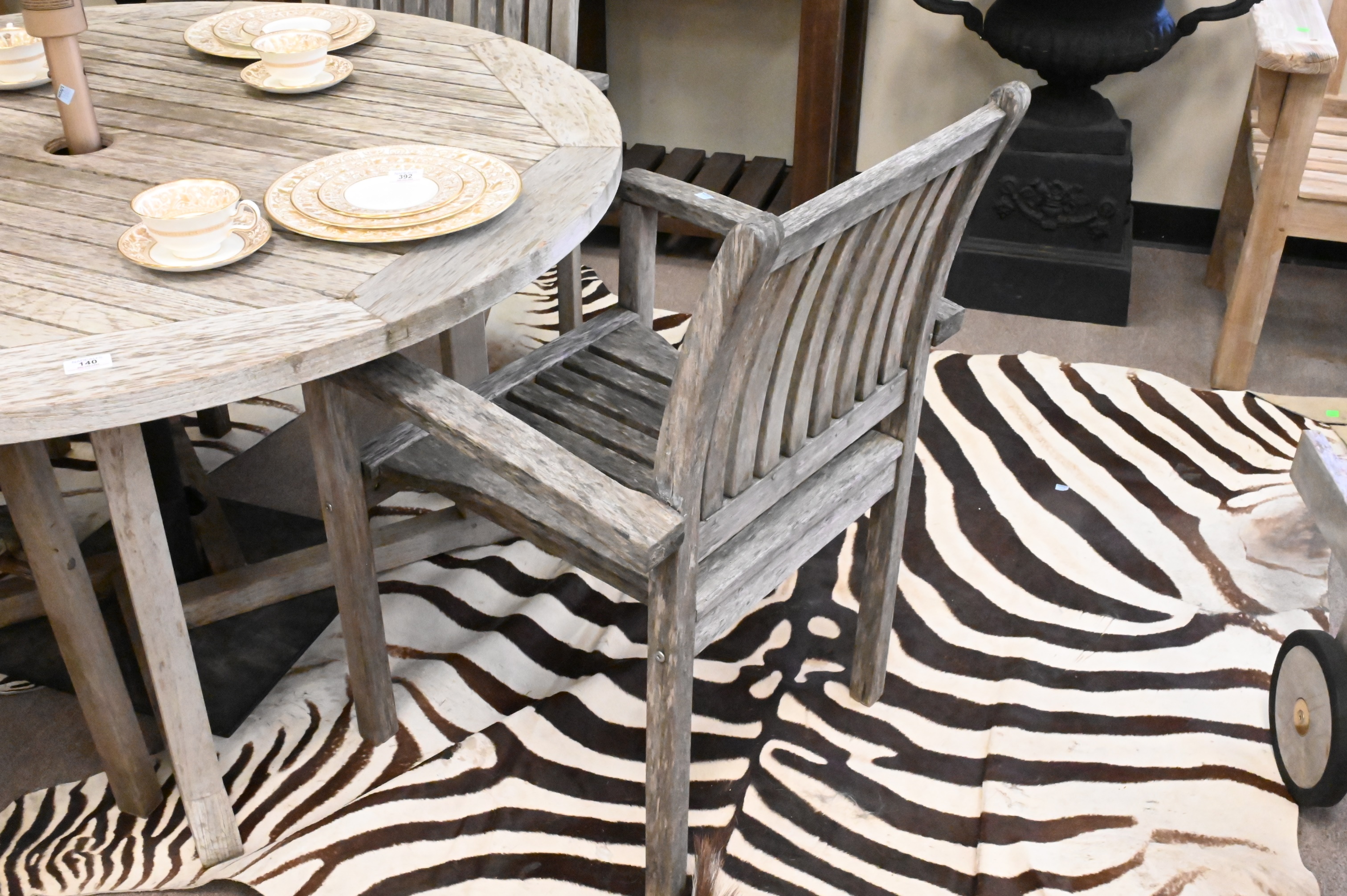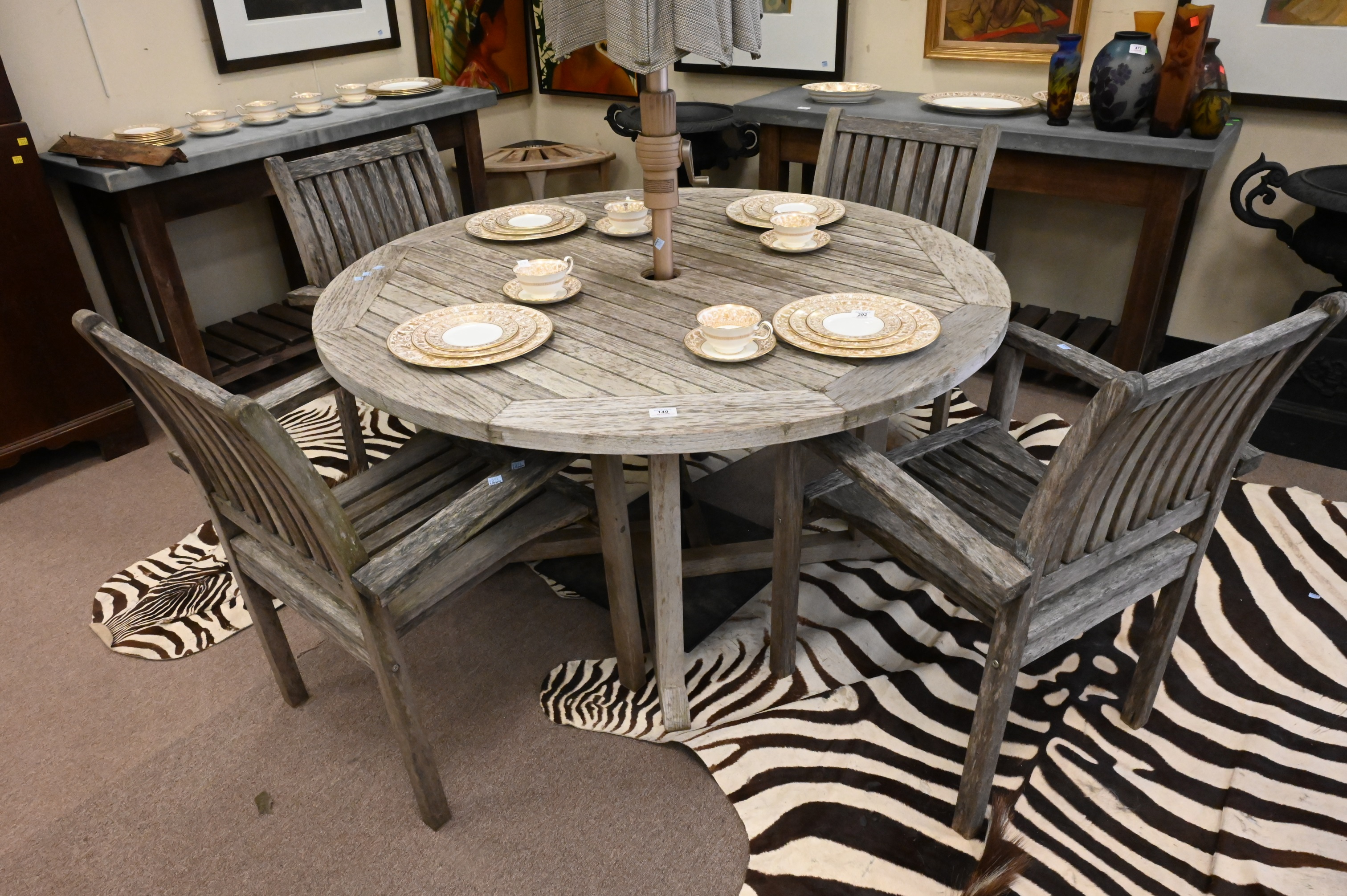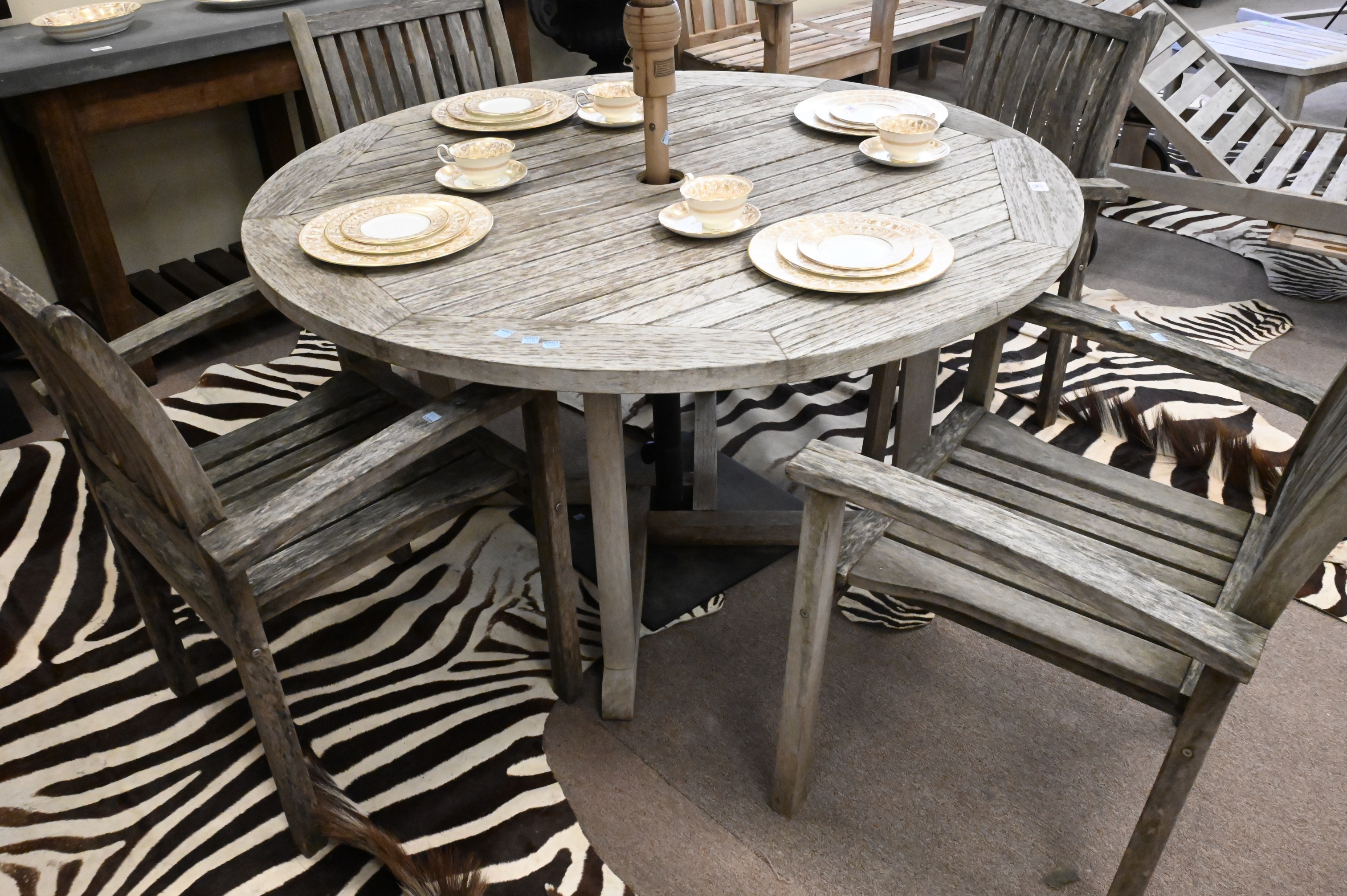 Teak Five Piece Outdoor Set, to include four arm chairs, along with a round Barlow Tyrie table, table height 27 1/2 inches, diameter 51 1/4 inches, chair height 33 inches.