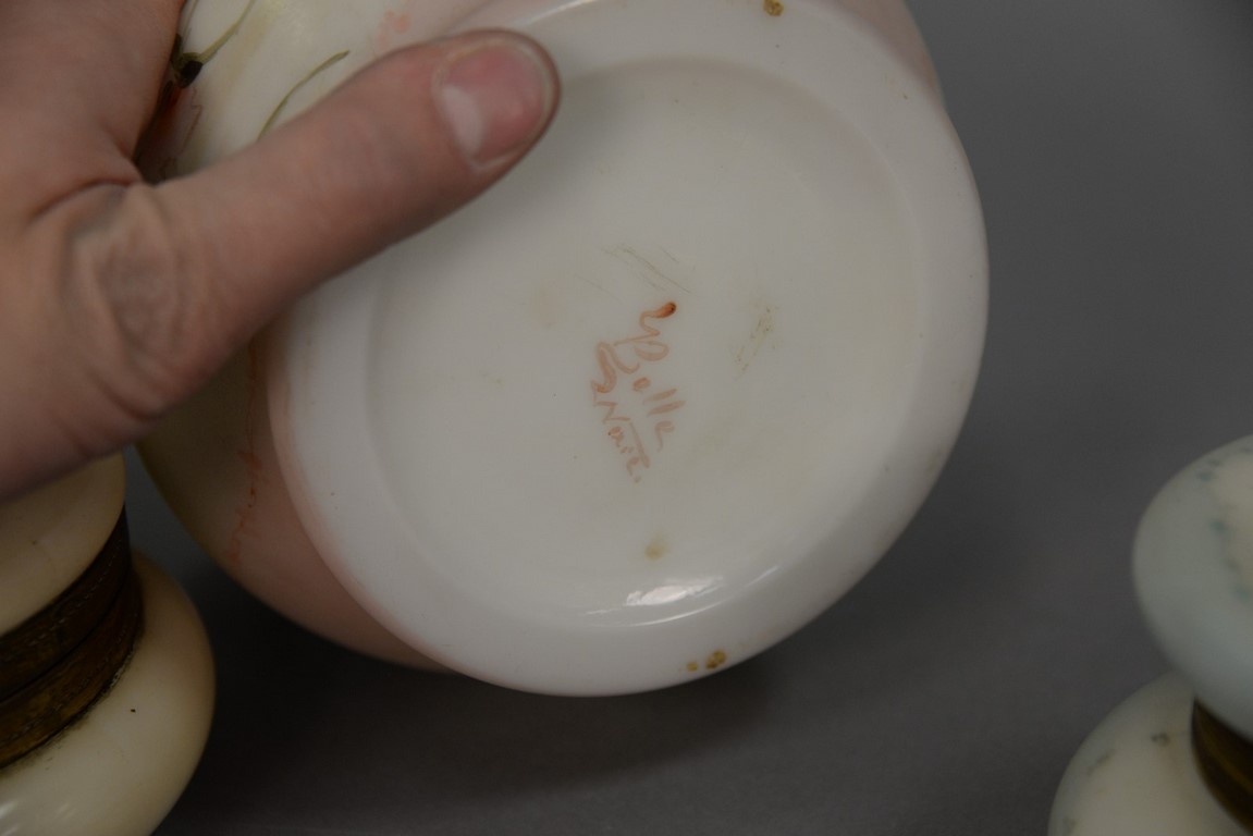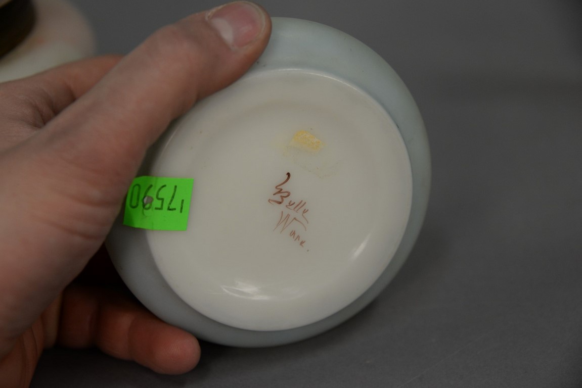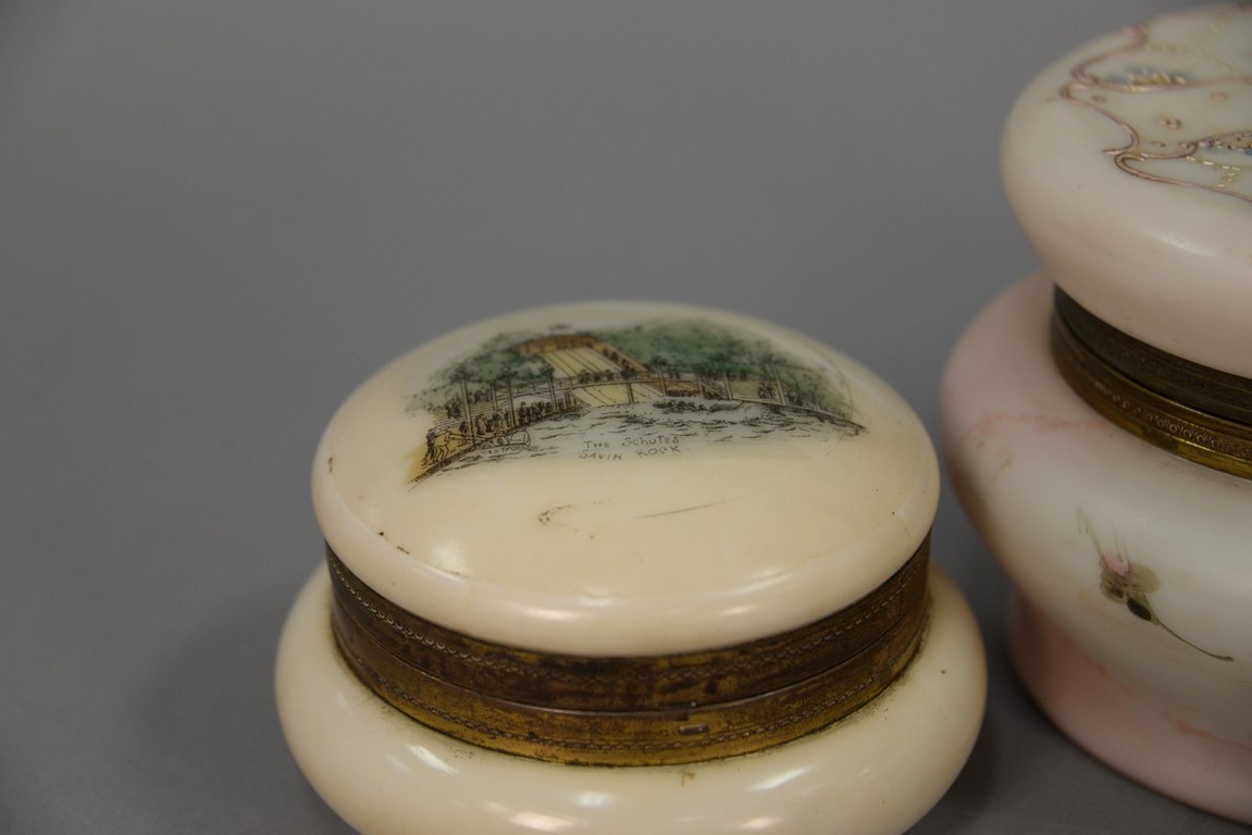 Lot 140: Three dresser boxes, two are Carl Helmschmied Bellware boxes one pink ht. 4 1/2 in., dia. 6 in. and a blue one ht. 2 3/4 in., dia. 4…