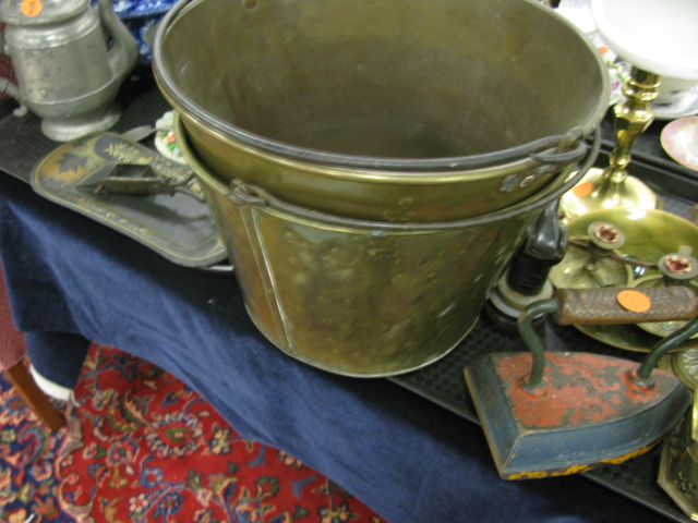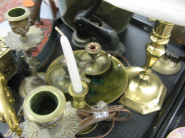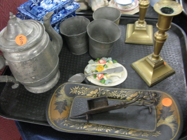 Two tray lots of primitives to include pewter, Staffordshire covered sugar bowl, pair of push up candlesticks, two brass pails, brass lamp, metal lion, sadiron etc