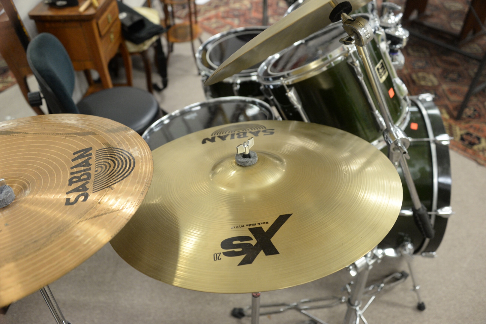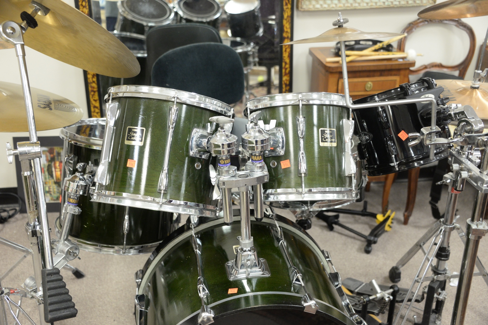 Yamaha Stage Custom Drum Set, having Sabian cymbals. Provenance: David and Cynthia Kim, 22 Stoney Wylde Lane, Greenwich, Connecticut. View home by visiting: https://www.zillow.com/homedetails/22-Stoney-Wylde-Ln-Greenwich-CT-06830/177238281_zpid/