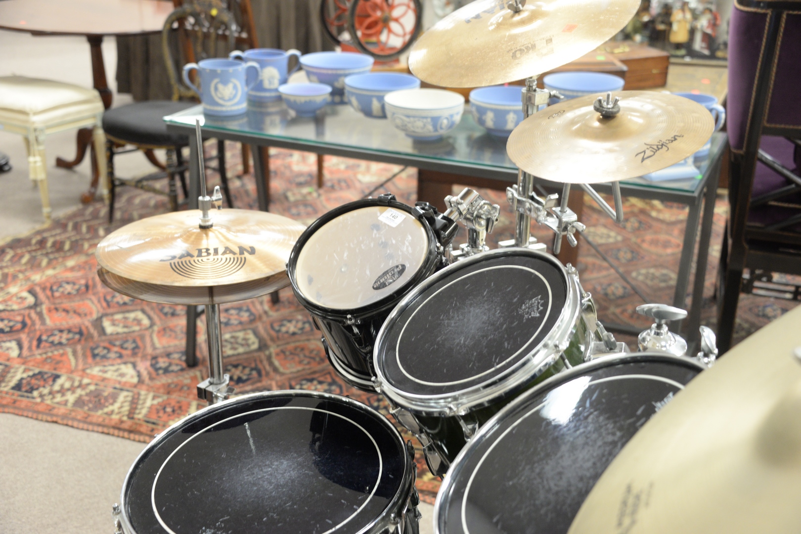 Lot 140: Yamaha Stage Custom Drum Set, having Sabian cymbals. Provenance: David and Cynthia Kim, 22 Stoney Wylde Lane, Greenwich, Connecticut. View home by visiting: https://www.zillow.com/homedetails/22-Stoney-Wylde-Ln-Greenwich-CT-06830/177238281_zpid/