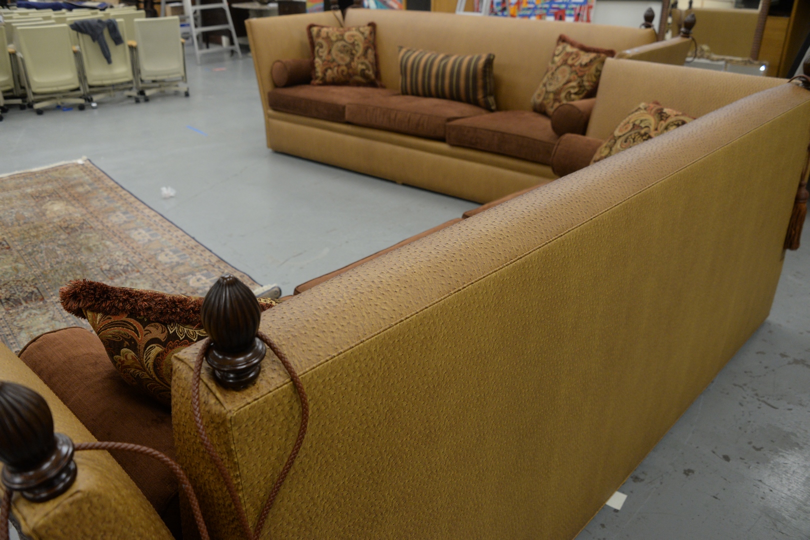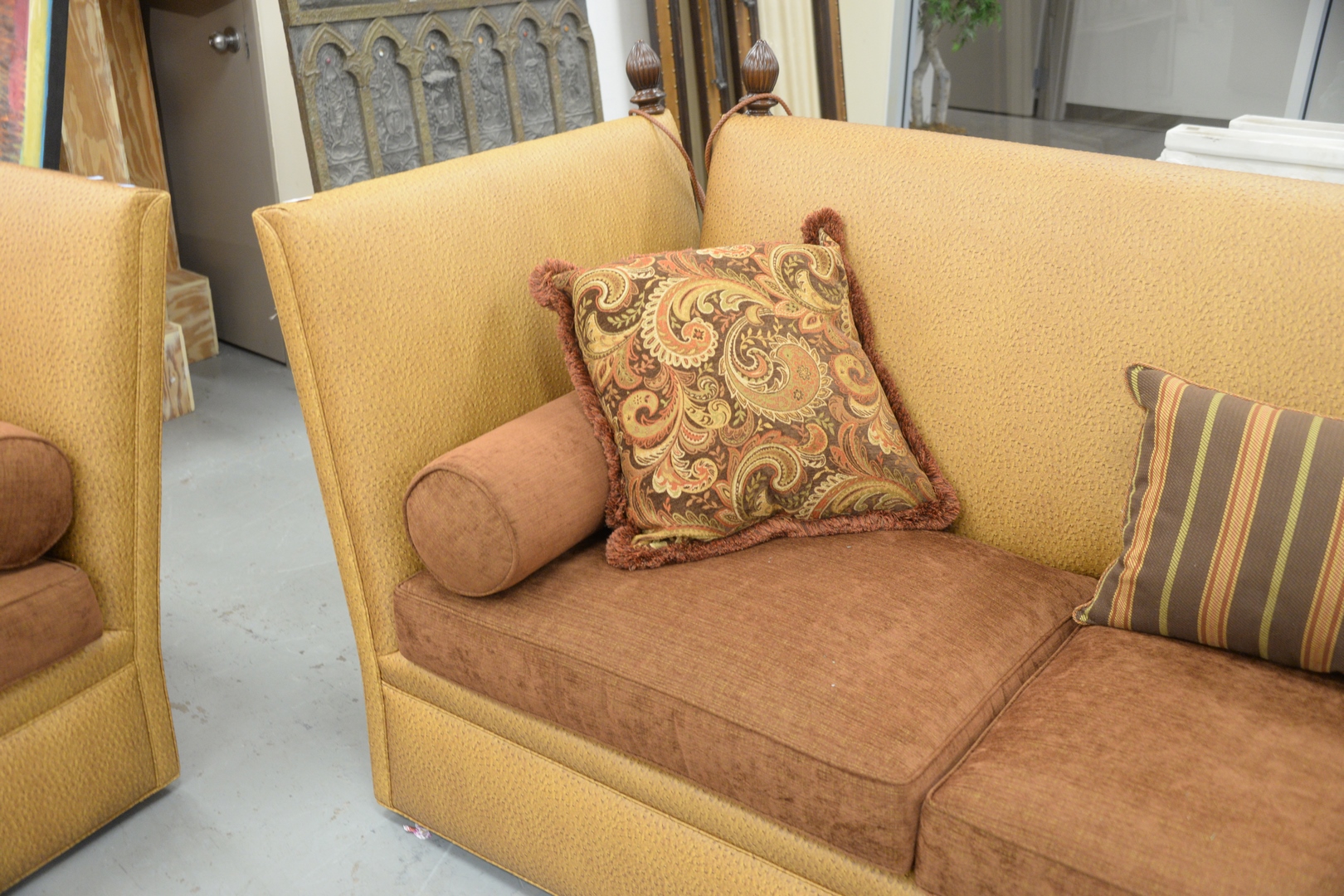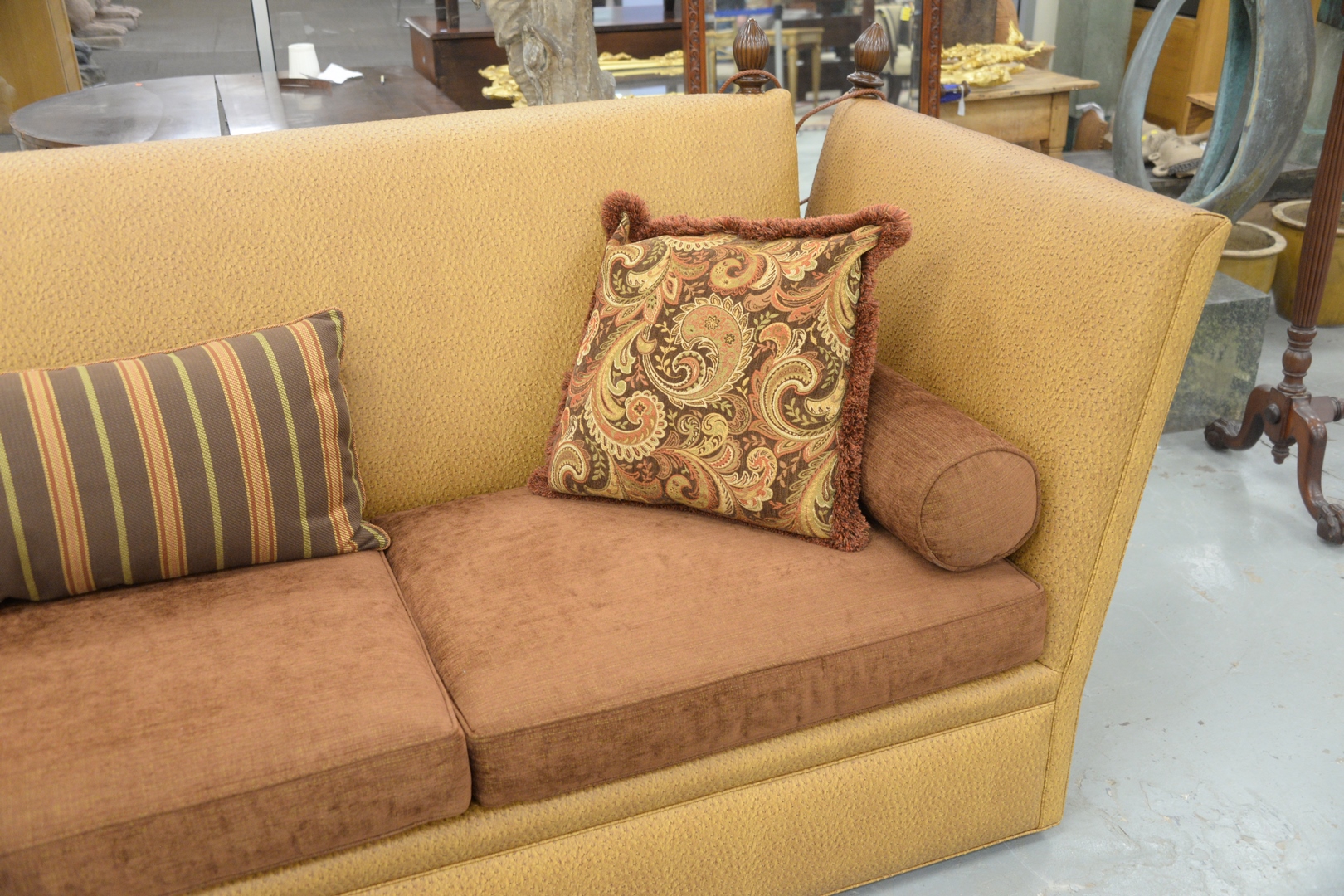 Lot 140B: Edward Ferrell Sofa, having Knole drop ends with tassels, upholstered in tan ostrich skin with brown upholstered cushions, height 46…