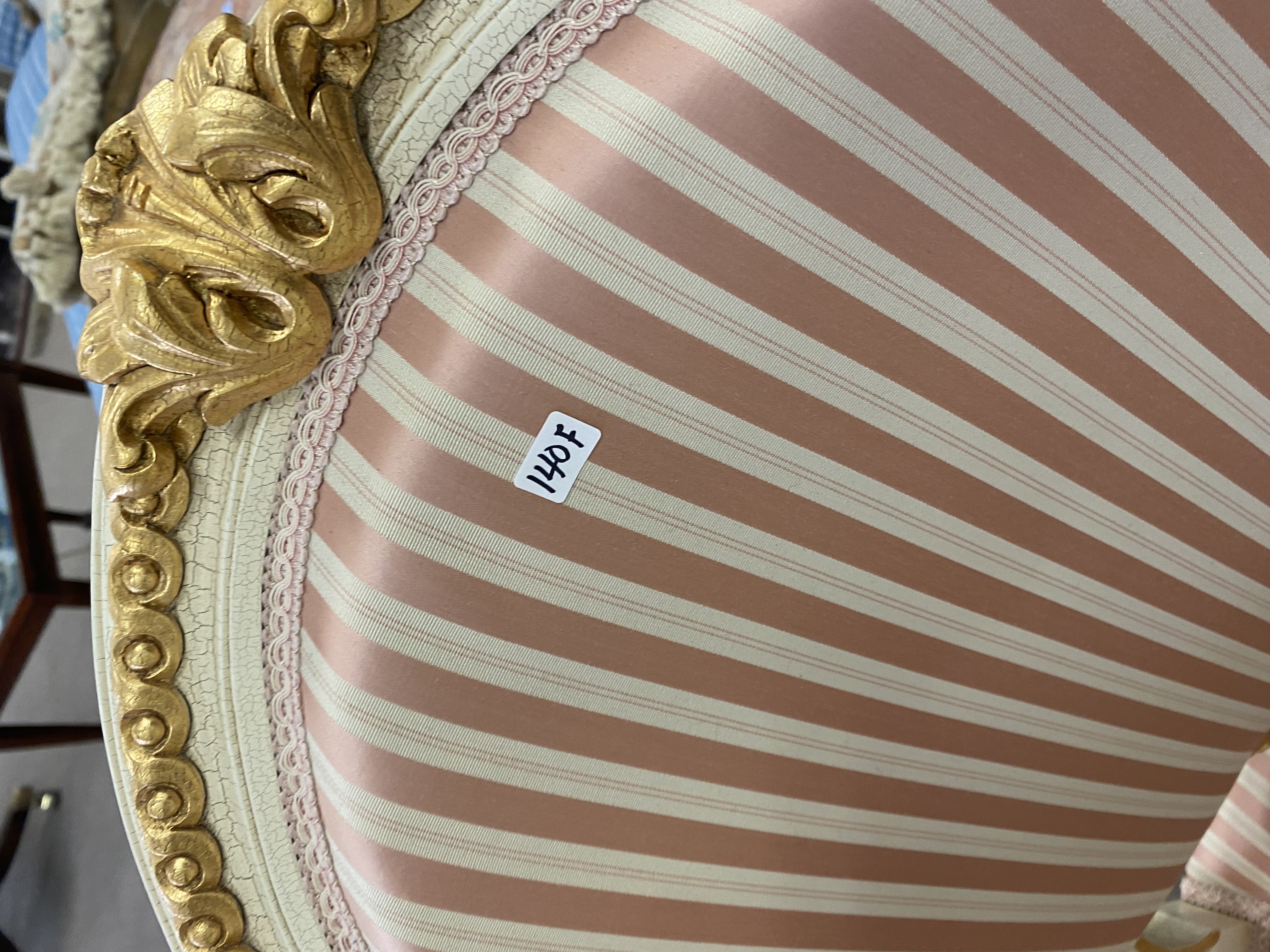 to include round pedestal table having central floral and scrolling foliate motif over carved and giltwood base, along with four striped upholstered open armchairs with scrolling gilt accents