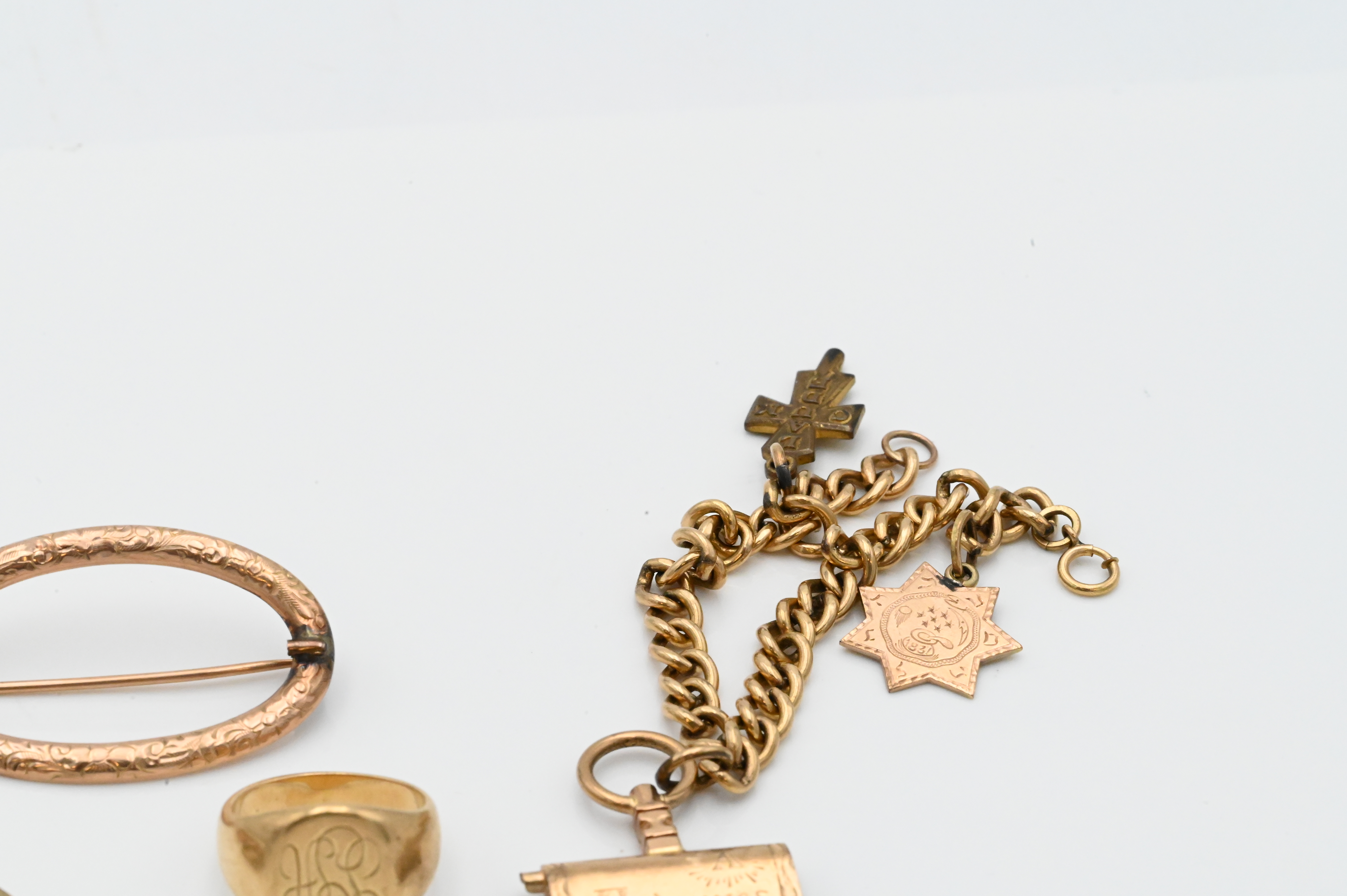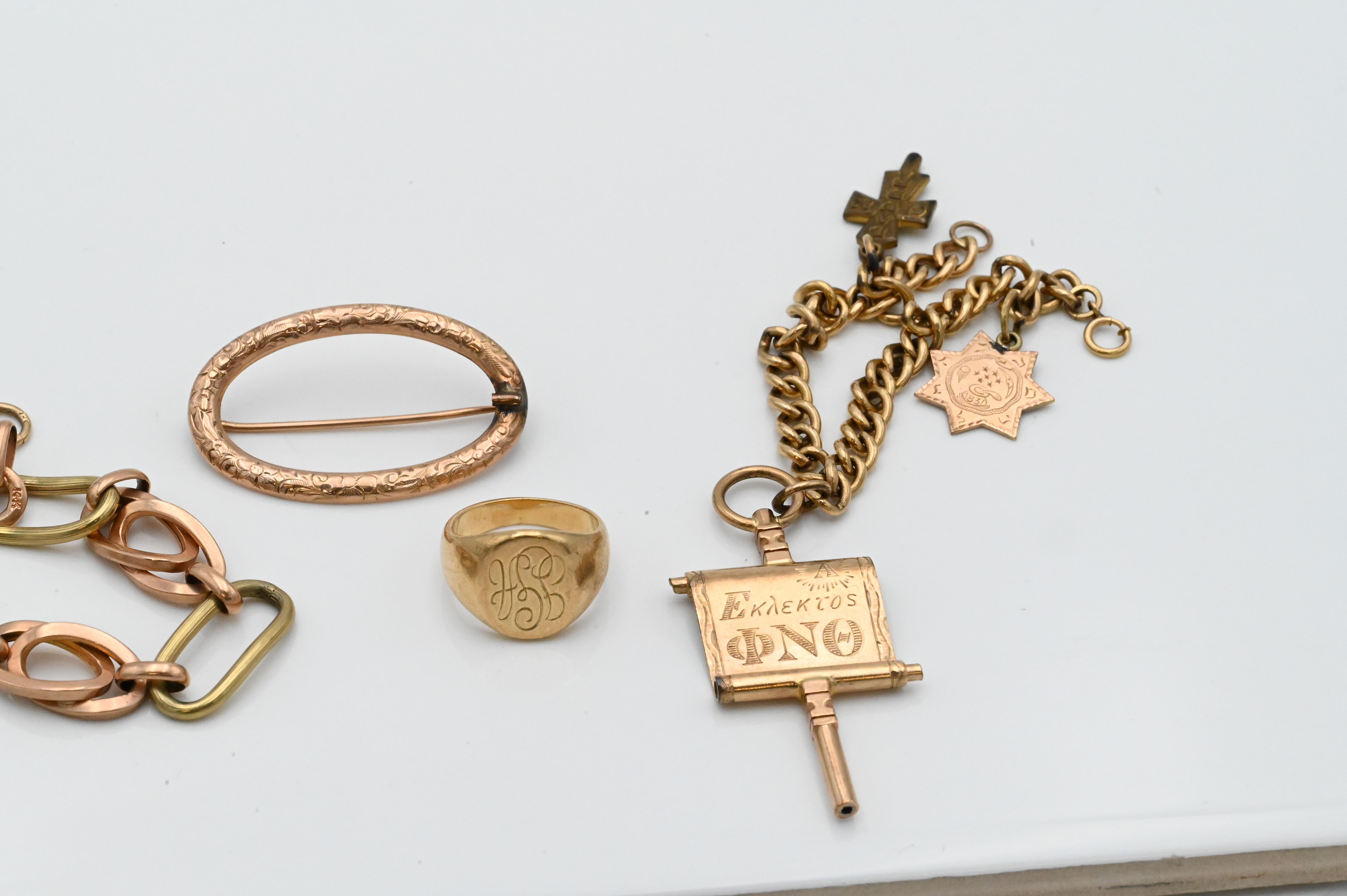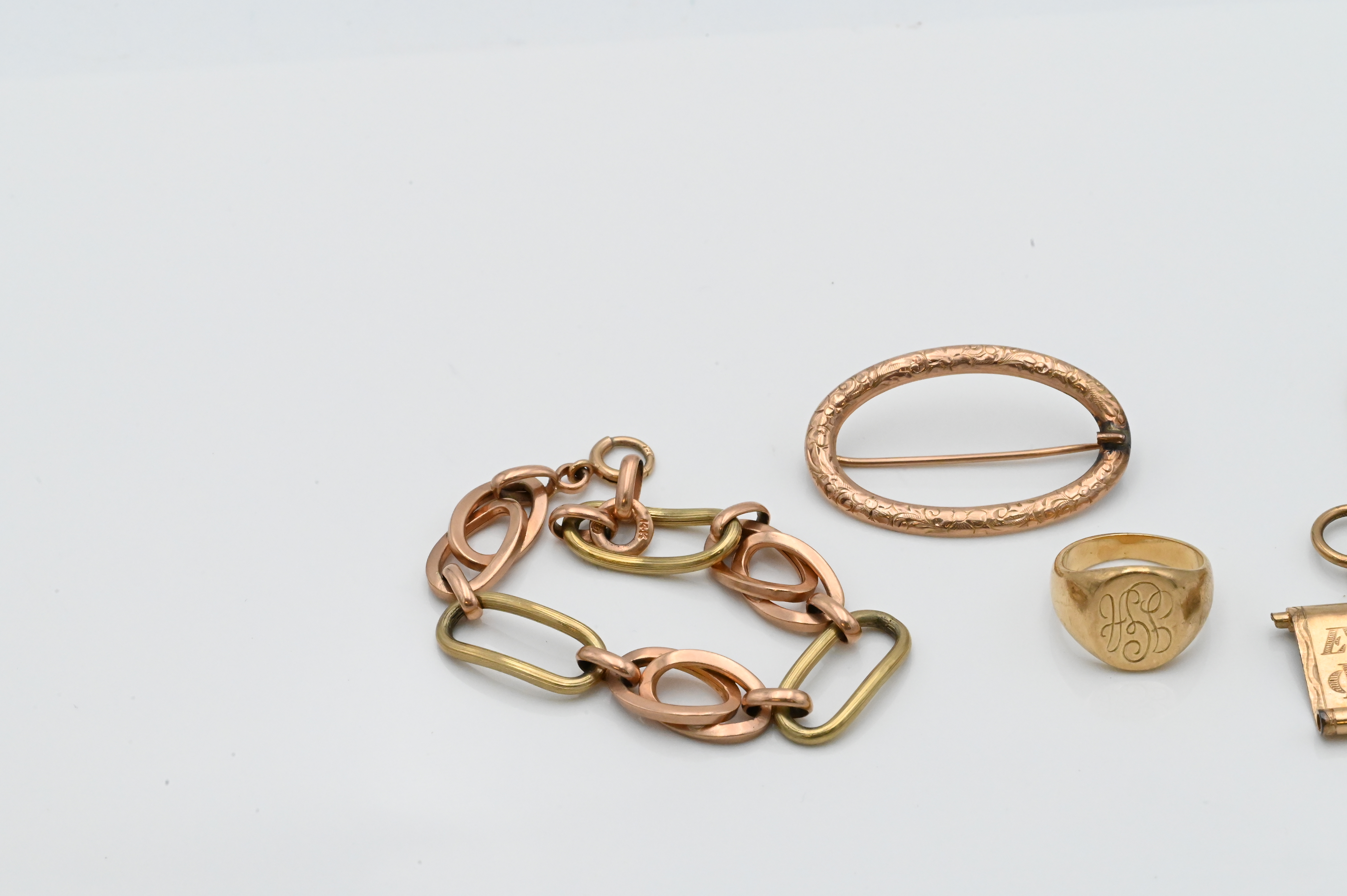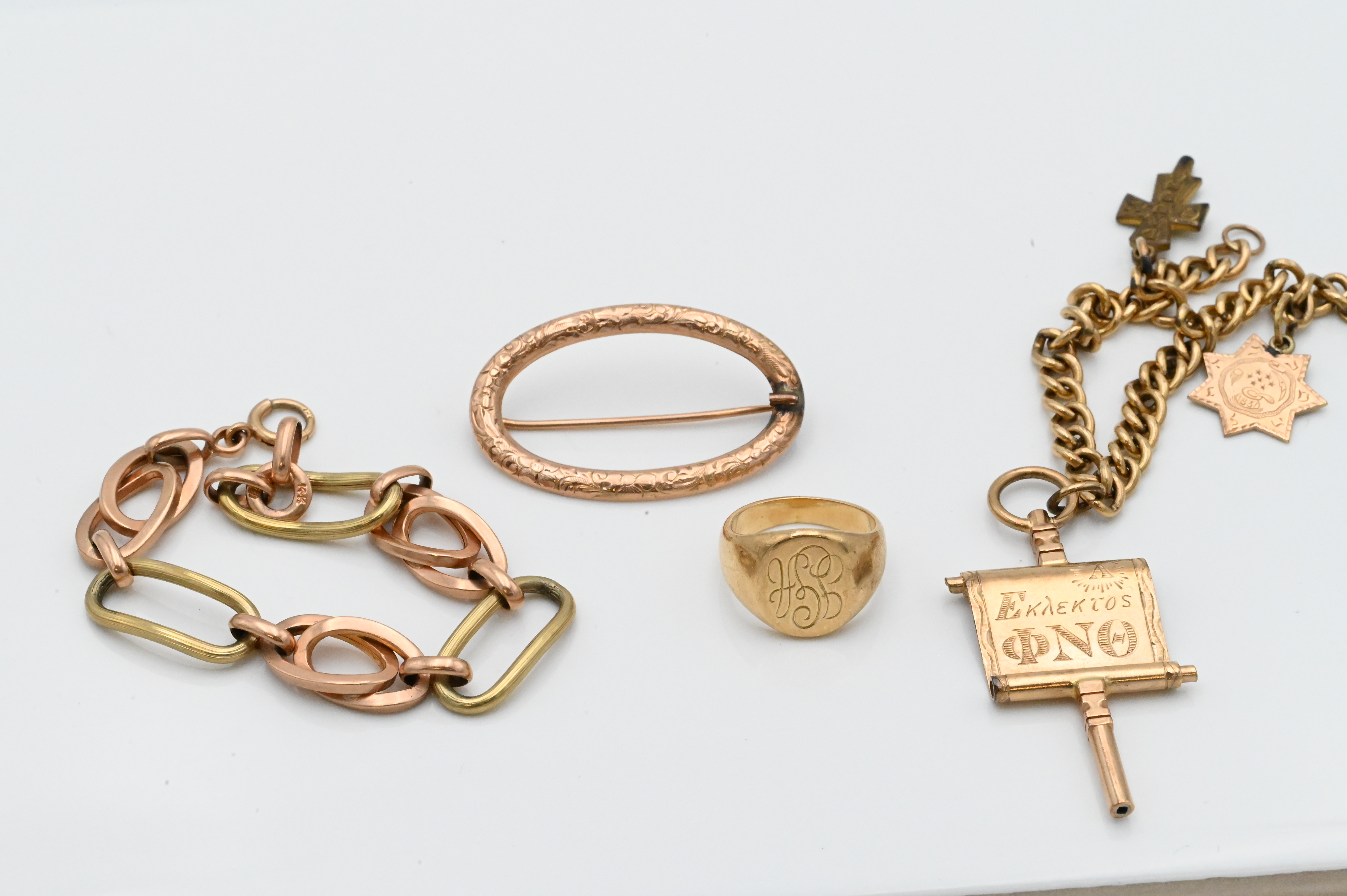 14 Karat Gold Lot, to include two bracelets, a pin, and ring, 37.6 grams.