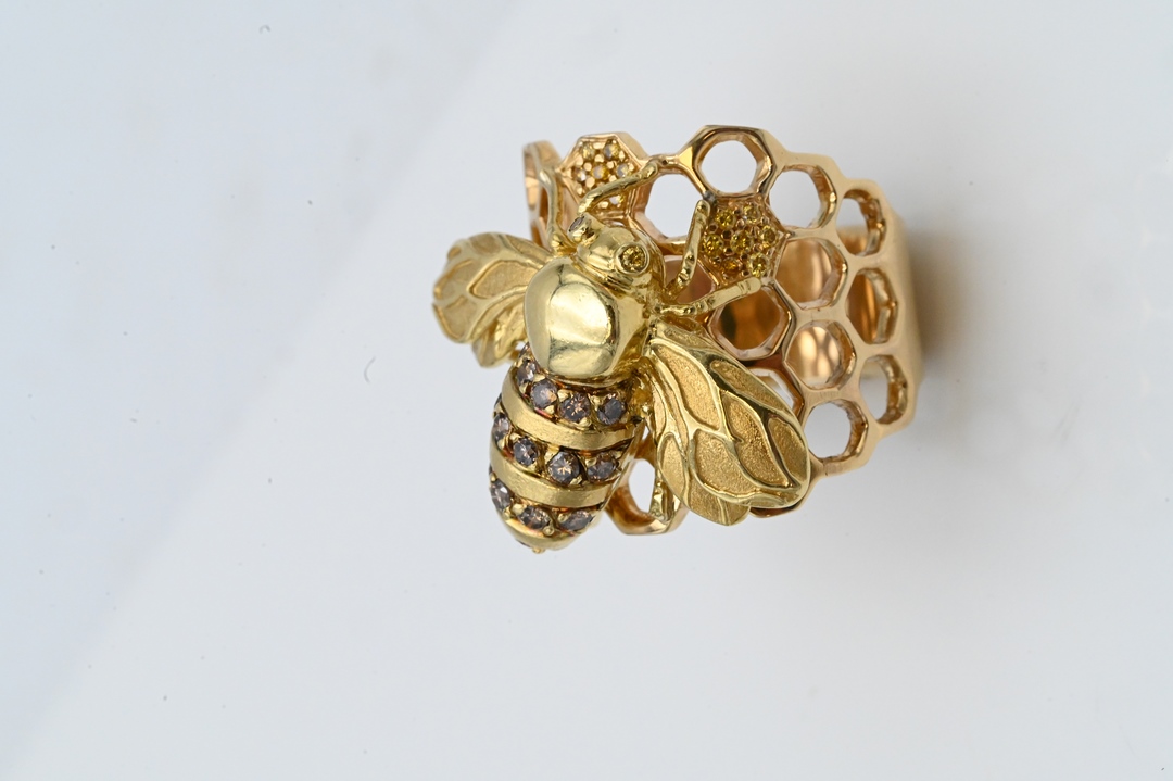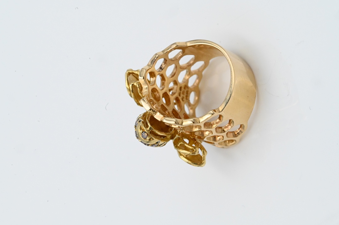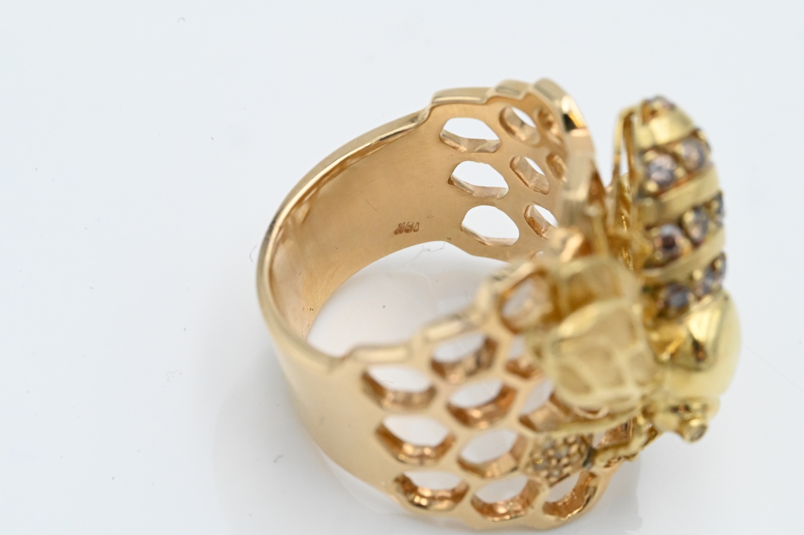 18 Karat Yellow Gold Ring set with a bumble bee having champagne diamonds size 9 3/4, 24.4 grams Condition: good condition