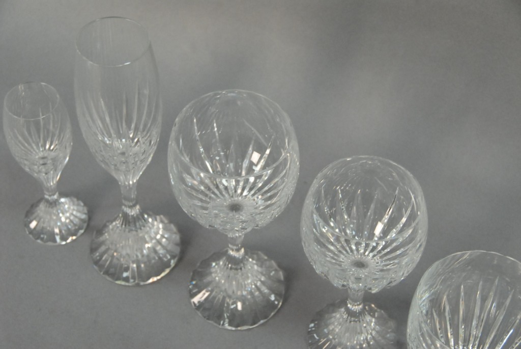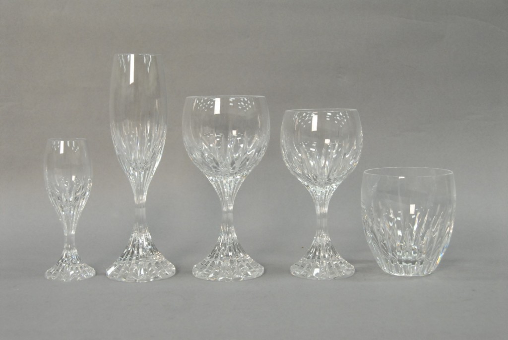 Baccarat crystal stems in five sizes 18 champagne flutes, 18 water goblets, 18 wines, 9 rocks glasses, 9 cordials, and one pair of candlesticks.