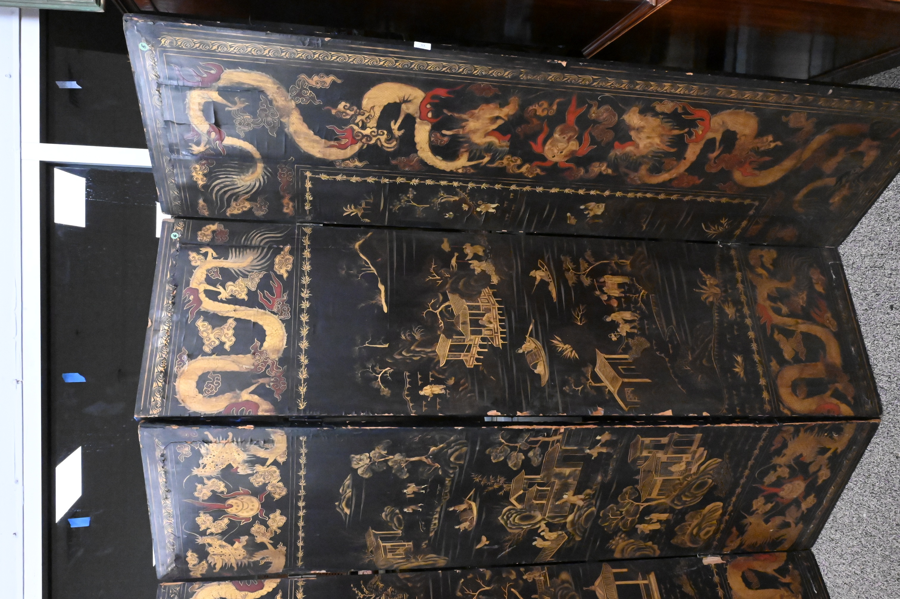 large Chinese black lacquer screen with gilt decoration, each panel painted with figural and pavilion landscapes, river scenes, and floral motifs, all within borders of gilt dragons among clouds and foliage, reverse decorated with floral sprays, hinged construction for folding display