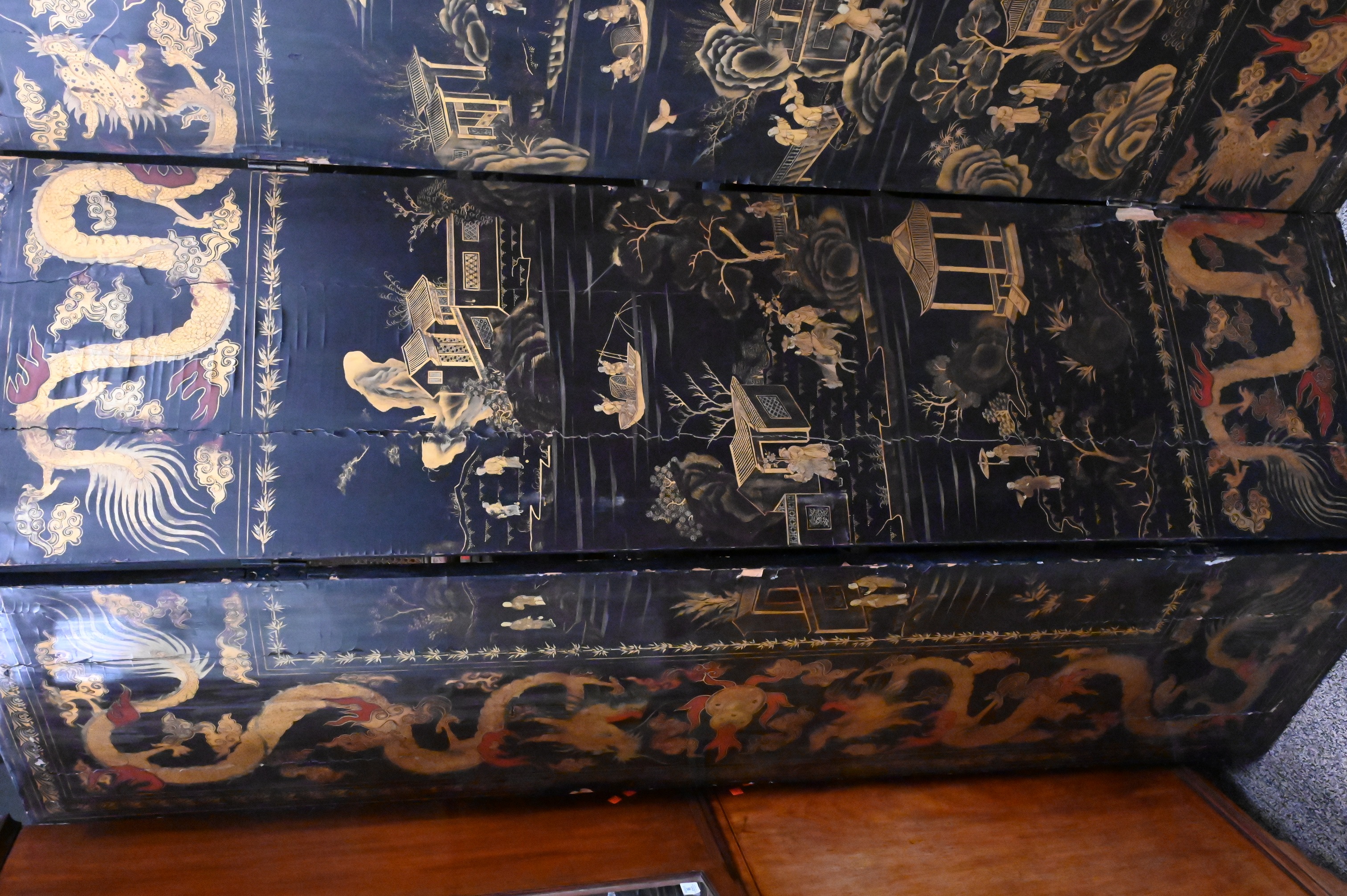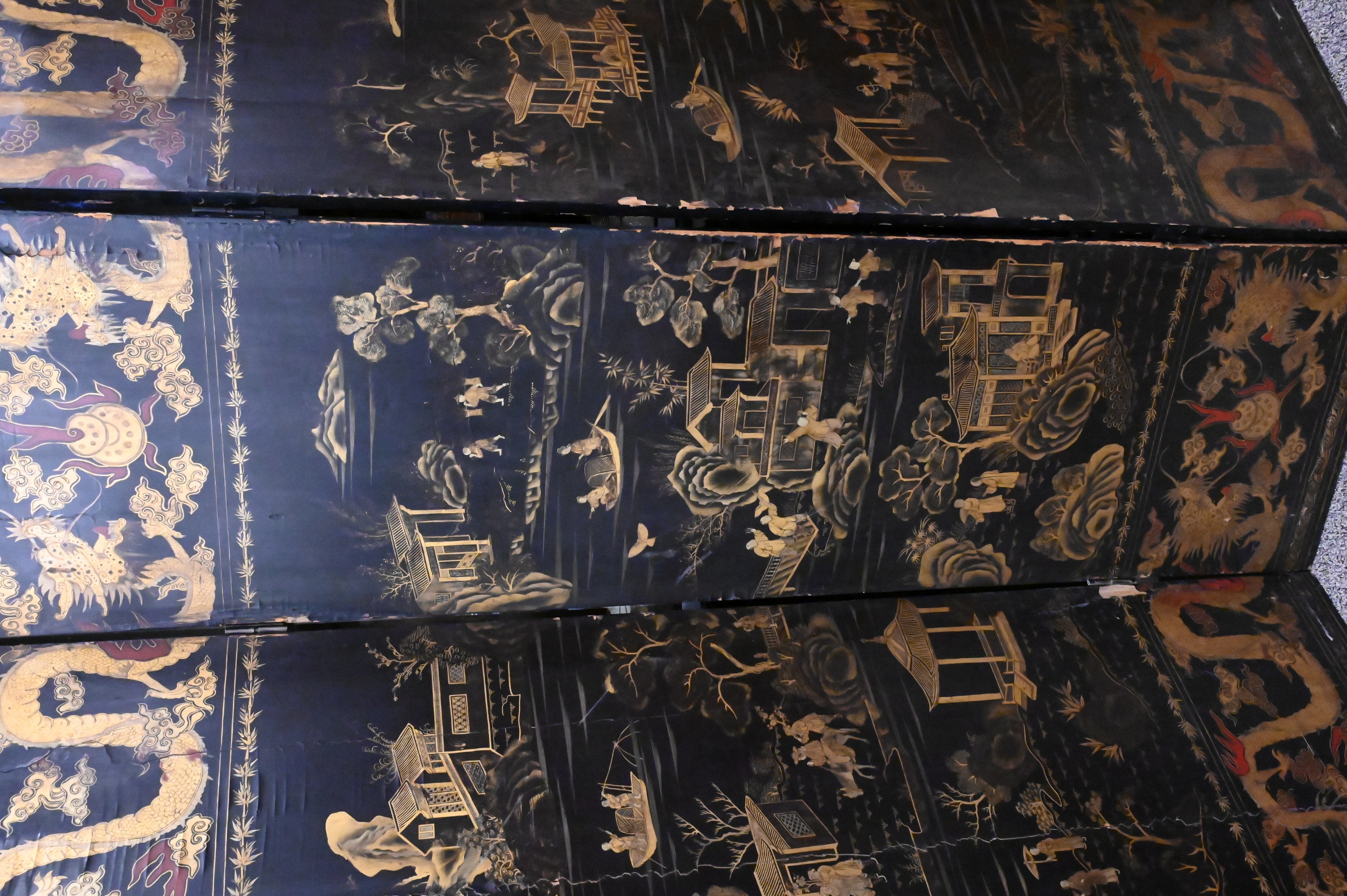 Presents well, surface wear, scratches, and scattered losses to lacquer, overall stable and decorative, screen currently in two sections