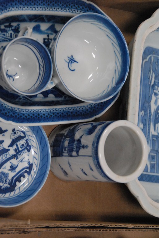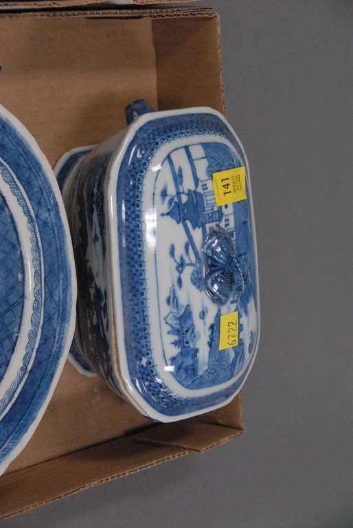 Lot 141: Eight piece lot of Canton including warming plate, small covered tureen, square vegetable dish, small vase, cups, etc.