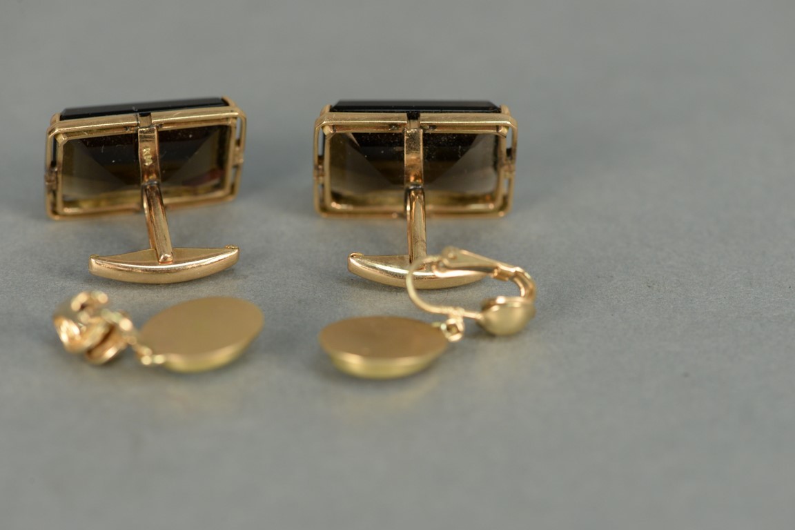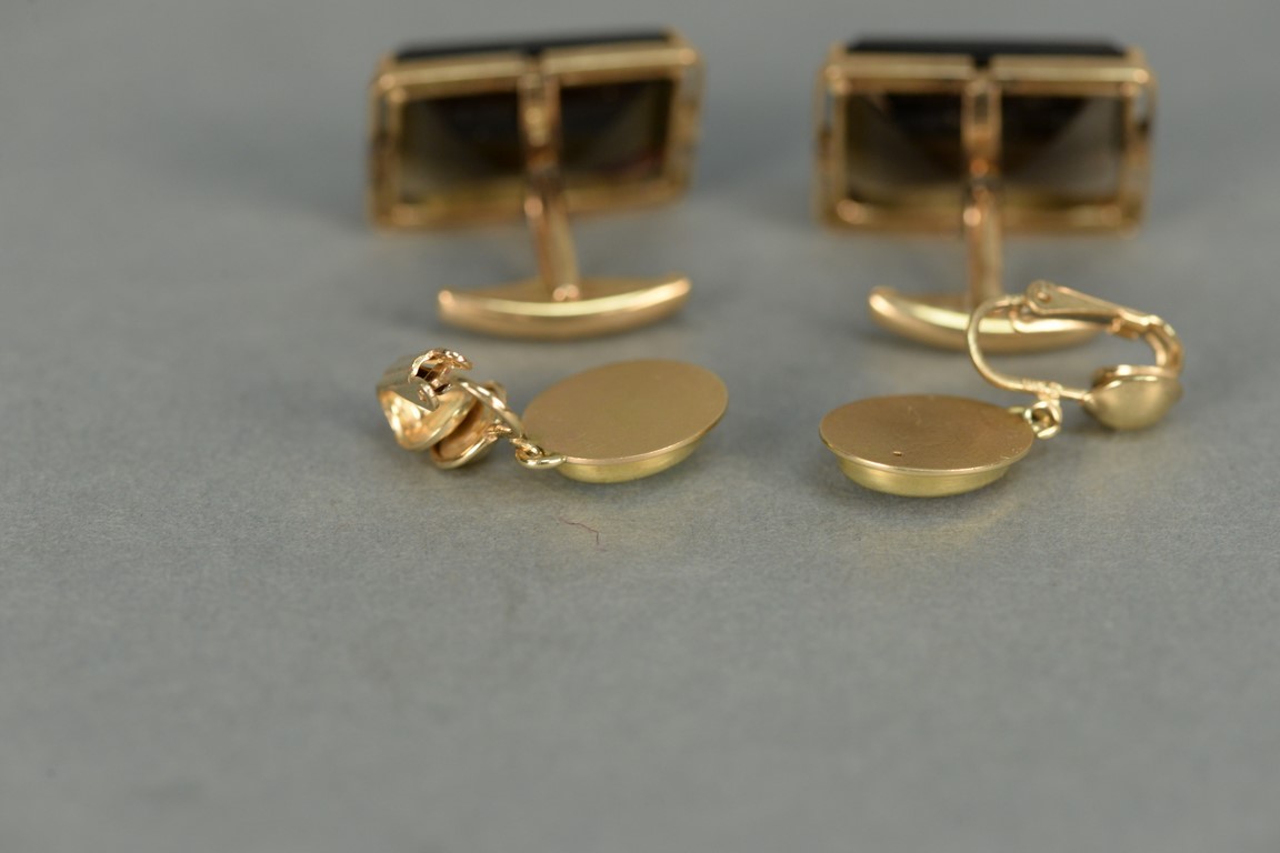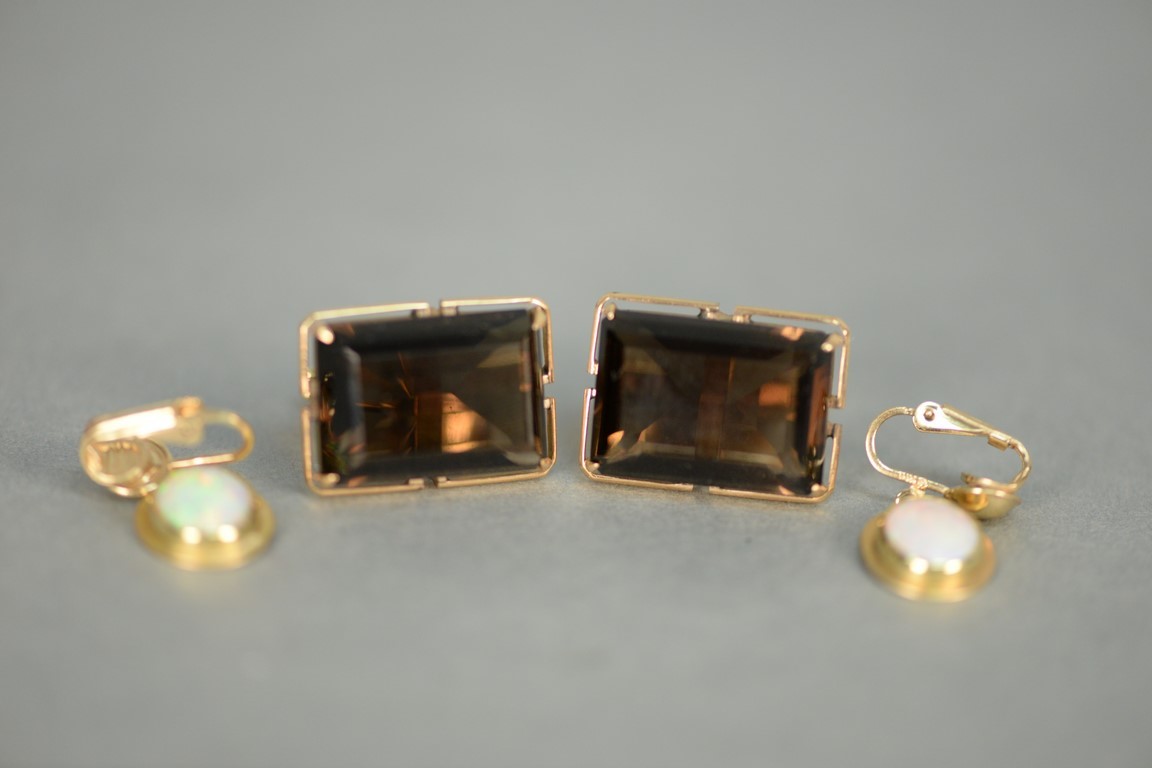 Lot 141: Four piece lot including pair of 14K gold and topaz cuff links and a pair of 14K and opal clip-on earrings.