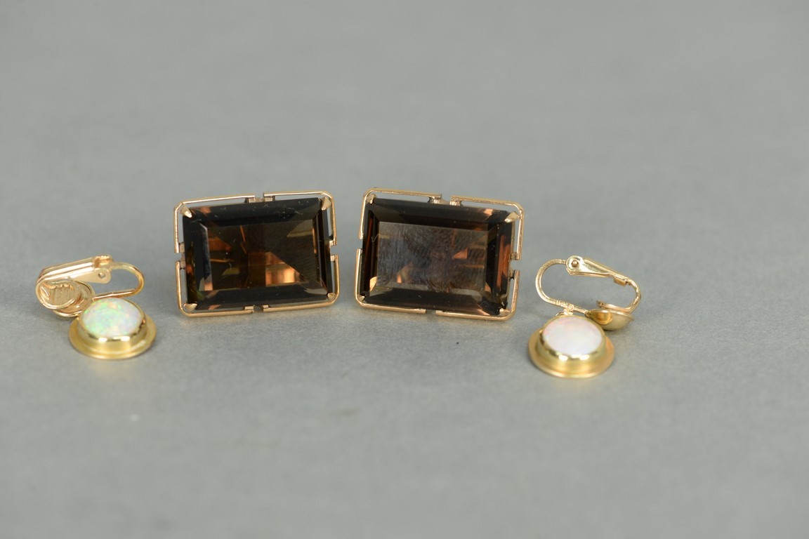 Four piece lot including pair of 14K gold and topaz cuff links and a pair of 14K and opal clip-on earrings.