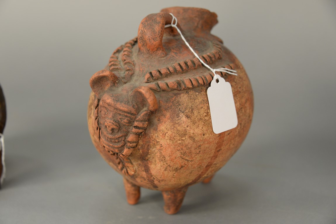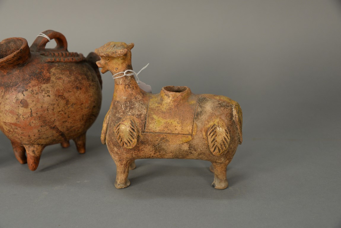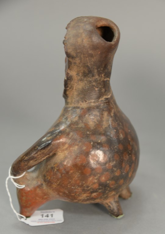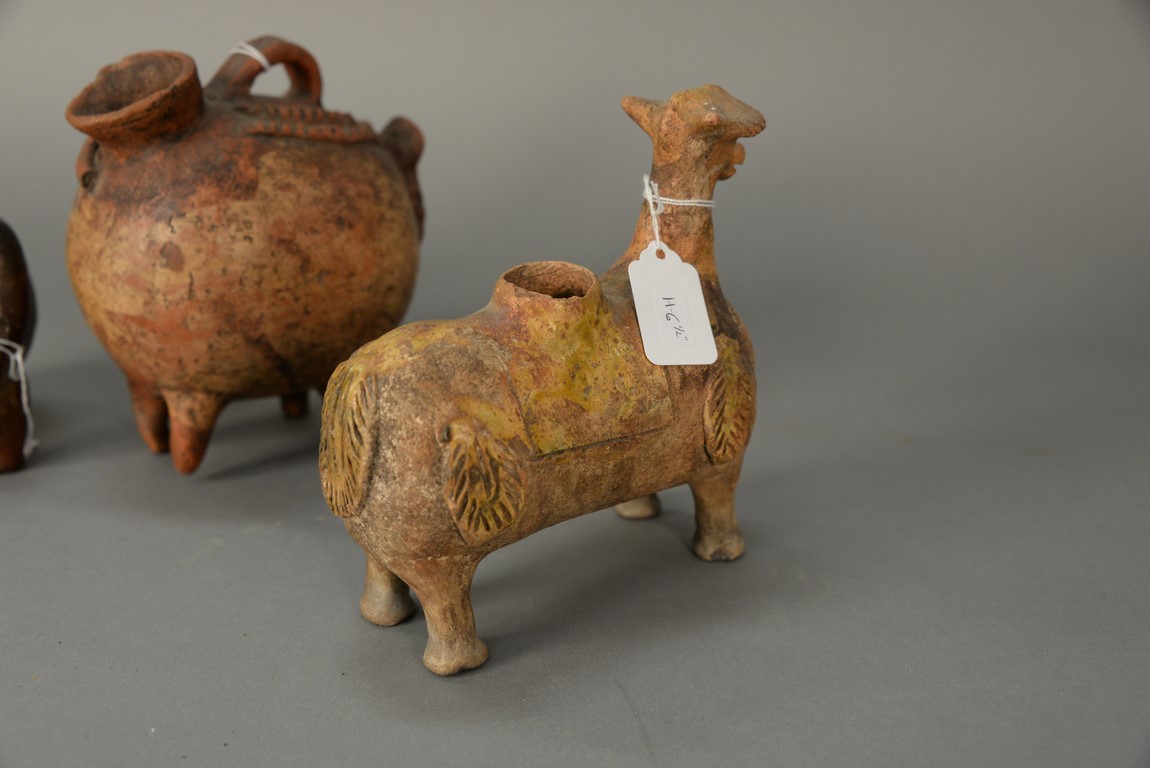 Lot 141: Four piece lot to include a carved mask and three Pre-Columbian and South American pottery vessel figures, one depicting a figure seated with hands on his knees, one having remnants of yellow glaze in the form of a four legged animal, and the last in