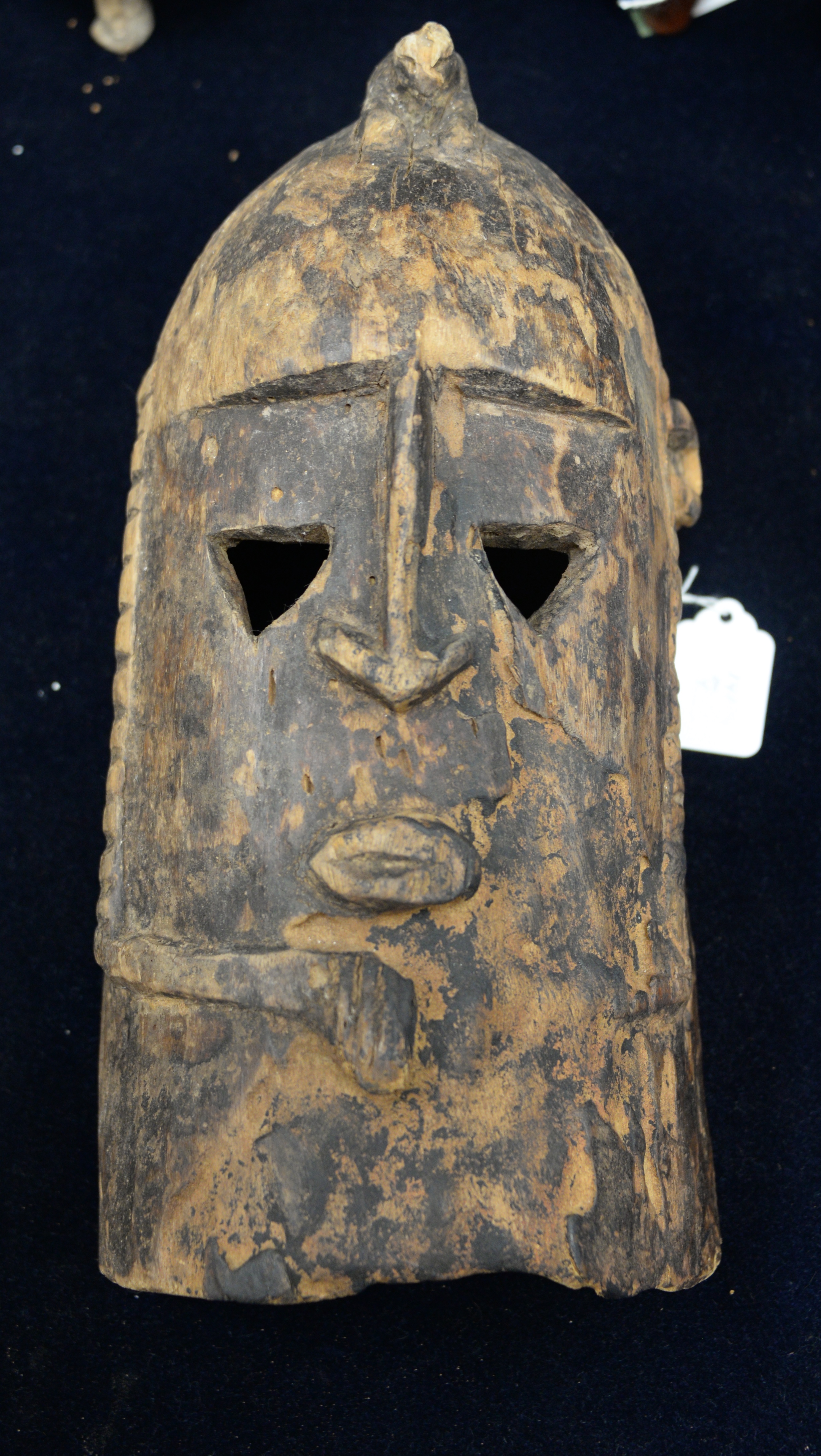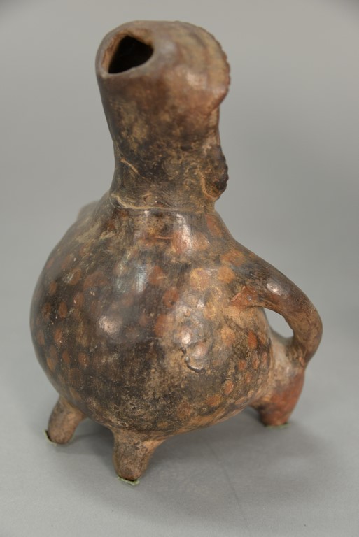 Four piece lot to include a carved mask and three Pre-Columbian and South American pottery vessel figures, one depicting a figure seated with hands on his knees, one having remnants of yellow glaze in the form of a four legged animal, and the last in the form of a bottle with a face. mask: ht. 13 in. vessels: ht. 6 1/2 in., ht. 8 in., and ht. 12 in.