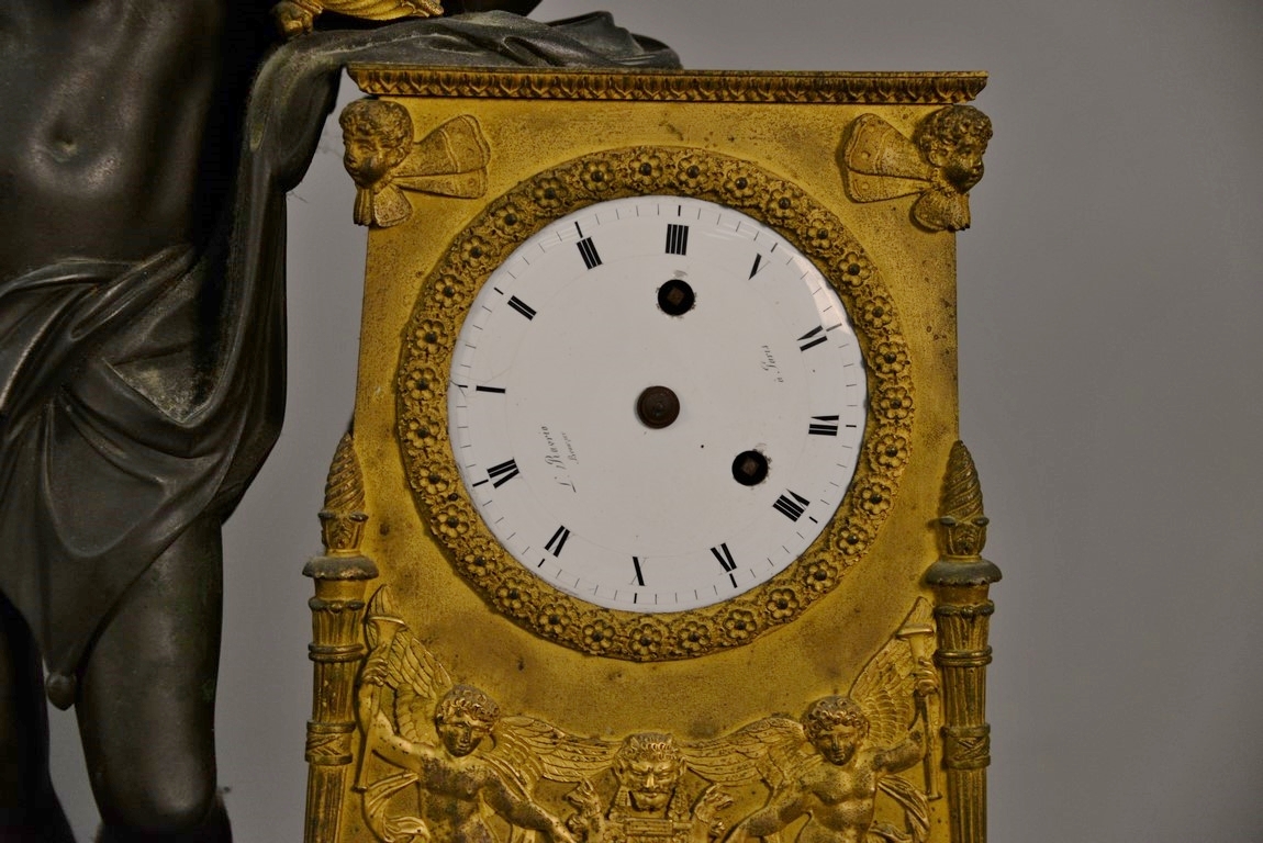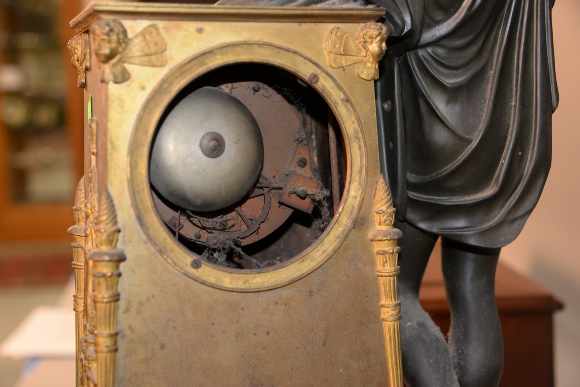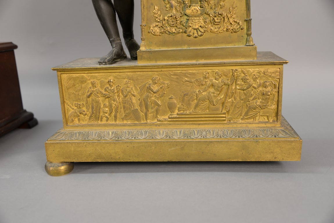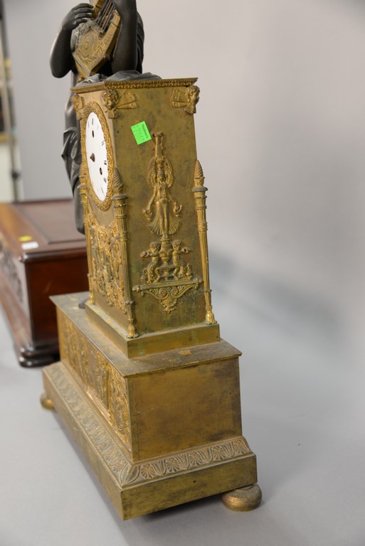 French bronze and gilt bronze clock having Classical bronze figure with gilt bronze harp leaning on gilt bronze super structure with embossed figures all on supressed ball feet, dial marked Paris, 19th century one foot missing, hands missing. ht. 26in. lg. 16in. dp. 6 1/4in.
