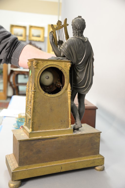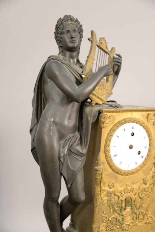 Lot 141: French bronze and gilt bronze clock having Classical bronze figure with gilt bronze harp leaning on gilt bronze super structure with…
