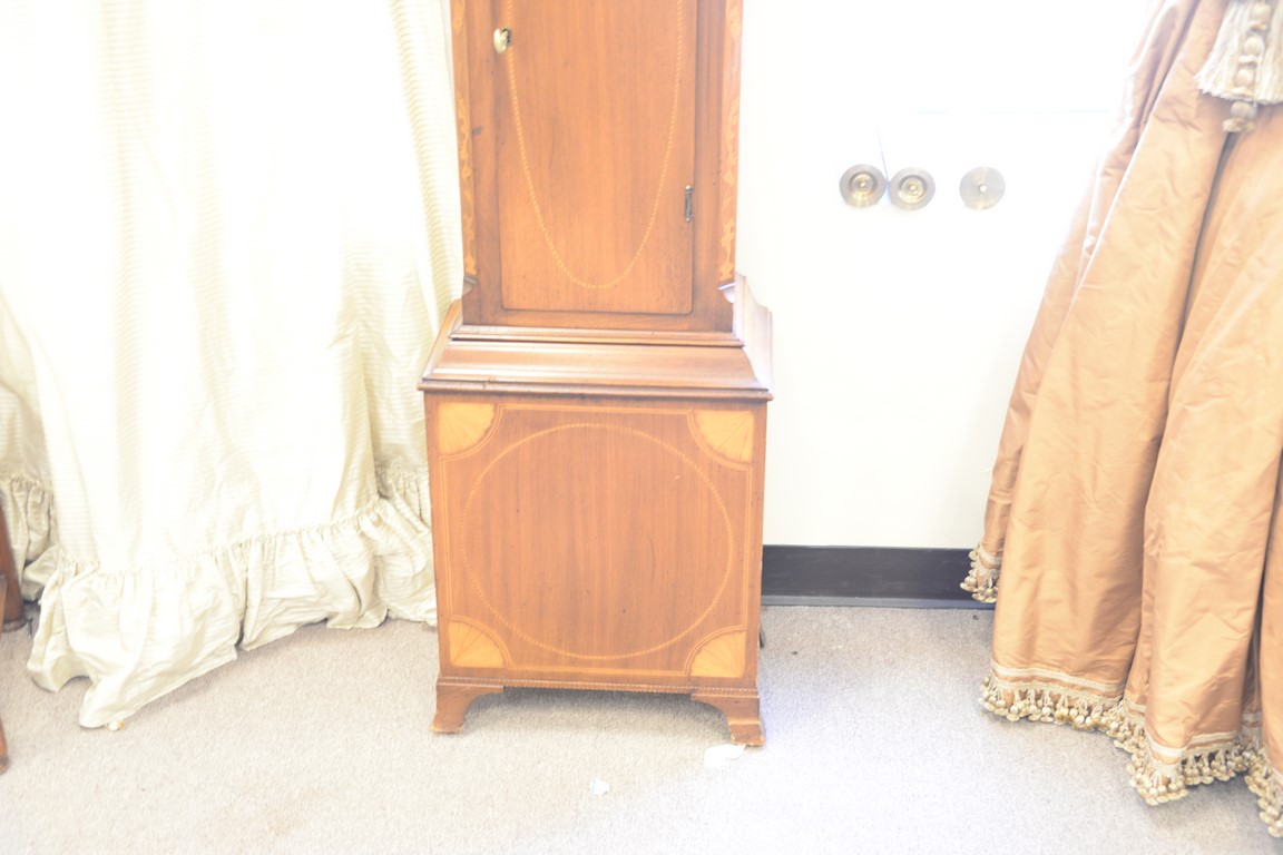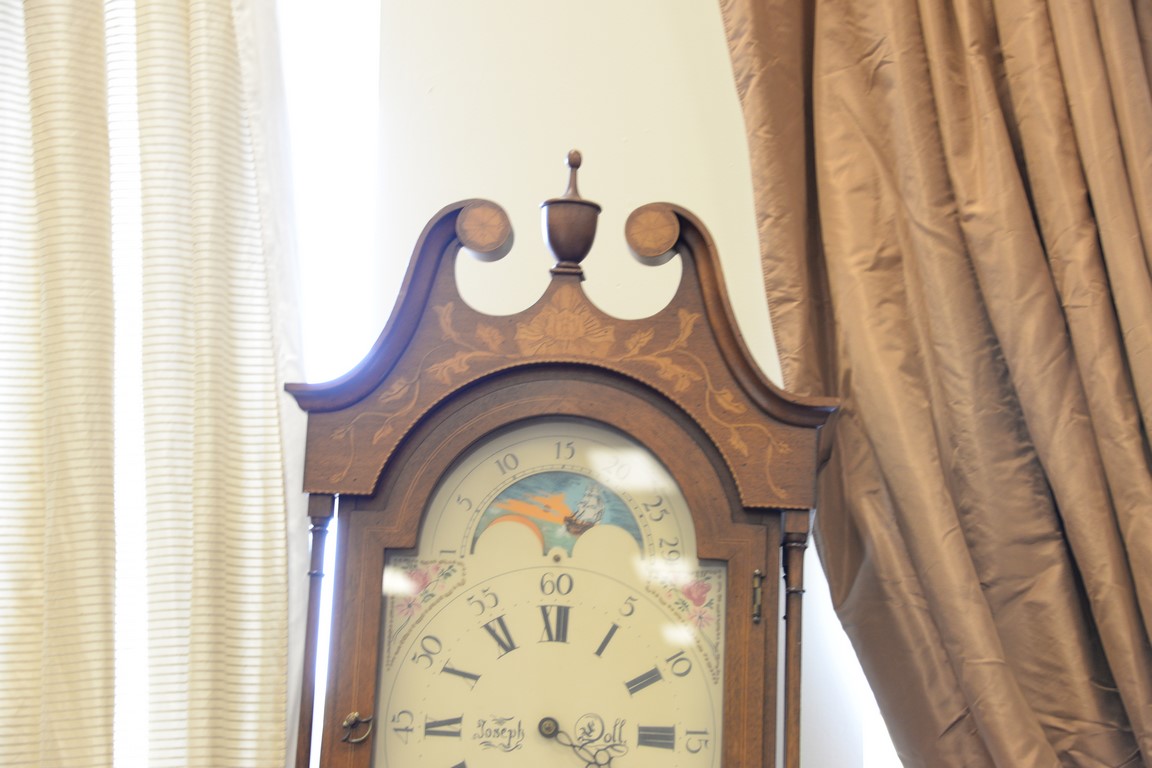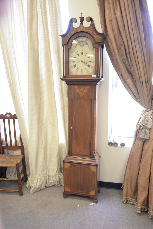 Henry Ford Museum tall case clock with brass works, moon phase dial, and inlaid case, stamped on back. ht. 87in.