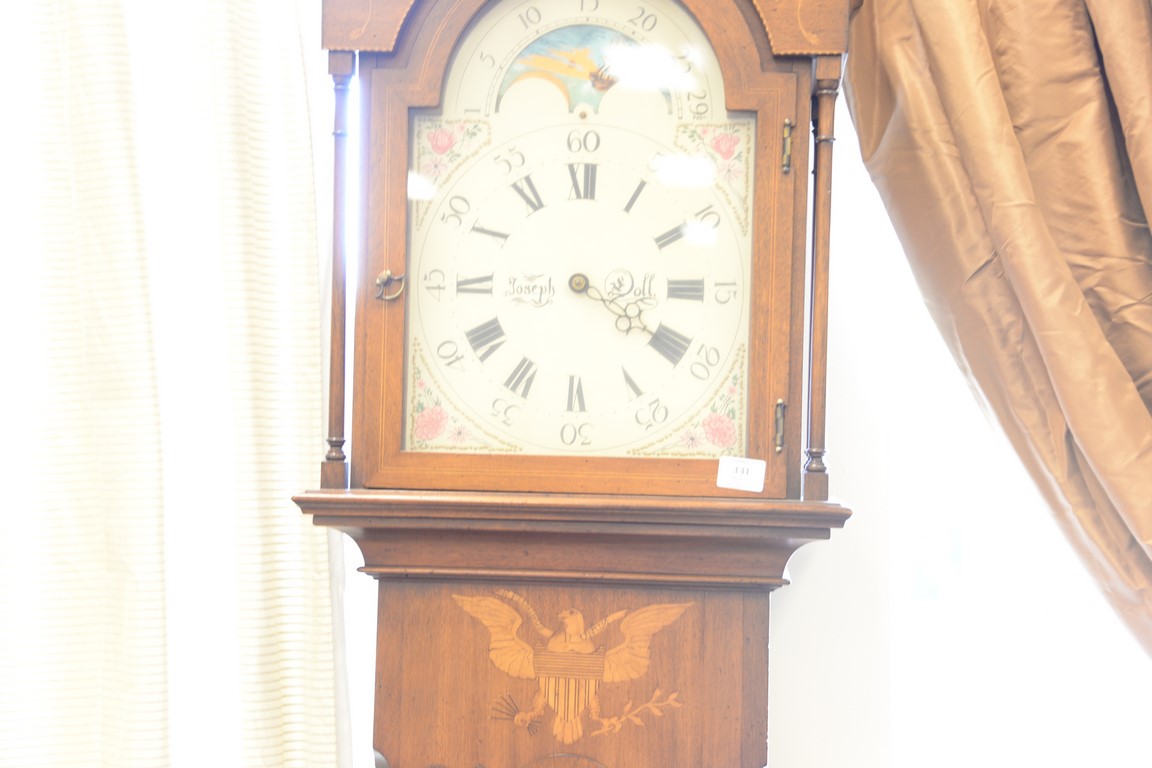 Lot 141: Henry Ford Museum tall case clock with brass works, moon phase dial, and inlaid case, stamped on back. ht. 87in.