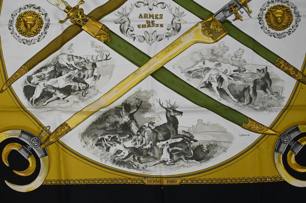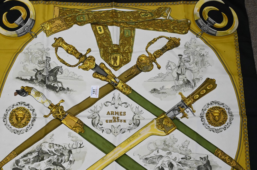 Lot 141: Hermes Paris “Armes De Chasse” Silk Scarf, 33″ x 34″. Provenance: Collections of Norma Reilly, New Jersey.