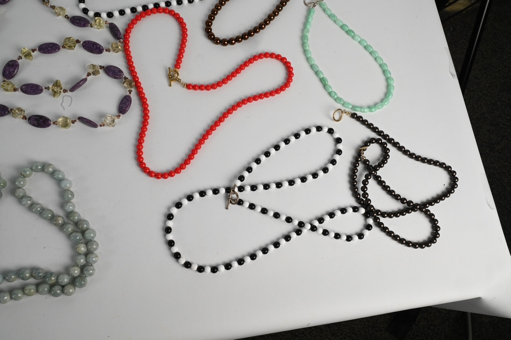 Lot 141: Large Group of Beaded Necklaces, to include large stone, double strand, agate, most having sterling clasps.