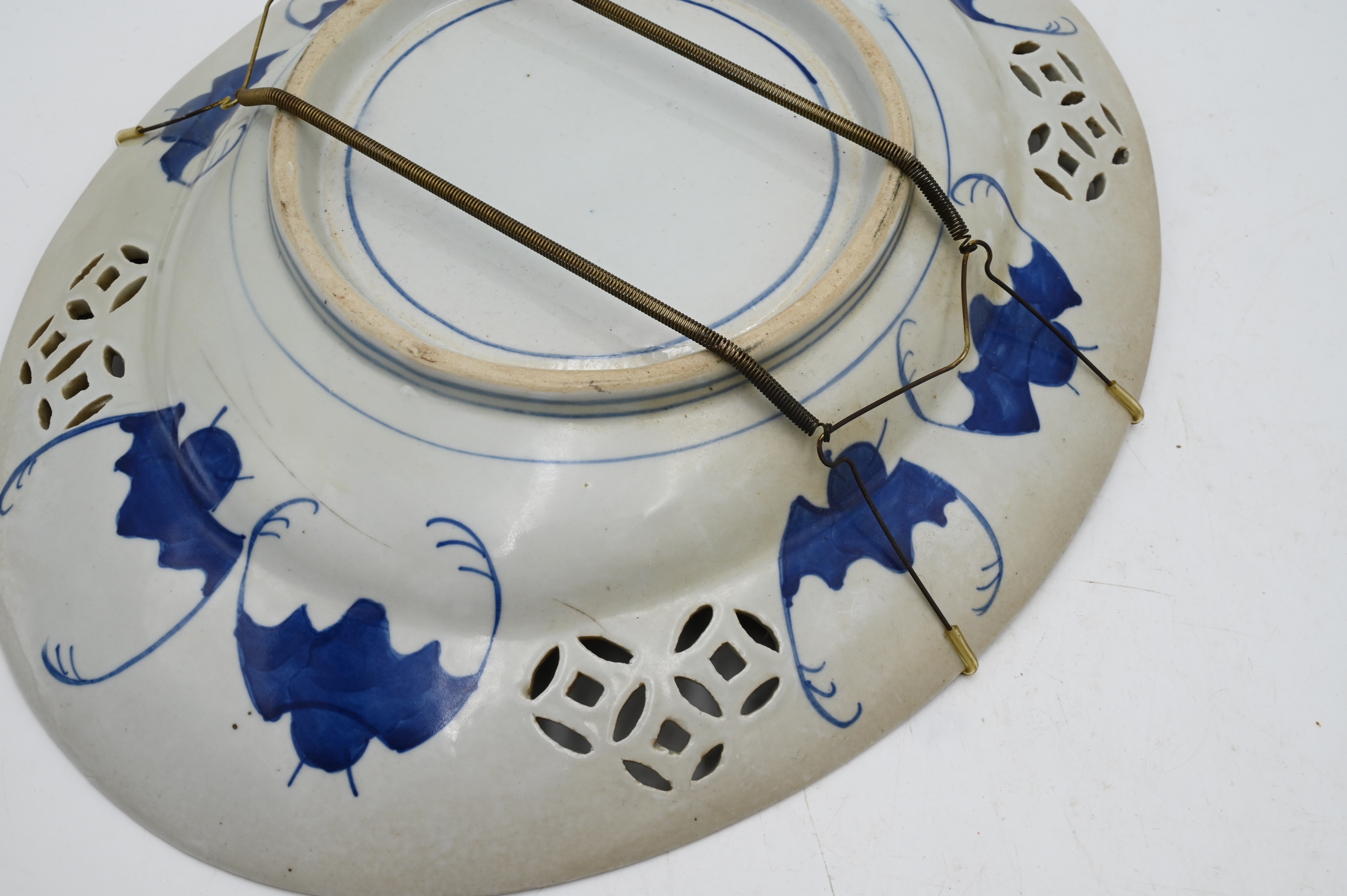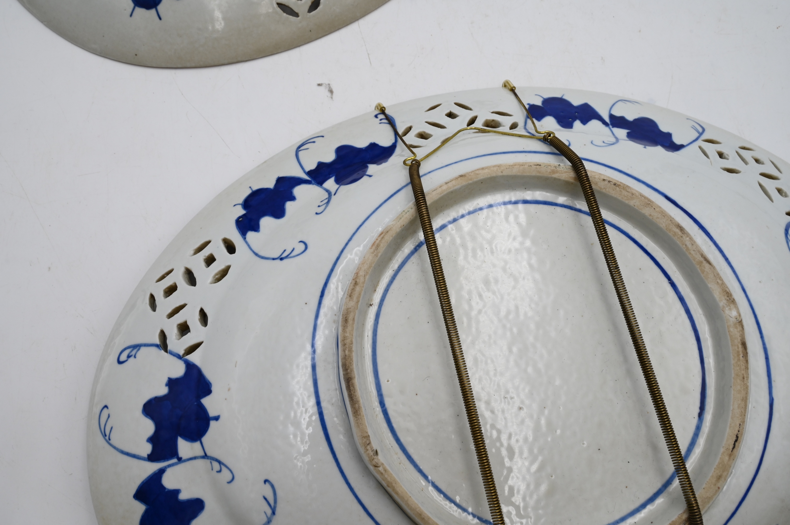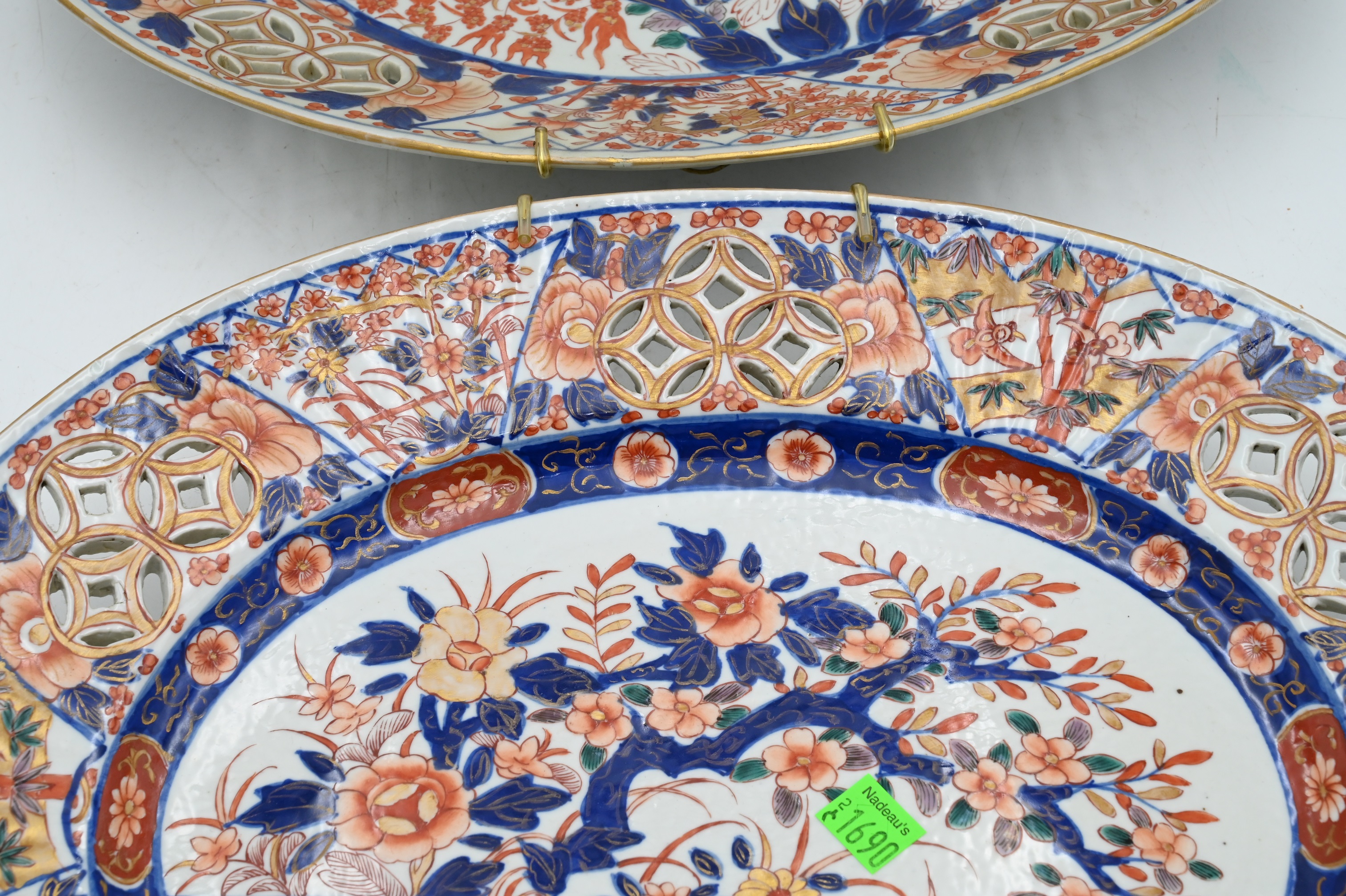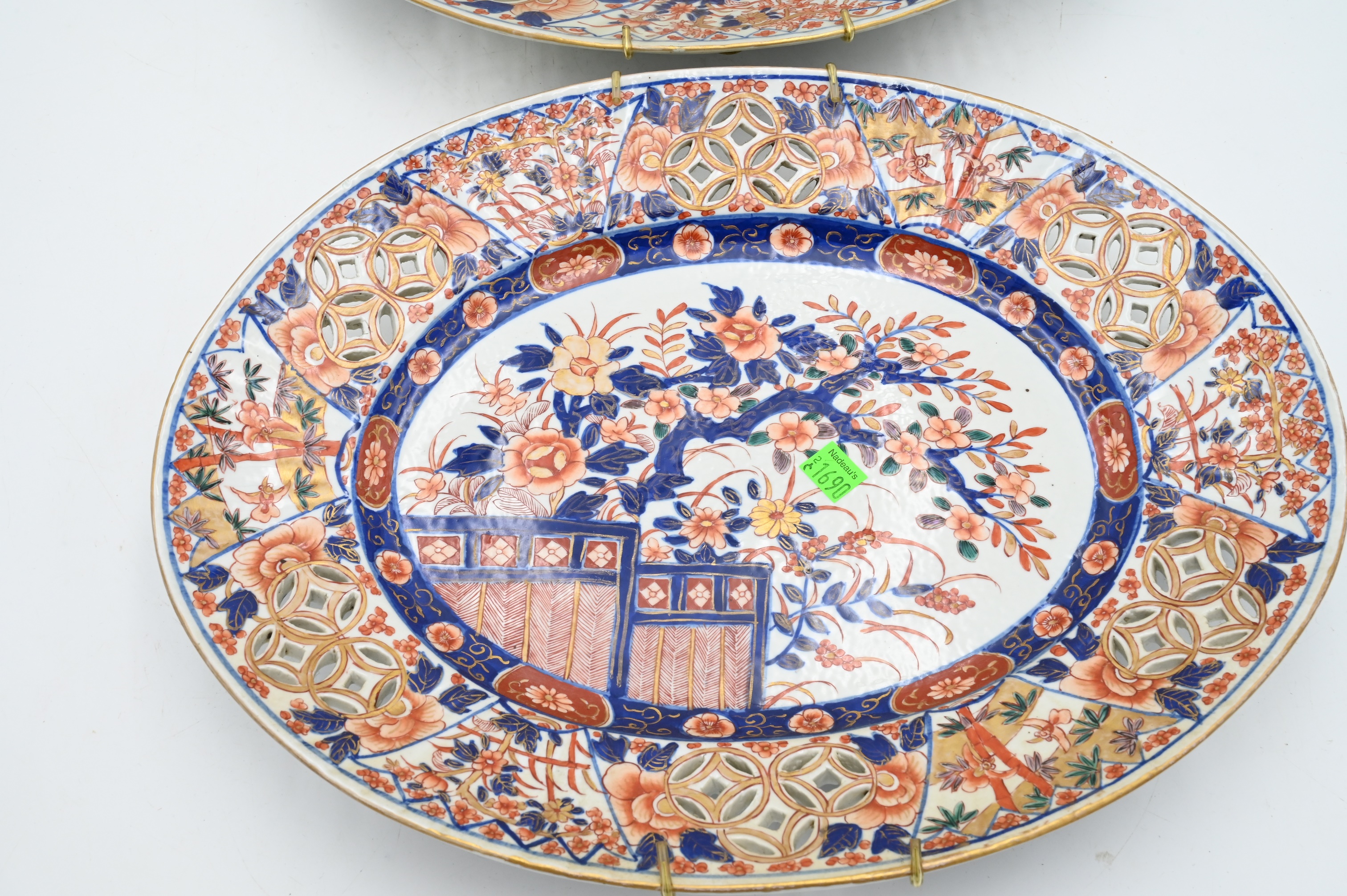 Near Pair of Ovulour 19th Century Japanese Imari Porcelain Chargers, having iron red, gold, blue, and green enamelling, pierced, length 16 inches.