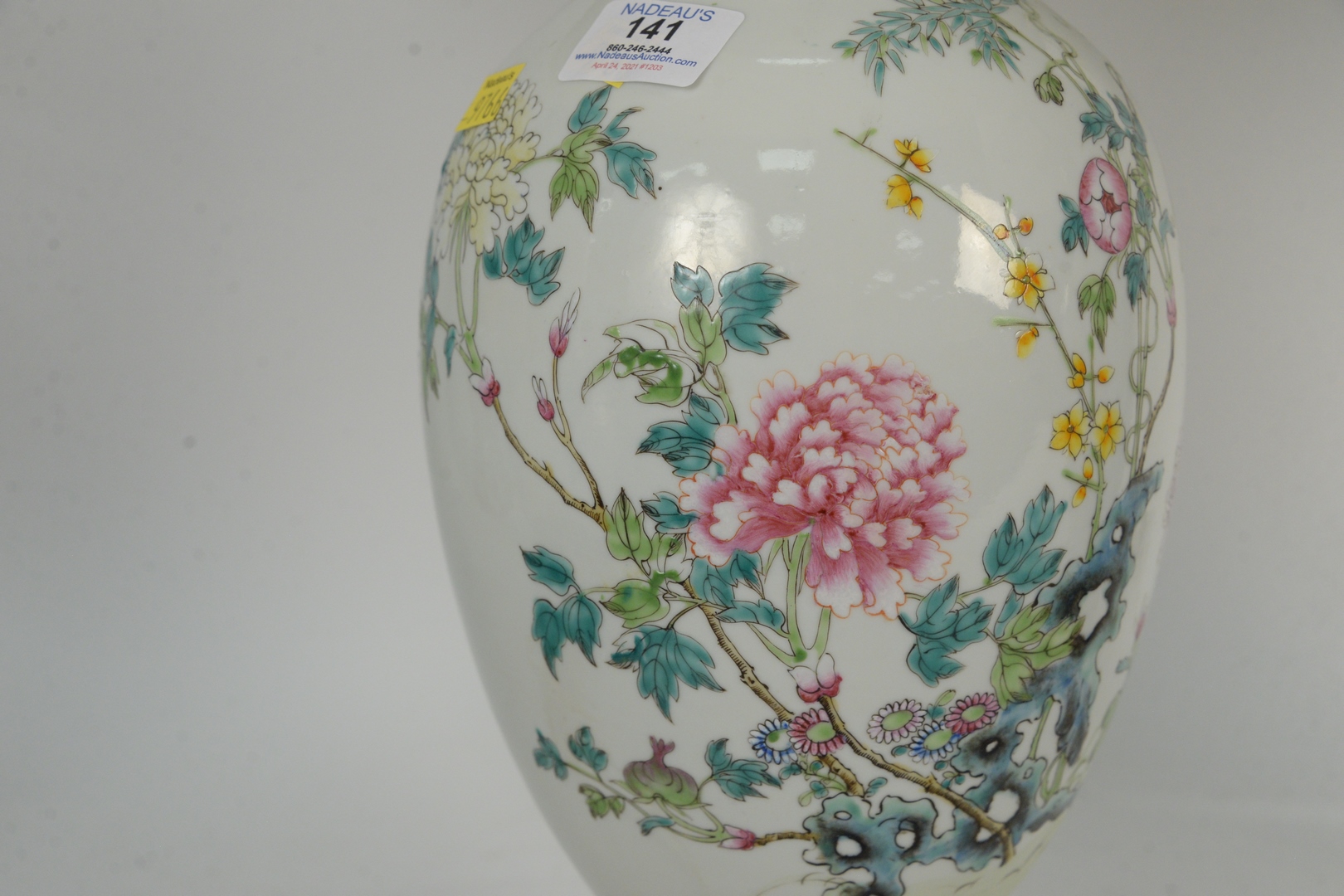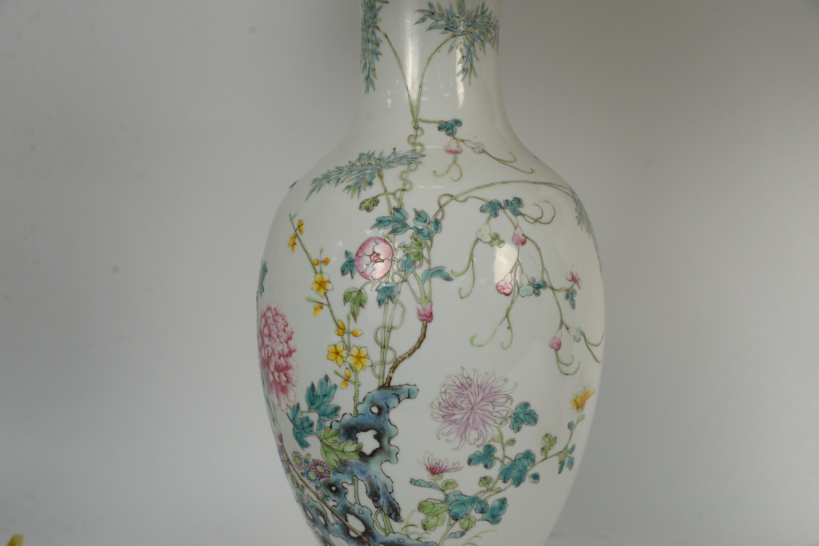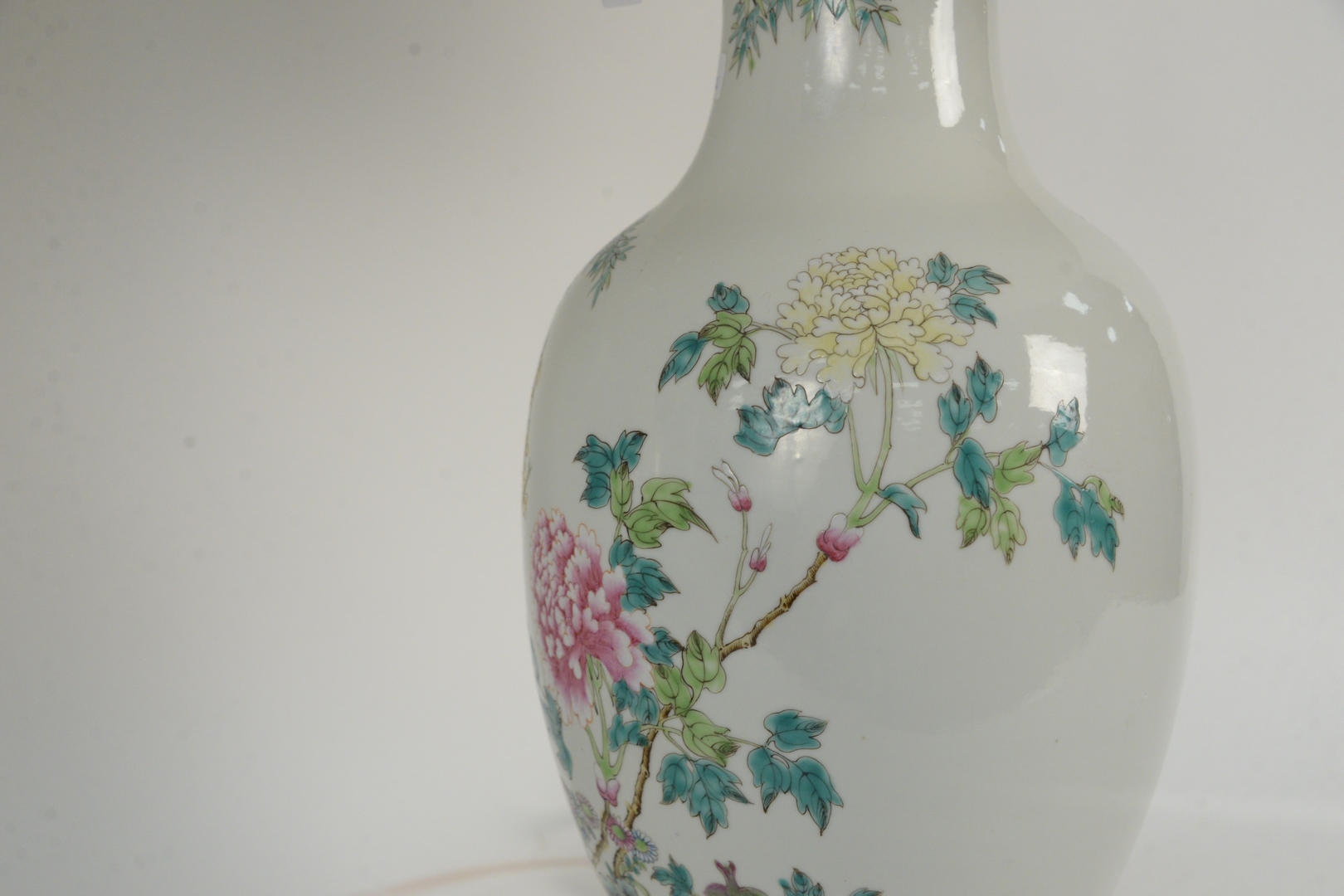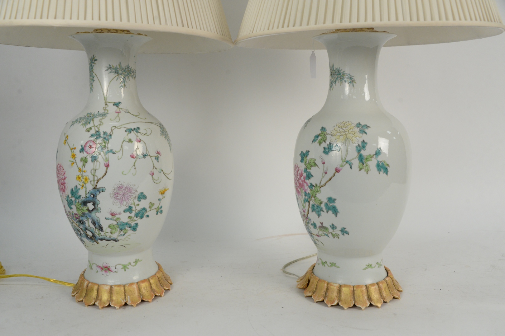 Lot 141: Pair of Chinese Famille Rose Vases mounted as lamps, having painted chrysanthemum and rockery, Republic Period, vase height 17 inches.
