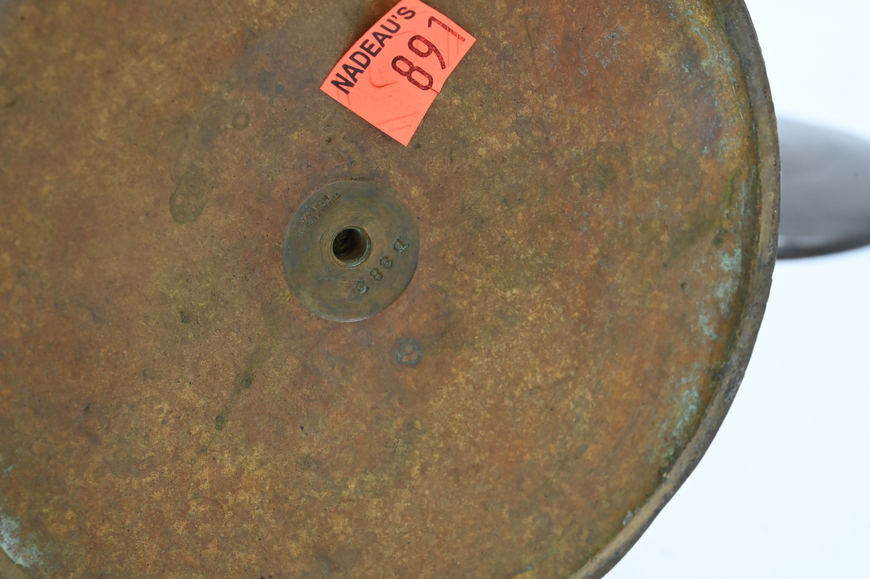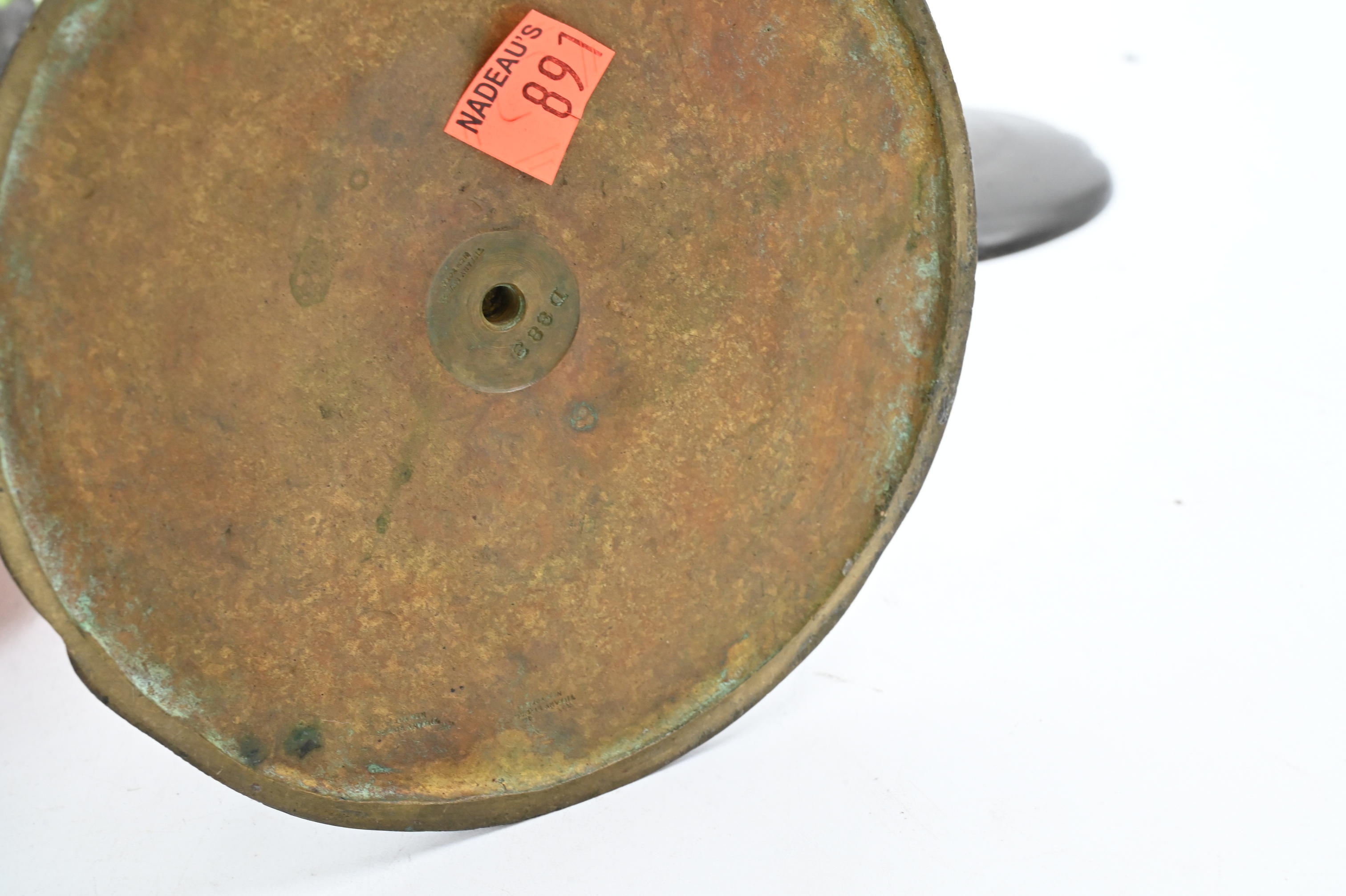 dark brown and green patinated bronze base surmounted by reticulated green blown glass insert, one marked Tiffany Studios New York D883, the other marked 2146, circa 1900