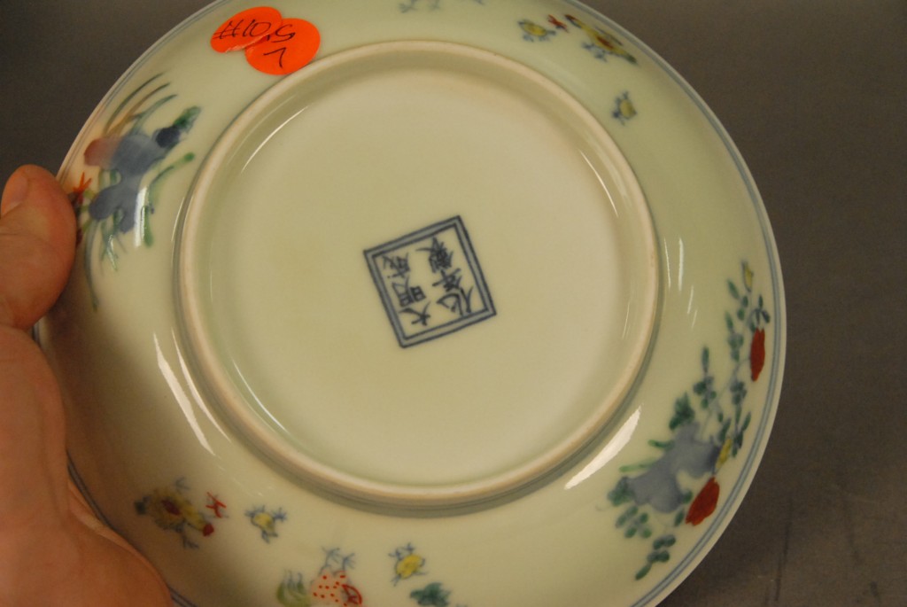 Porcelain plate with painted roosters and chickens marked on bottom, dia. 7 1/2.
