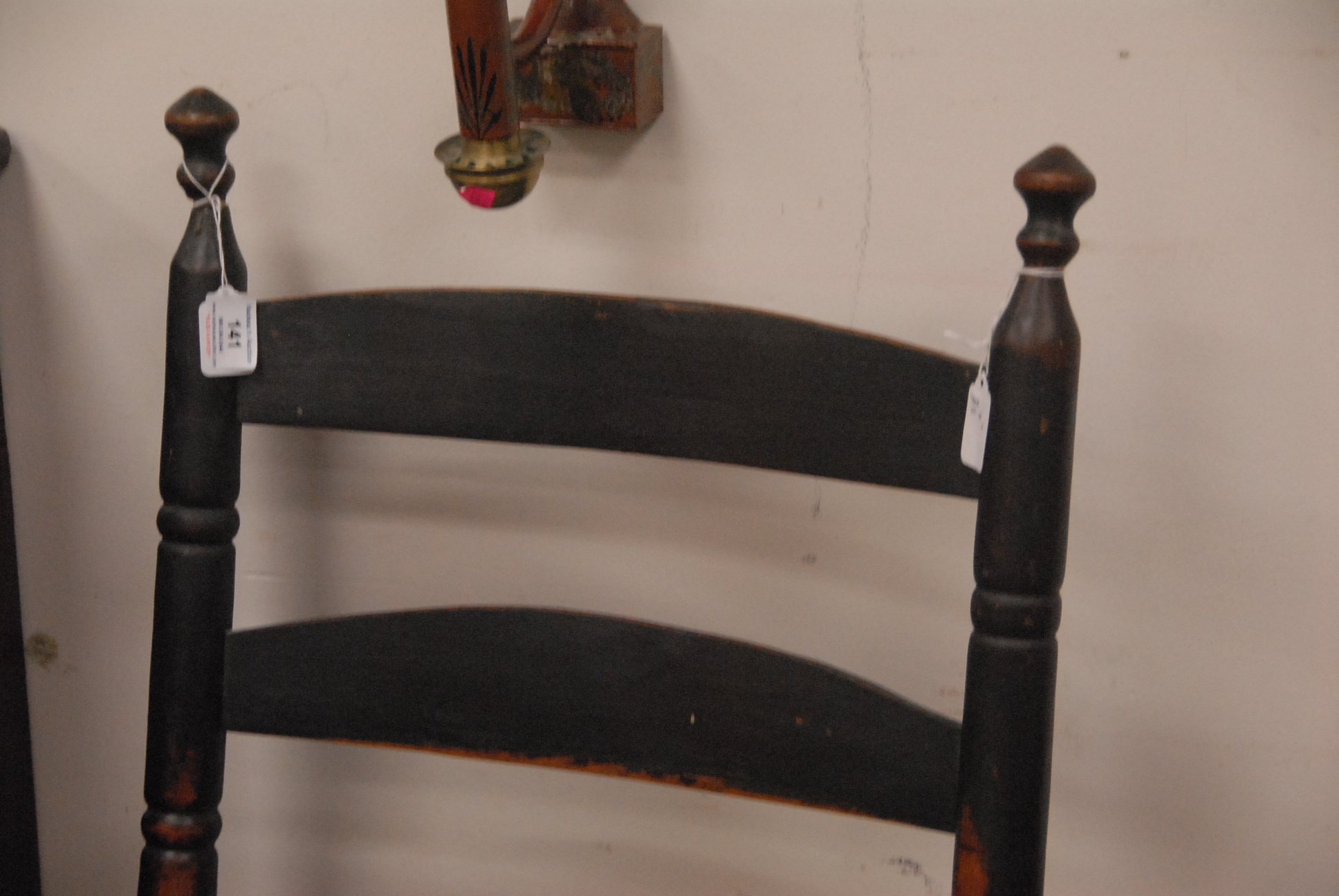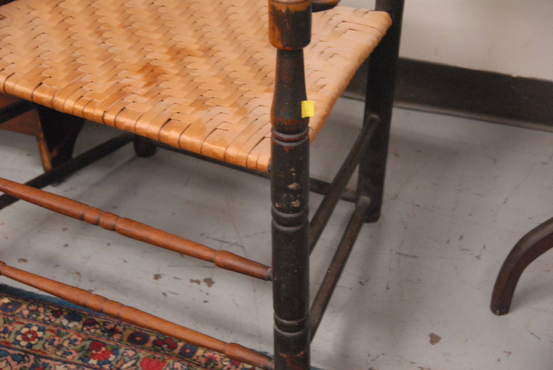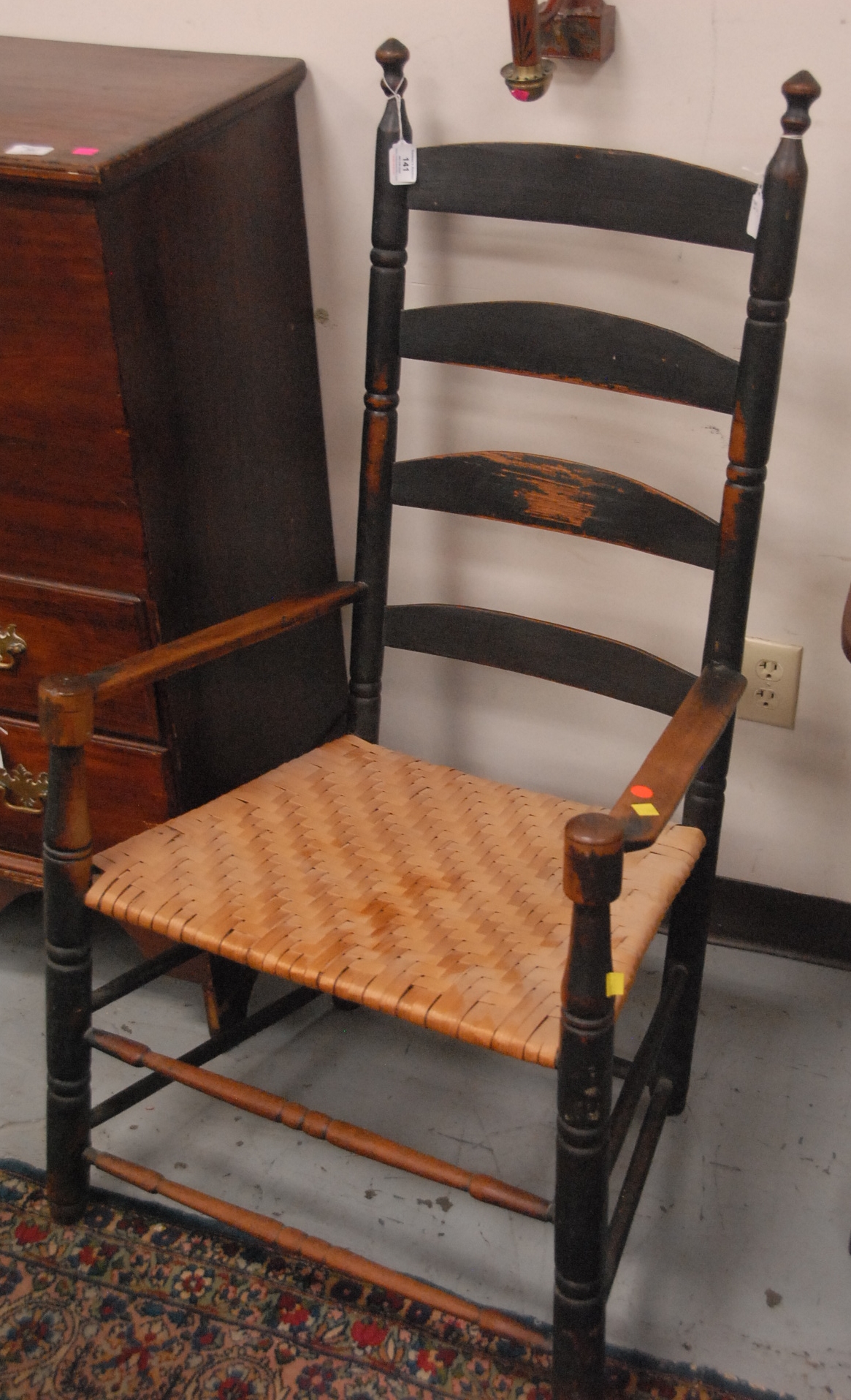 Lot 141: Primitive ladderback great chair, front legs ended out. ht. 41 1/2 in. seat ht. 16 in. Provenance: Property from The Estate of Margaret Oliphant of Old Lyme, Connecticut