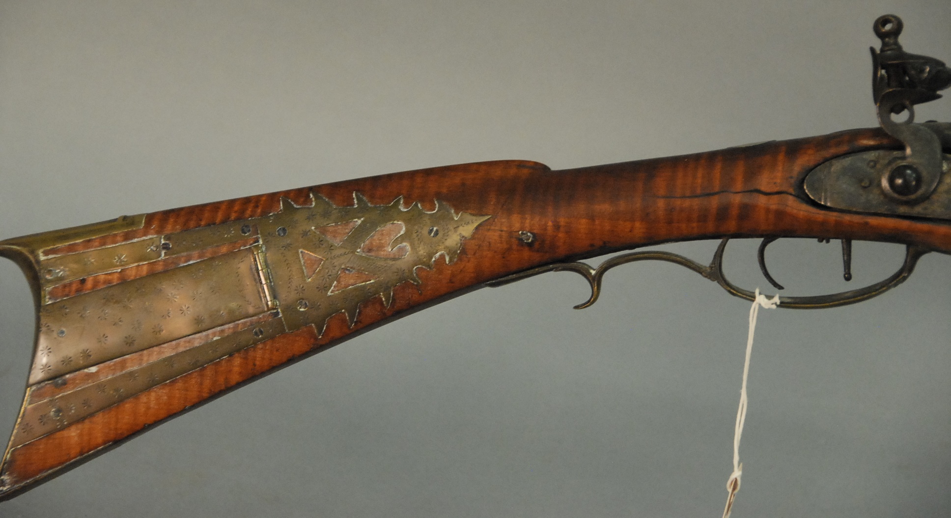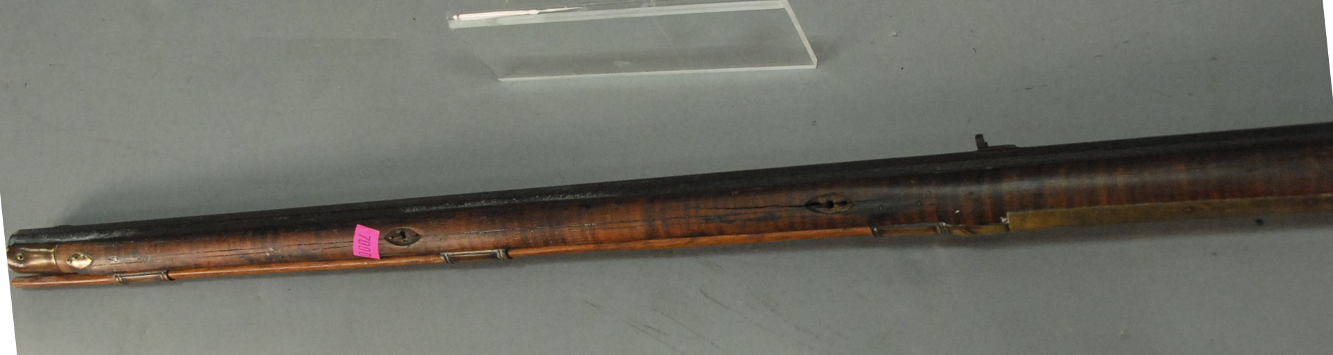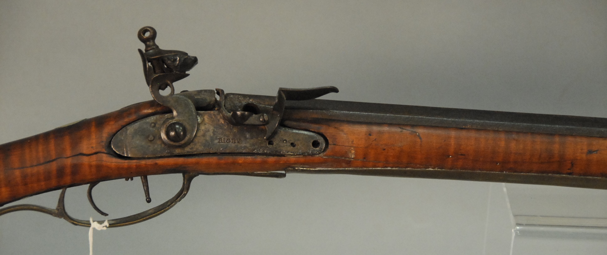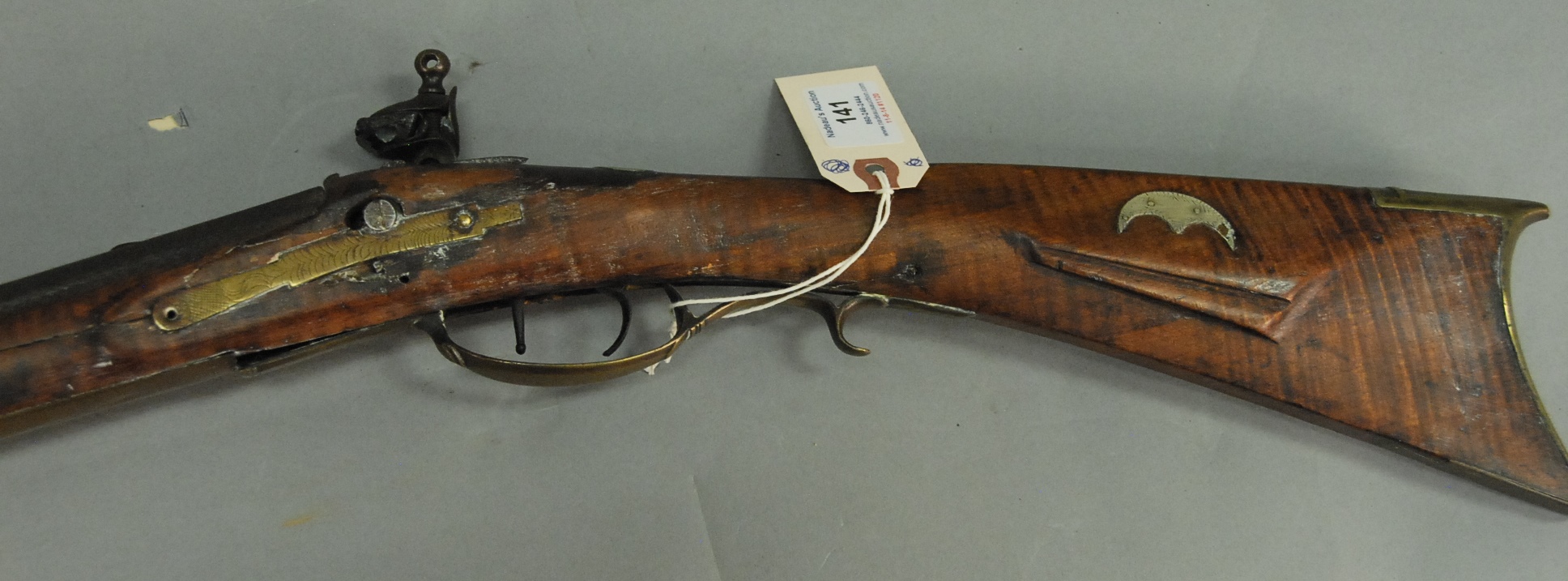 Lot 141: Rigby Kentucky long flint lock rifle with tiger maple stock and brass patch box, total lg. 52.